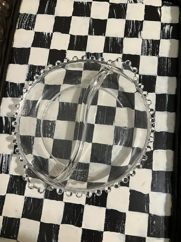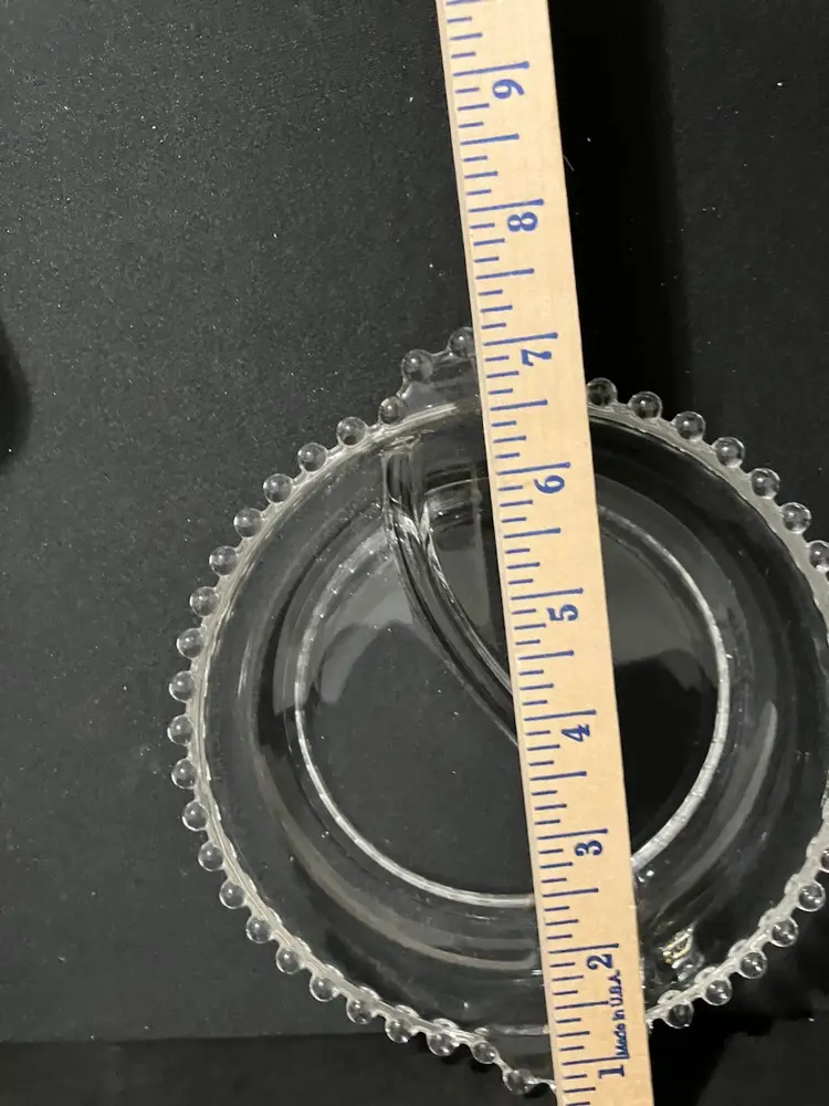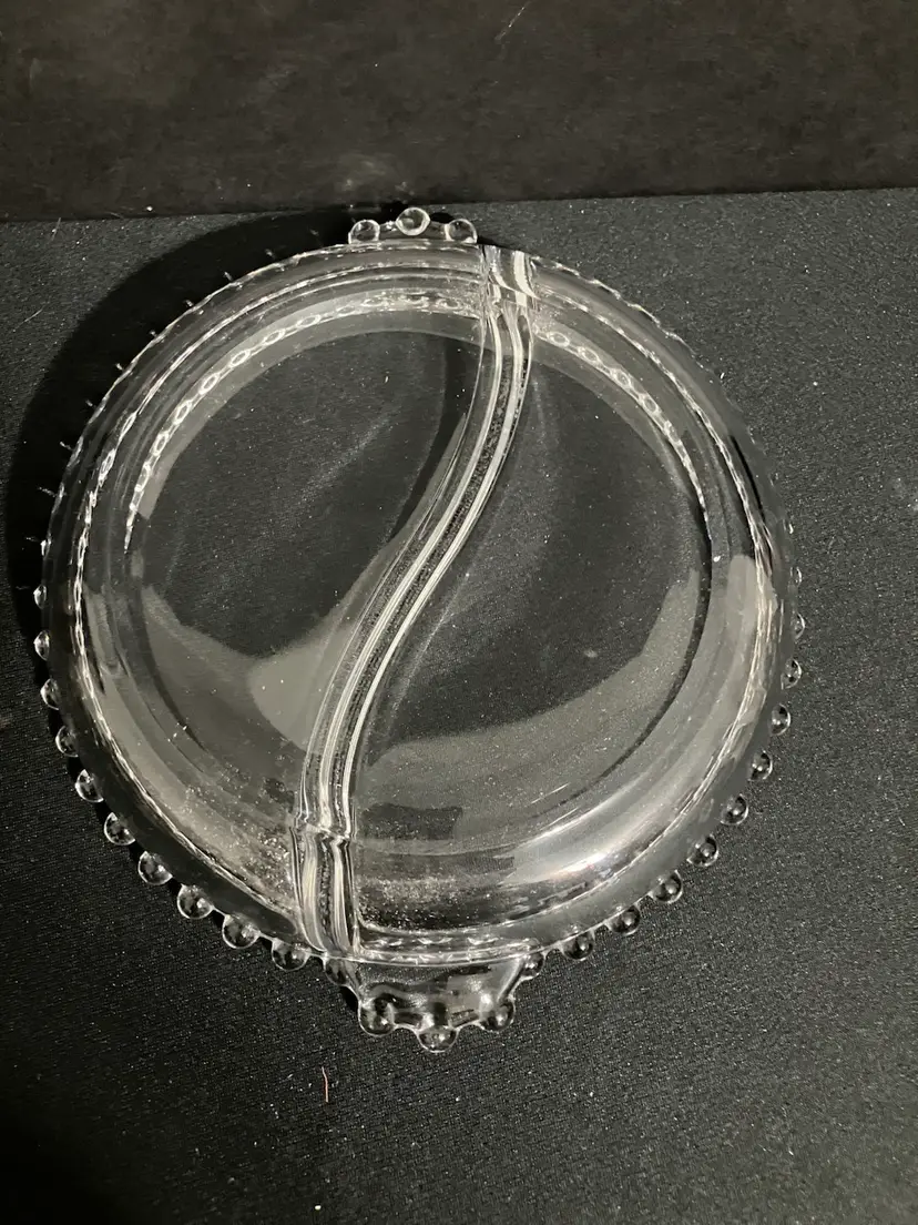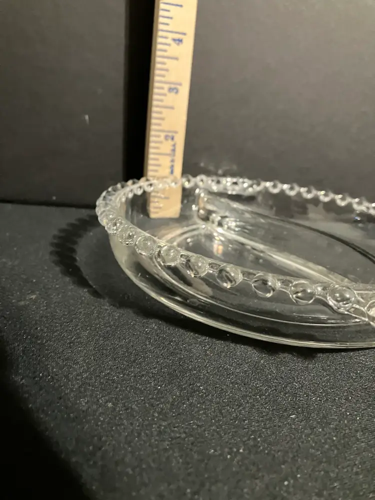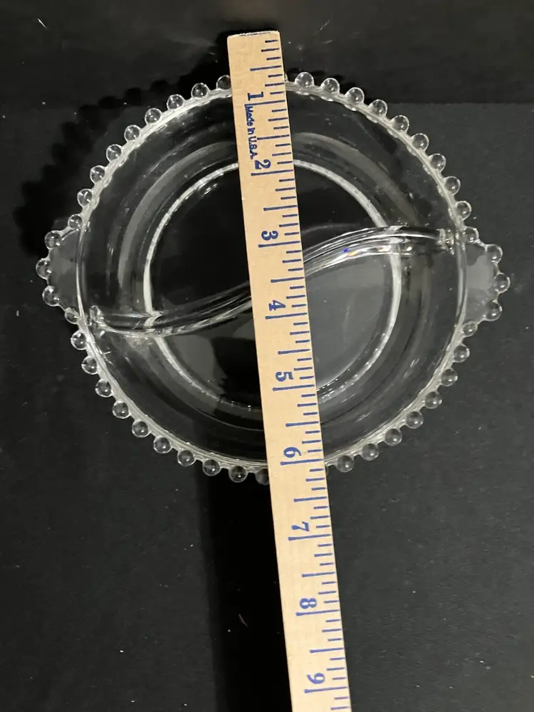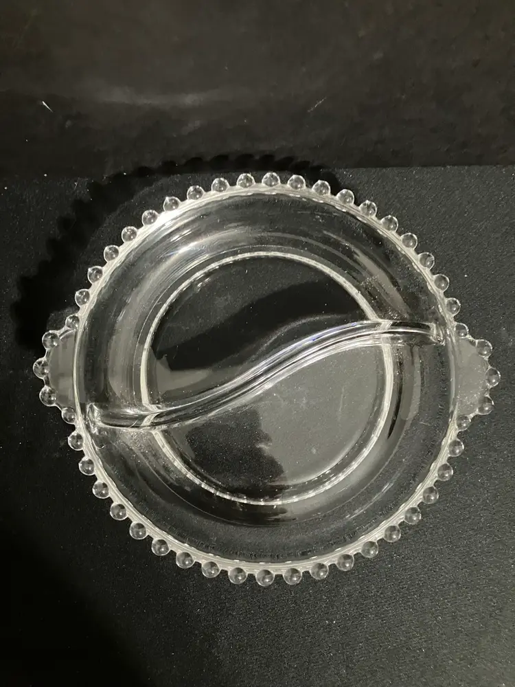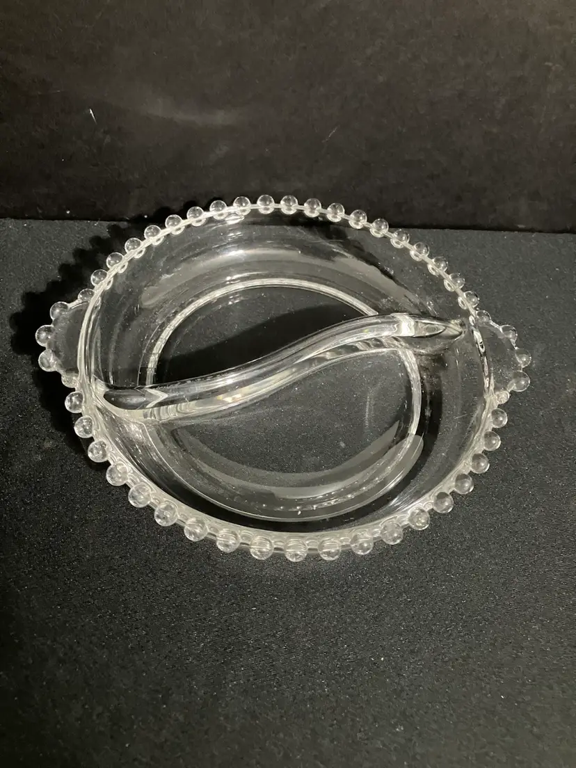 Vintage candlewick (small glass marbles around perimeter) clear glass divided pickle dish with wavy divide - approximately 6” across (7” including handles) & 1” high - see photos (All Sales Final: Should an exception be made, all packaging is required)
