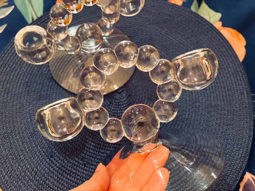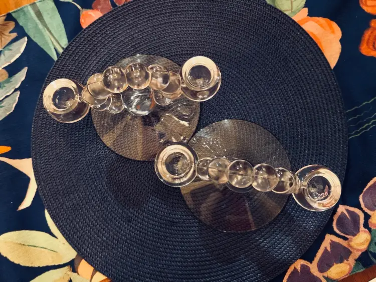 Candlewick double candle stick holders. Pair of two (2). Approx 6.5W X 5H. Each holder weighs 1b 3.6oz. Tiny chip on the underside of one base (pictured). Beautifully reflect light. Would be perfect for entertaining or as a gift.