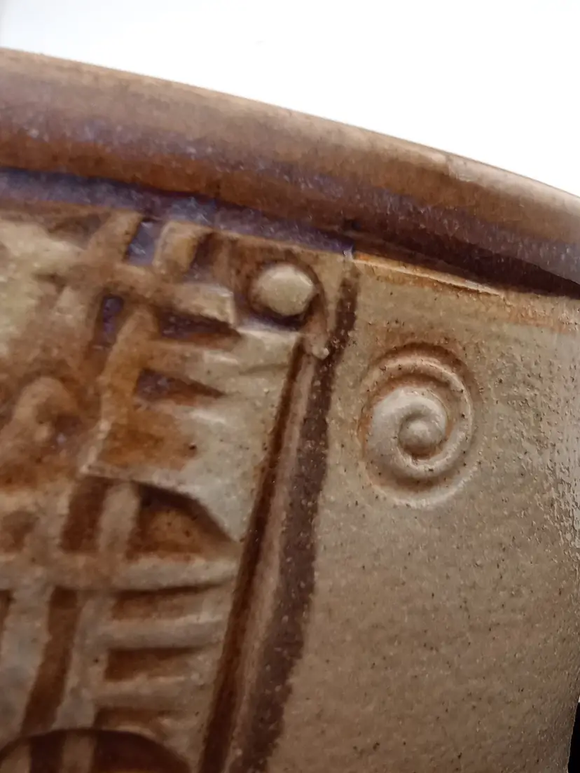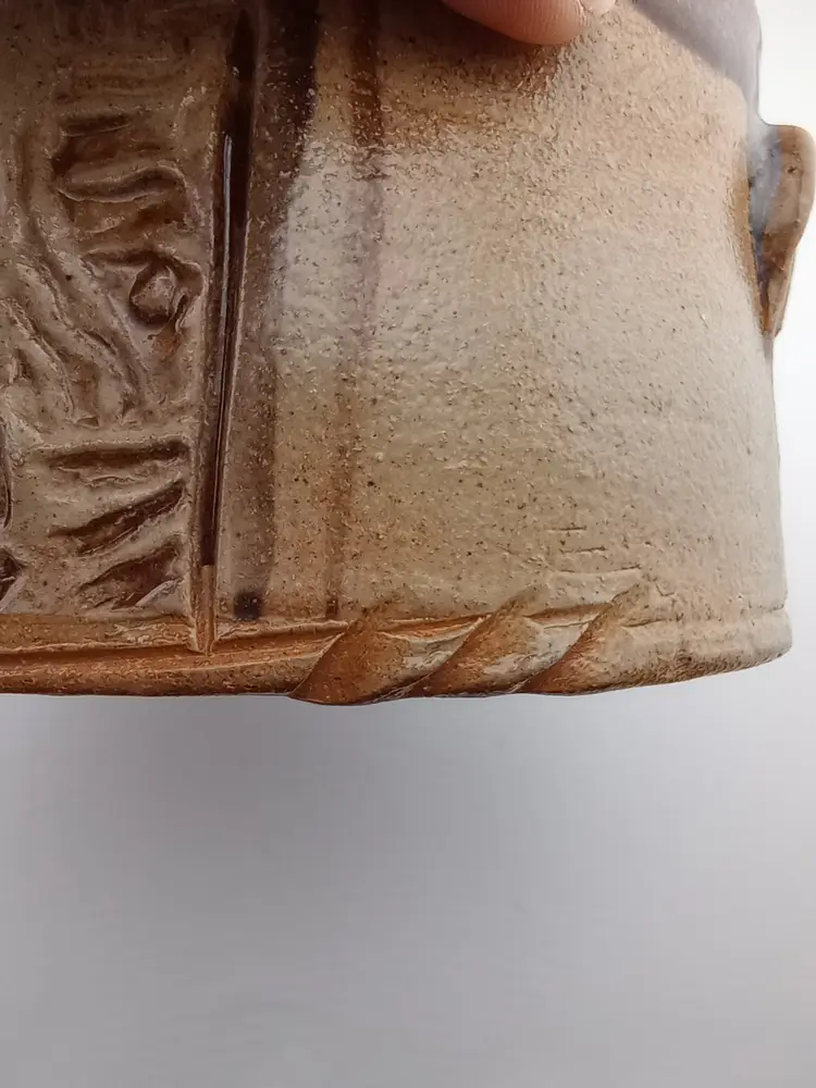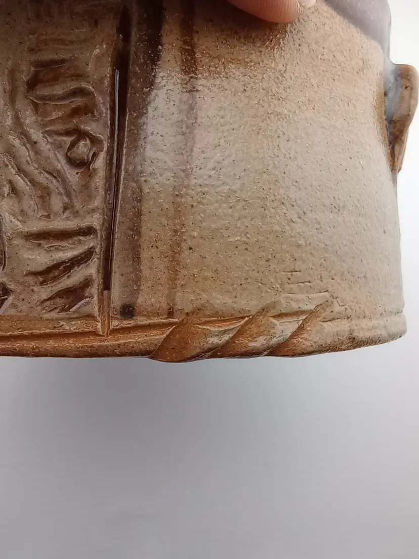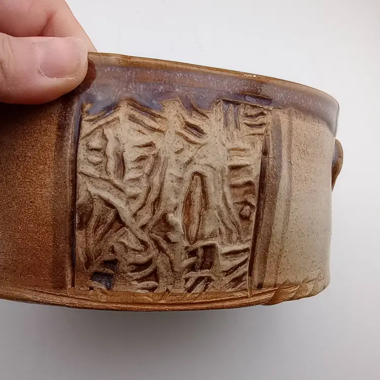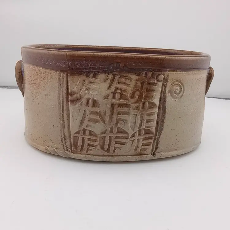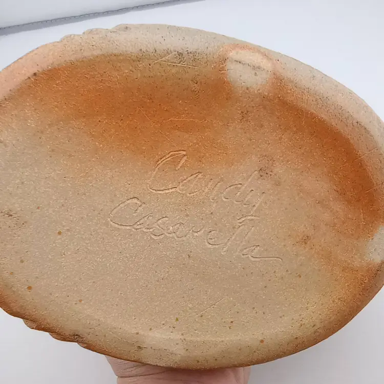 This is a beautiful piece of pottery by Candy Cassarella. Though it would make a great planter, it hasn't been used for that purpose and could hold fruit on the kitchen counter, office supplies on the desk, or remotes on the coffee table. It's 7." by 4.5" by 3.5" and in excellent condition with no chips or cracks.