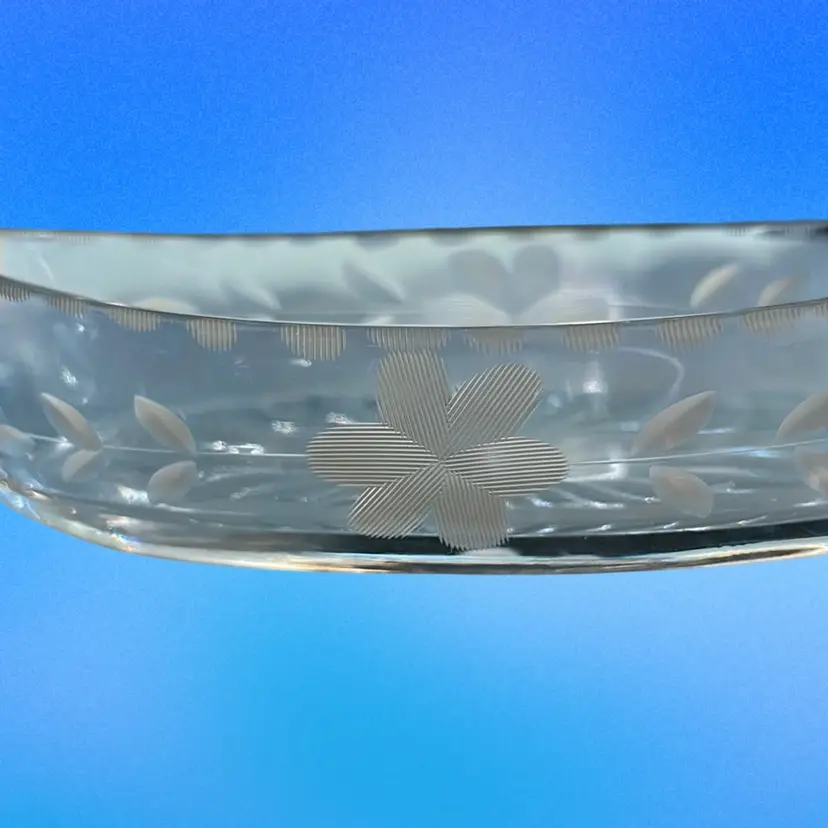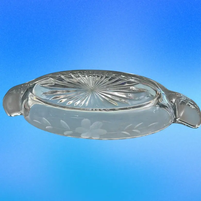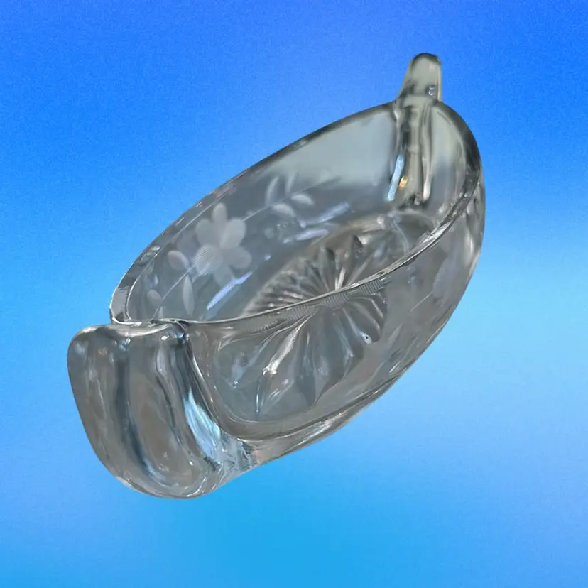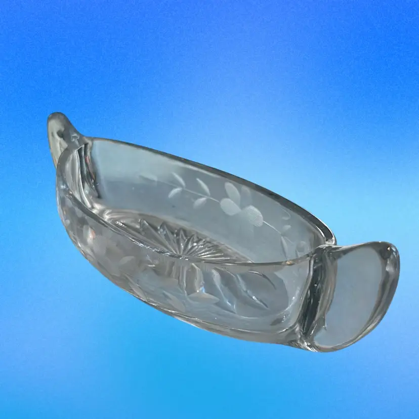 Dishes like these are often used for relish, pickles, or candies, featuring delicate etched floral designs on its sides. Distinctive oblong boat or canoe shape with two handles. Clear glass with etched or cut floral motifs on both sides. Often dates back to the early 1900s, though similar styles were produced later. There are a couple very minor nicks along the rim on one side. I could not capture those nicks in my photos. It measures approximately 9 inches long and 3 inches wide.