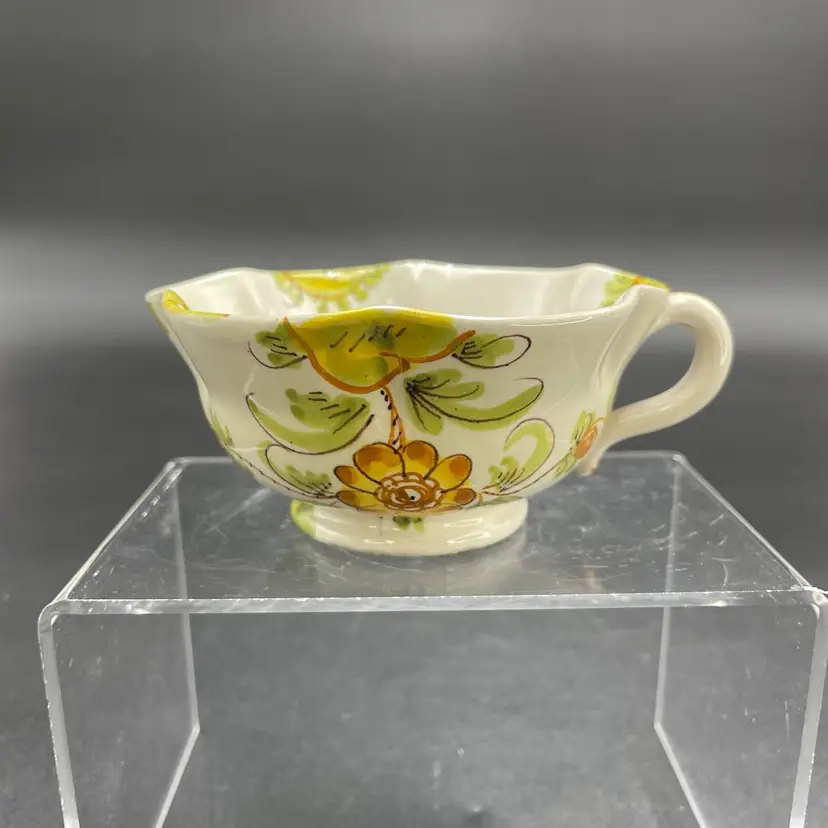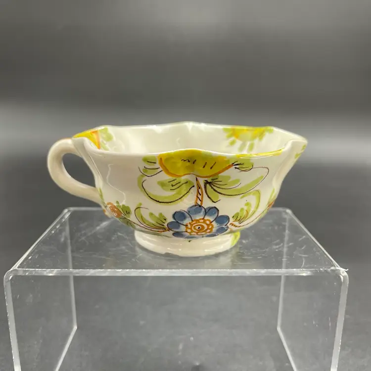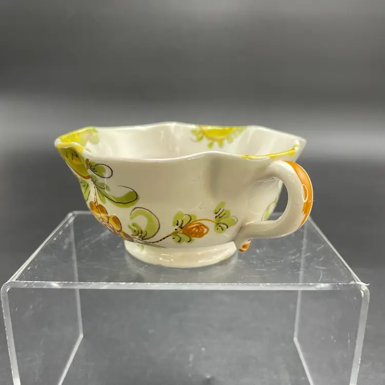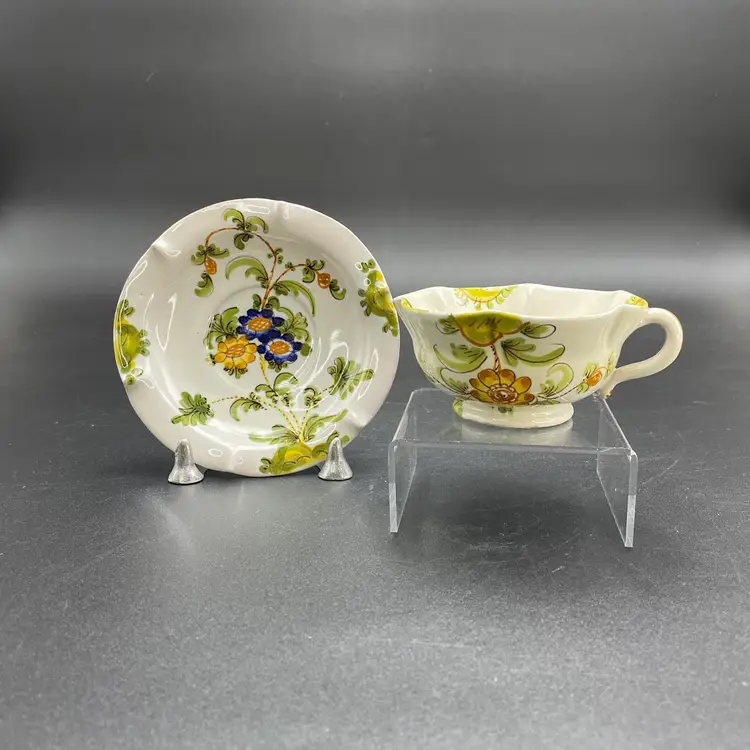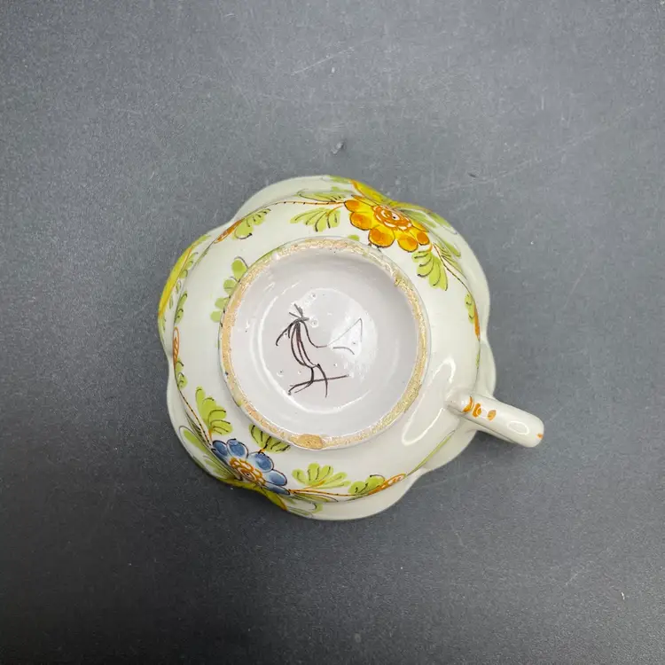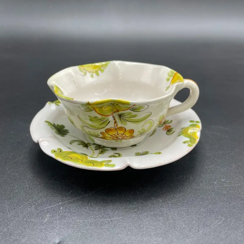 This is a matching antique (1890-1920) Cantagalli Firenze Italian floral majolica pottery teacup and saucer. The cup measures approximately 2" tall x 3.5" across the top, and holds approximately 4fl oz. The saucer is approximately 4.5" in diameter. Each has the cockerel signature, and the saucer is marked Italia. No major flaws.