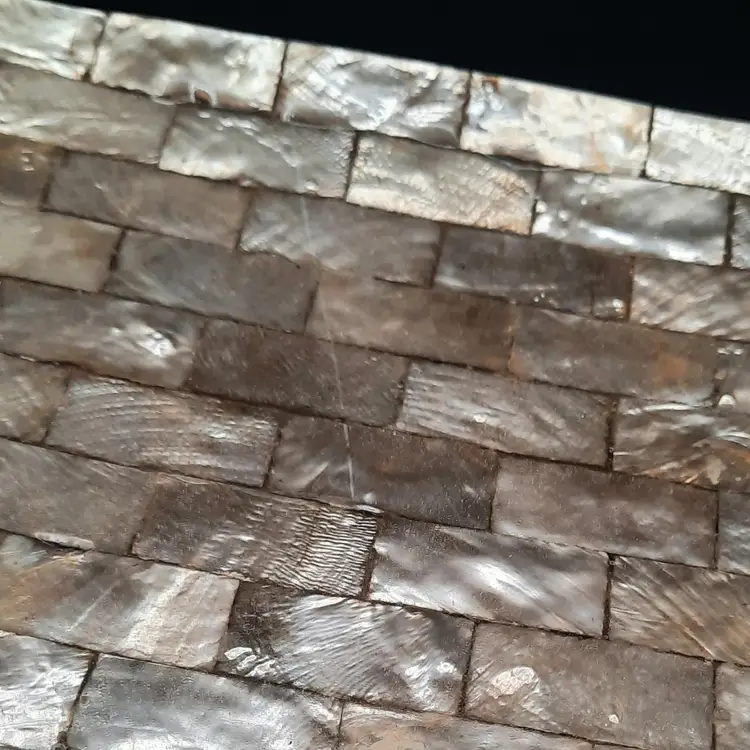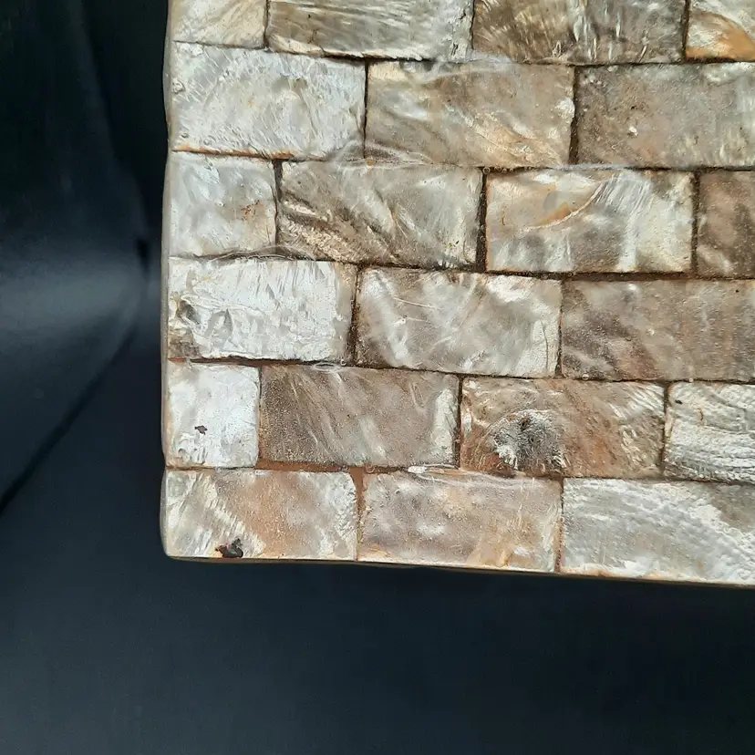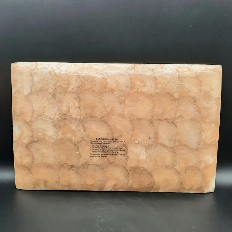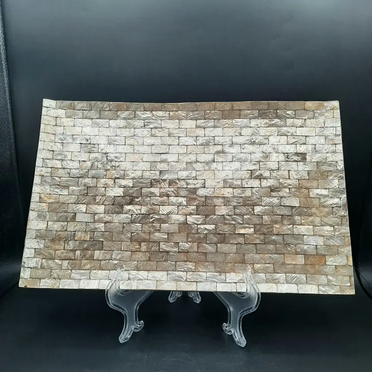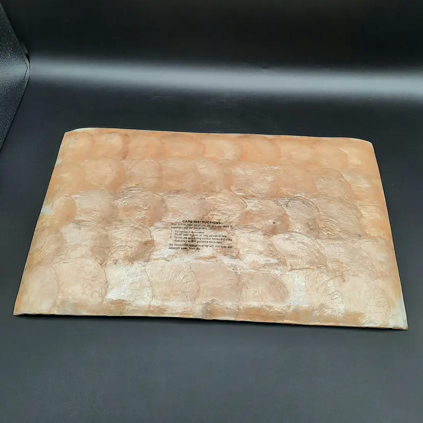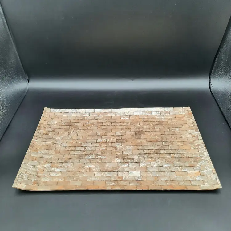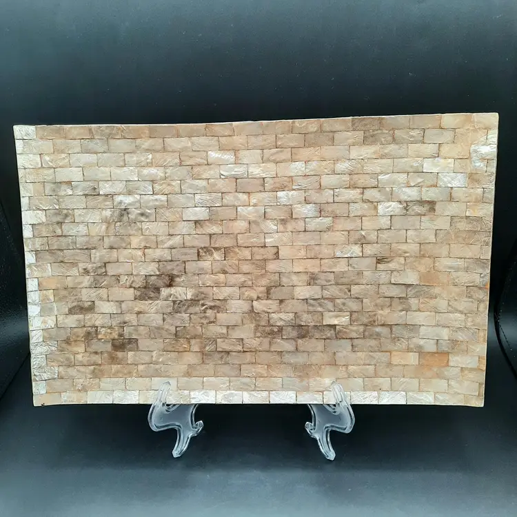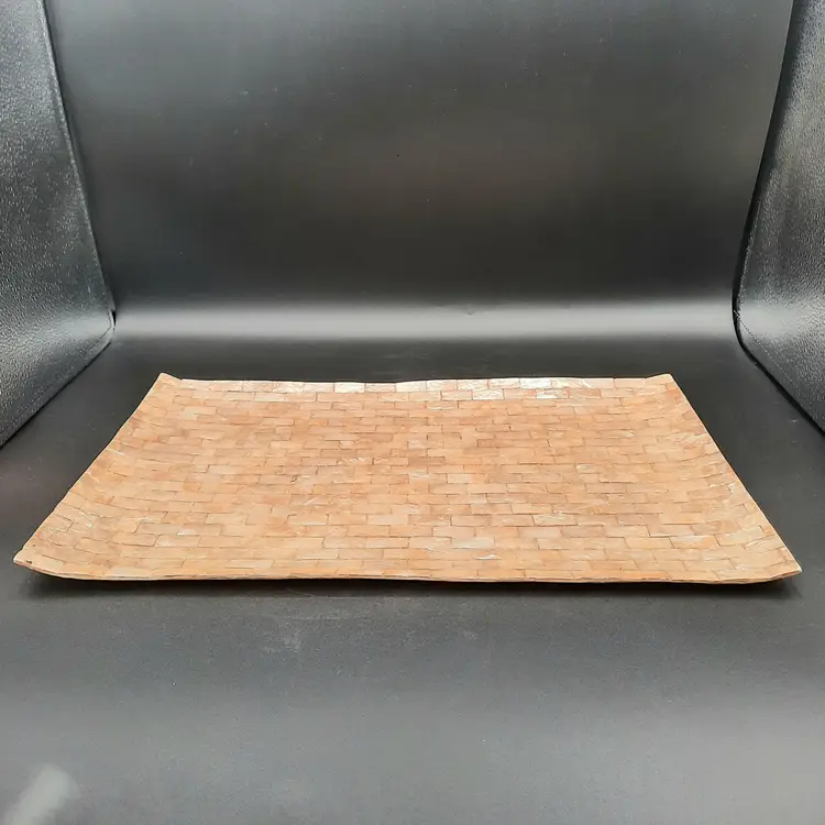 Beautiful shimmer in this 15 1/2" x 10" tray, overall great condition with a light scratch and a couple small hairline cracks on one corner, other imperfections are just irregularities in some of the shells