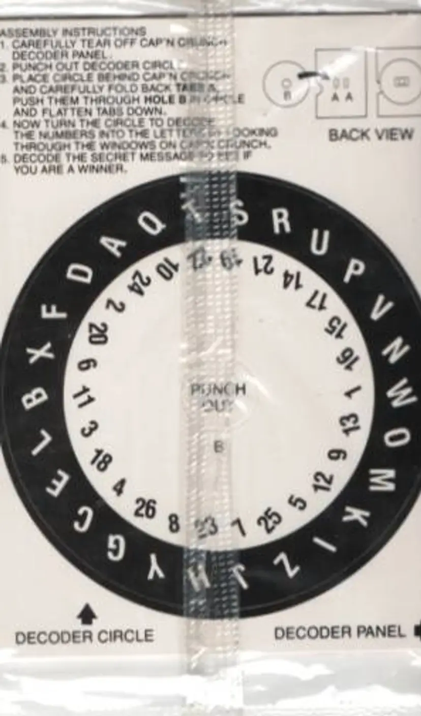 In 1973 this was a cereal premium in a box of Cap'n Crunch cereal. If the decoder came up with right secret message, could win $1000 in toys from Toys R Us.