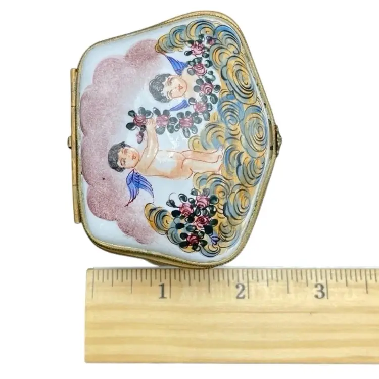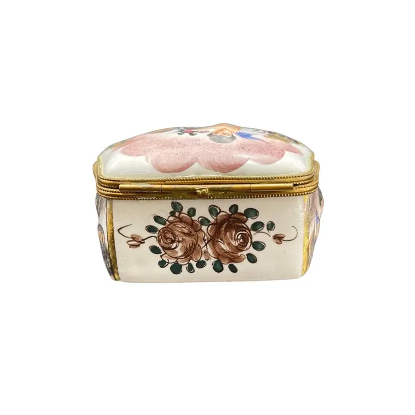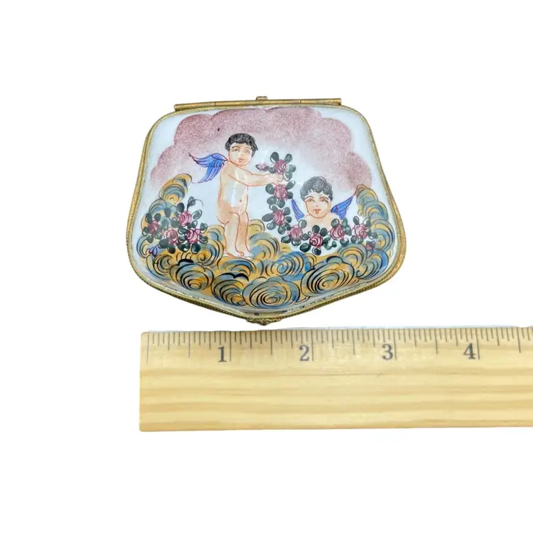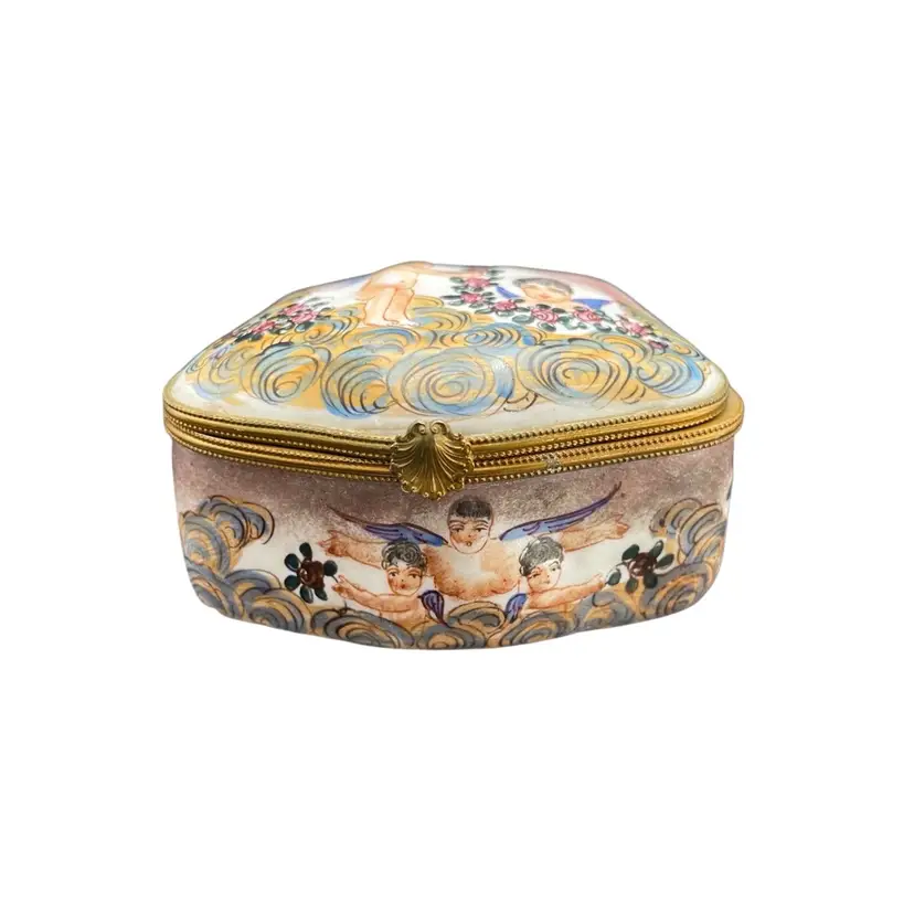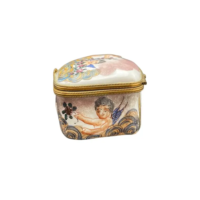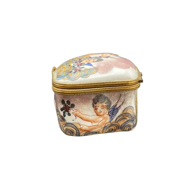 This is an antique hinged hand painted Capodimonte porcelain trinket box with 3D cherubs. Hallmark indicates this piece was made between the years of 1900 and 1919. Measures approximately 3" long x 2" wide x 1.25" tall. No major flaws.