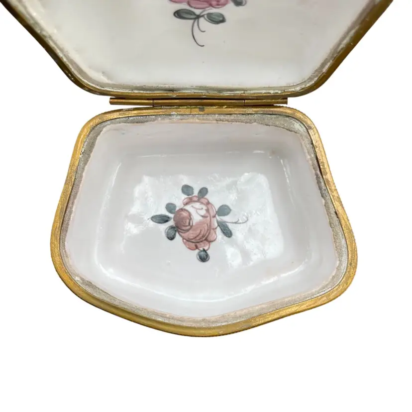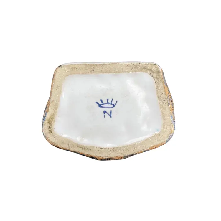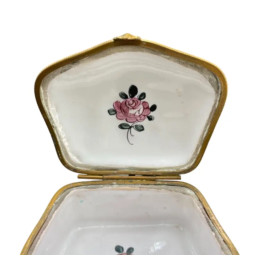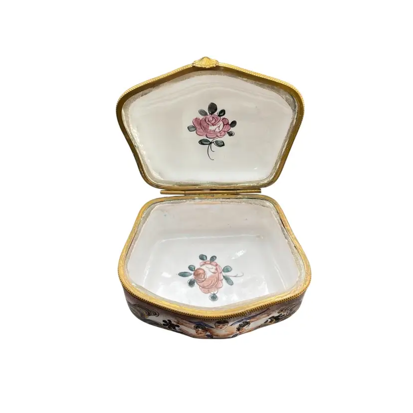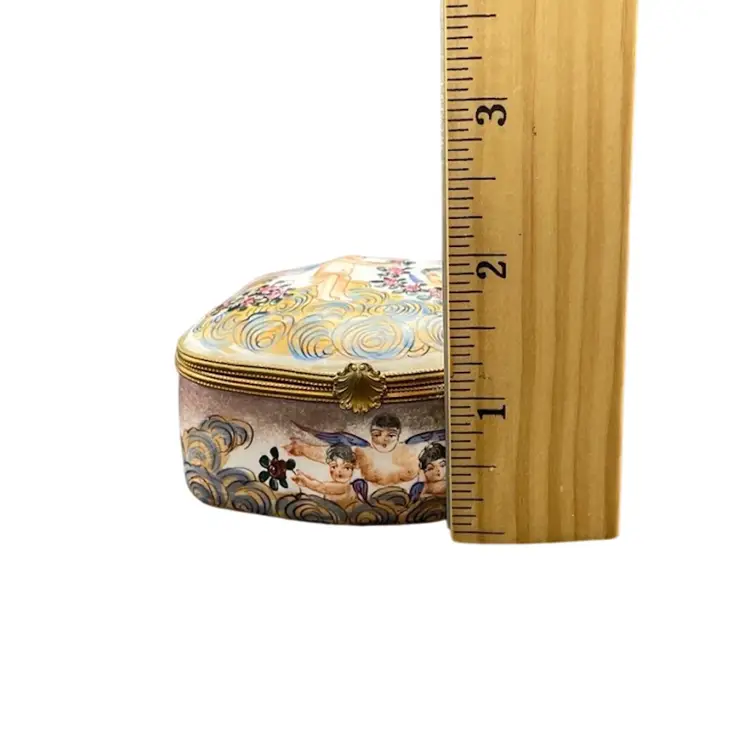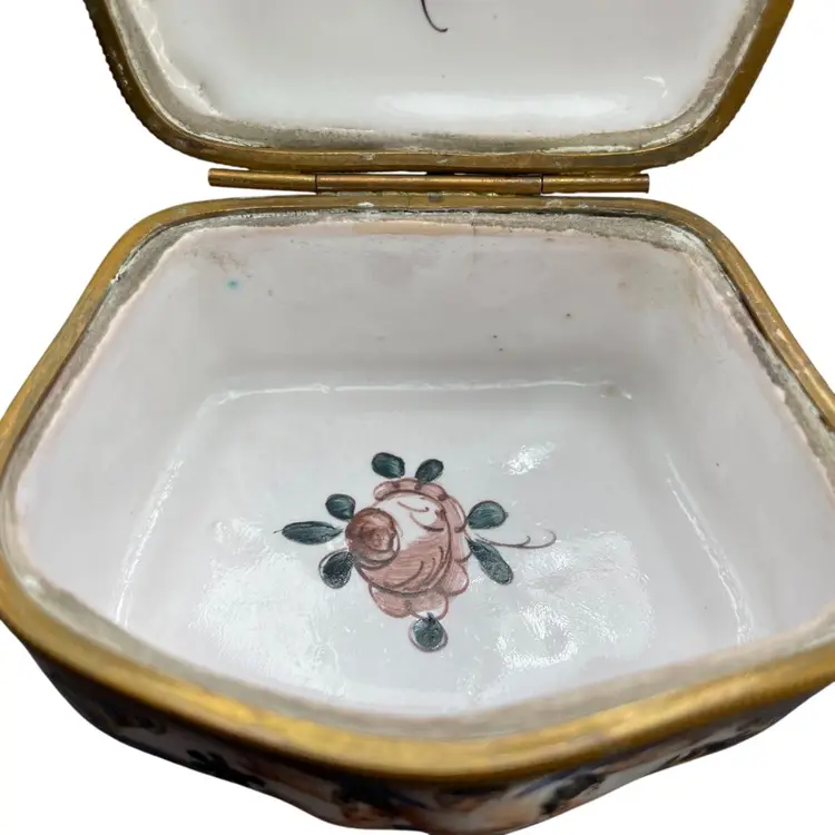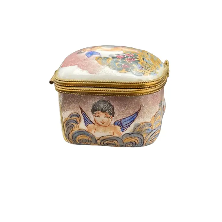 This is an antique hinged hand painted Capodimonte porcelain trinket box with 3D cherubs. Hallmark indicates this piece was made between the years of 1900 and 1919. Measures approximately 3" long x 2" wide x 1.25" tall. No major flaws.