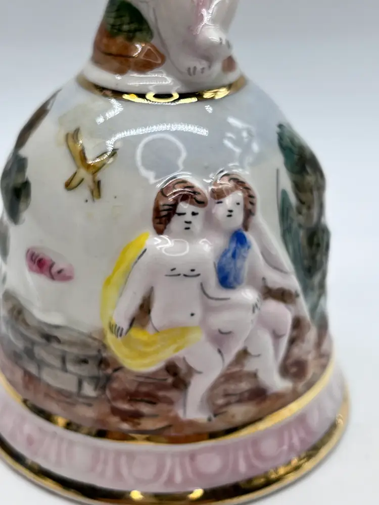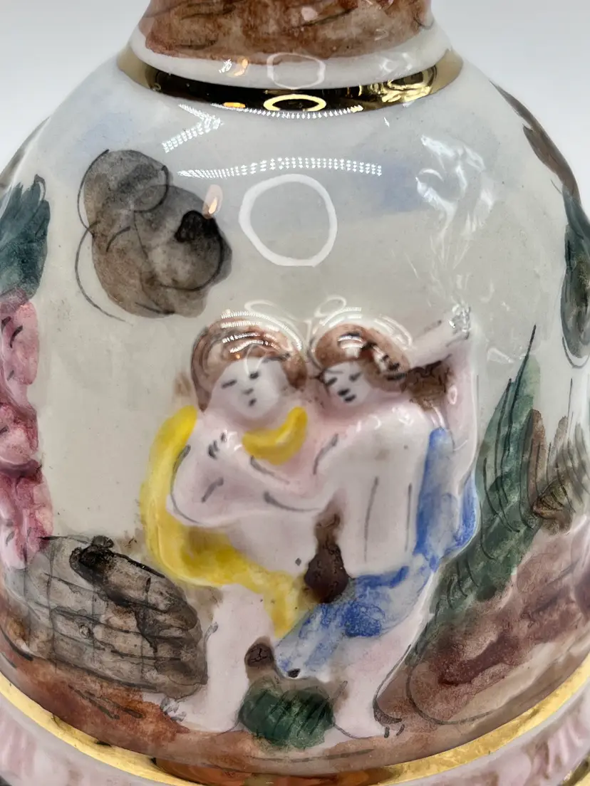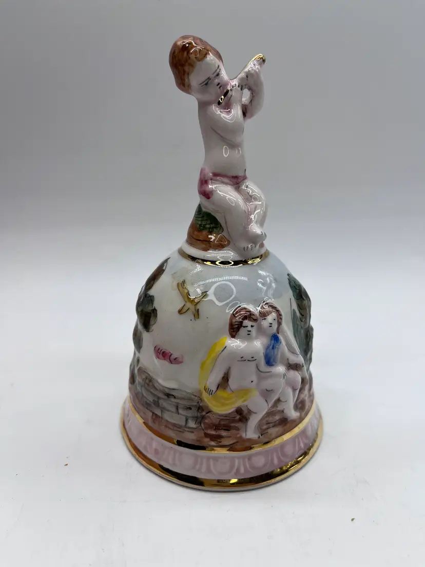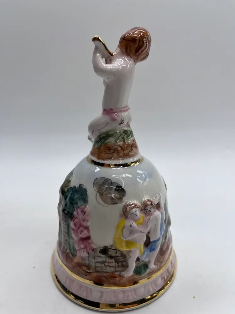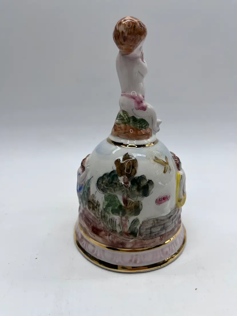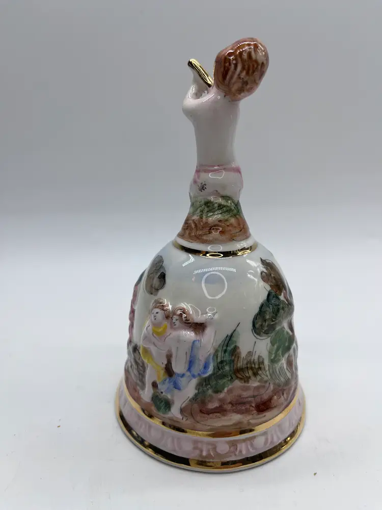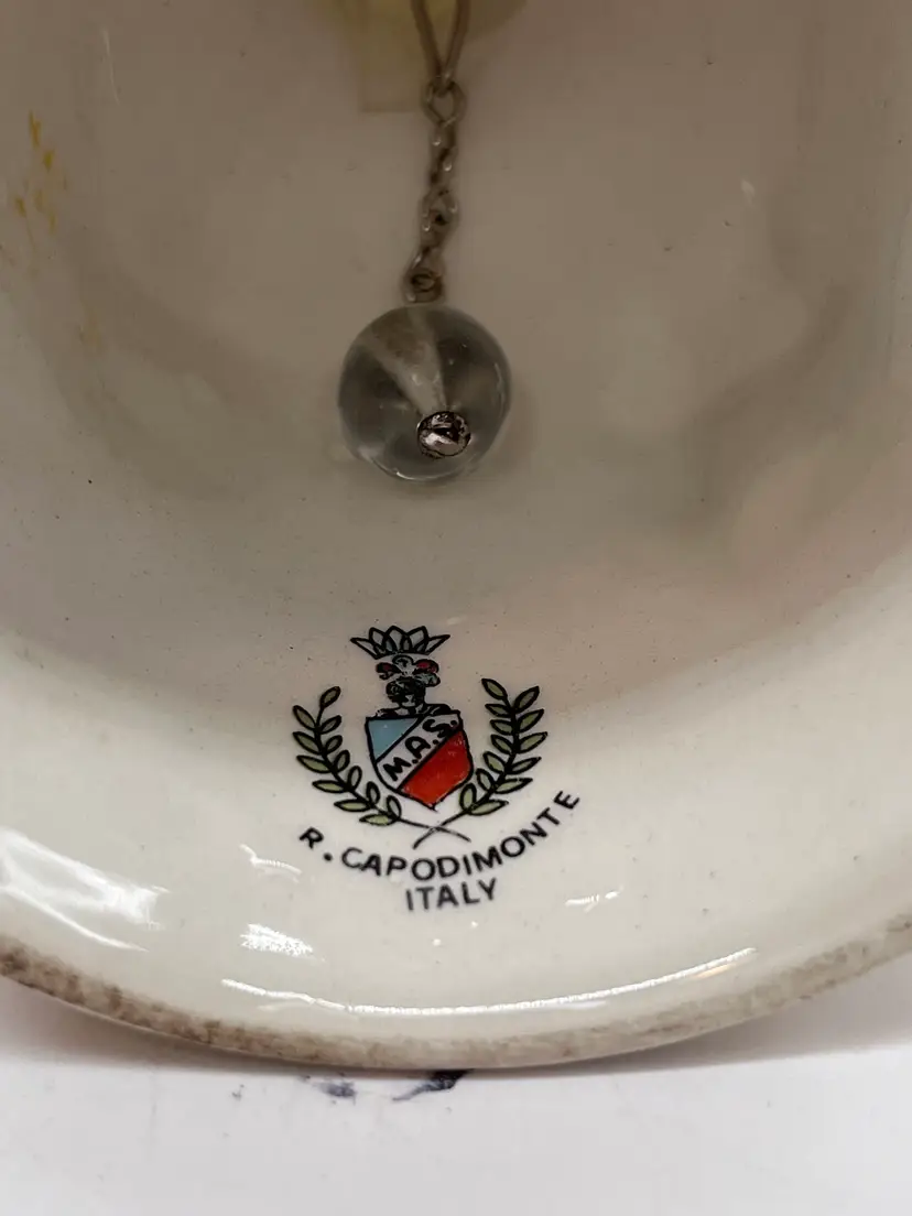 For lovers of quality hand painted Italian majolica style ceramics, pieces signed by the CAPODIMONTE artisans are highly sought after collectibles. This charming bell is hand painted, with high relief floral and cherubic motifs. Highlighted in soft pastels and gold, the interior clapper is intact, maker mark clearly visible, and there are no chips, cracks or damage.
