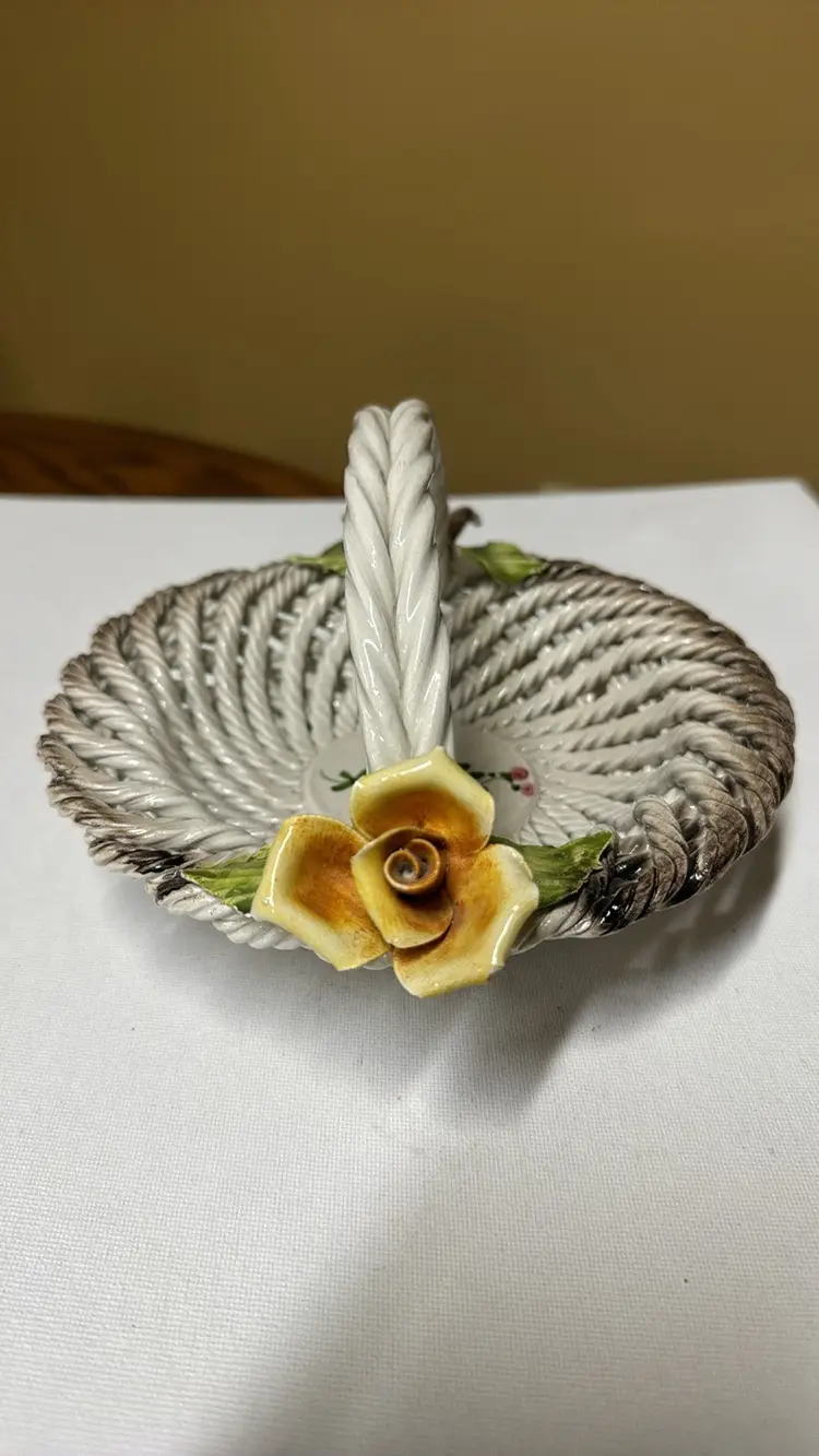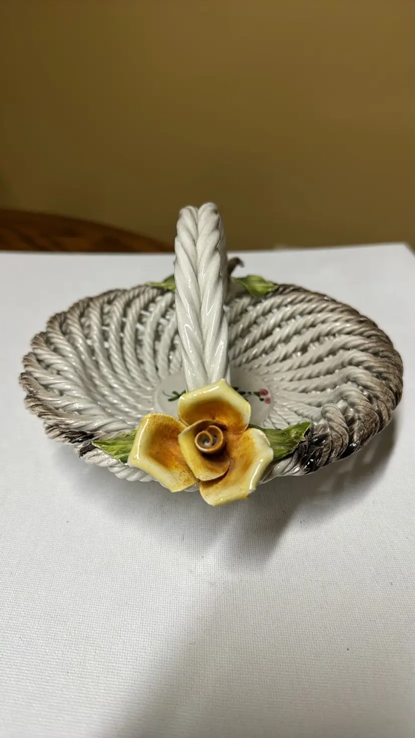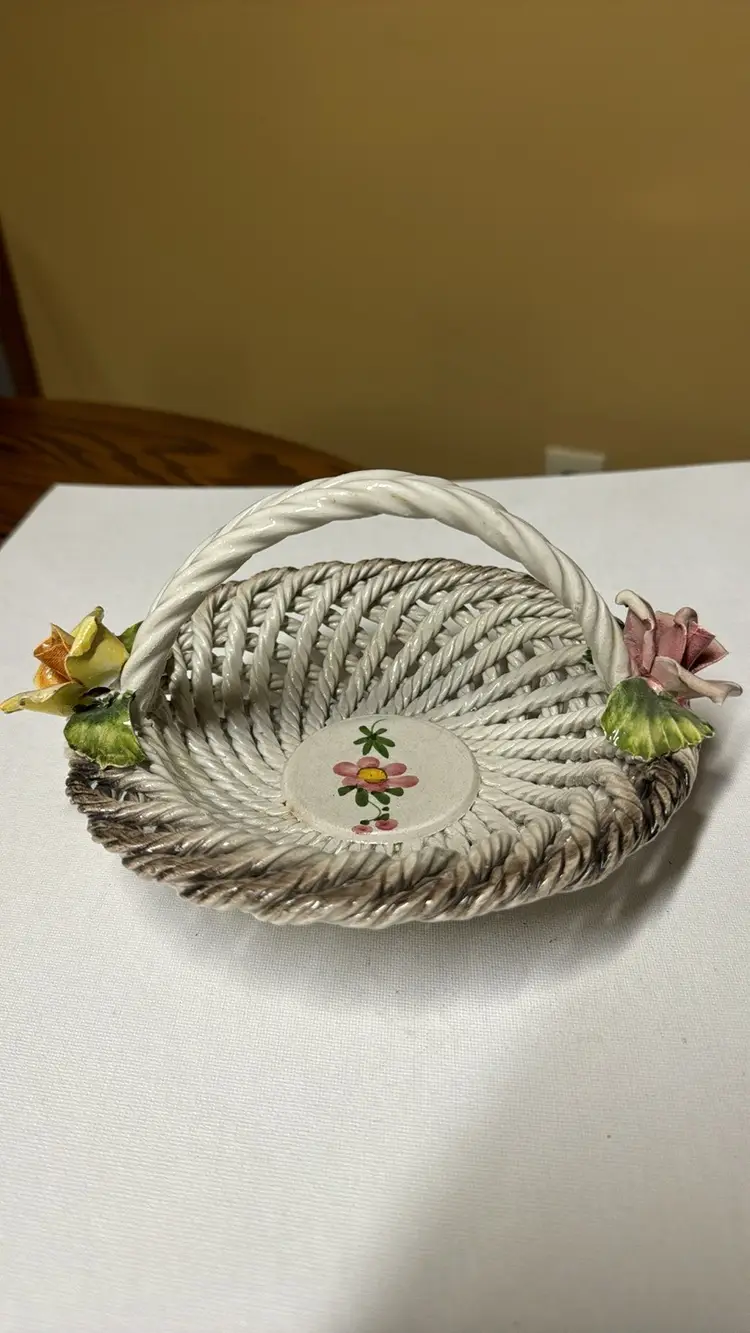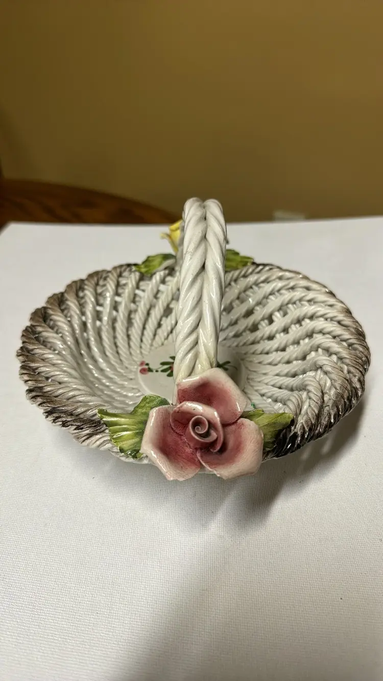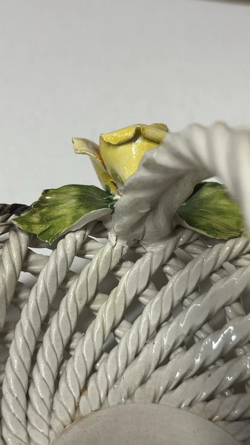 Capodimonte woven fine porcelain basket with roses signed and made in Italy About 9” across by 7.25” 5.5” tall Beautiful condition there are some tiny chips on the underside of the pink rose that can’t be seen from thee top and a chip on the leaf of the yellow or rose that I almost missed seeing (these are both pictured) (171123243)