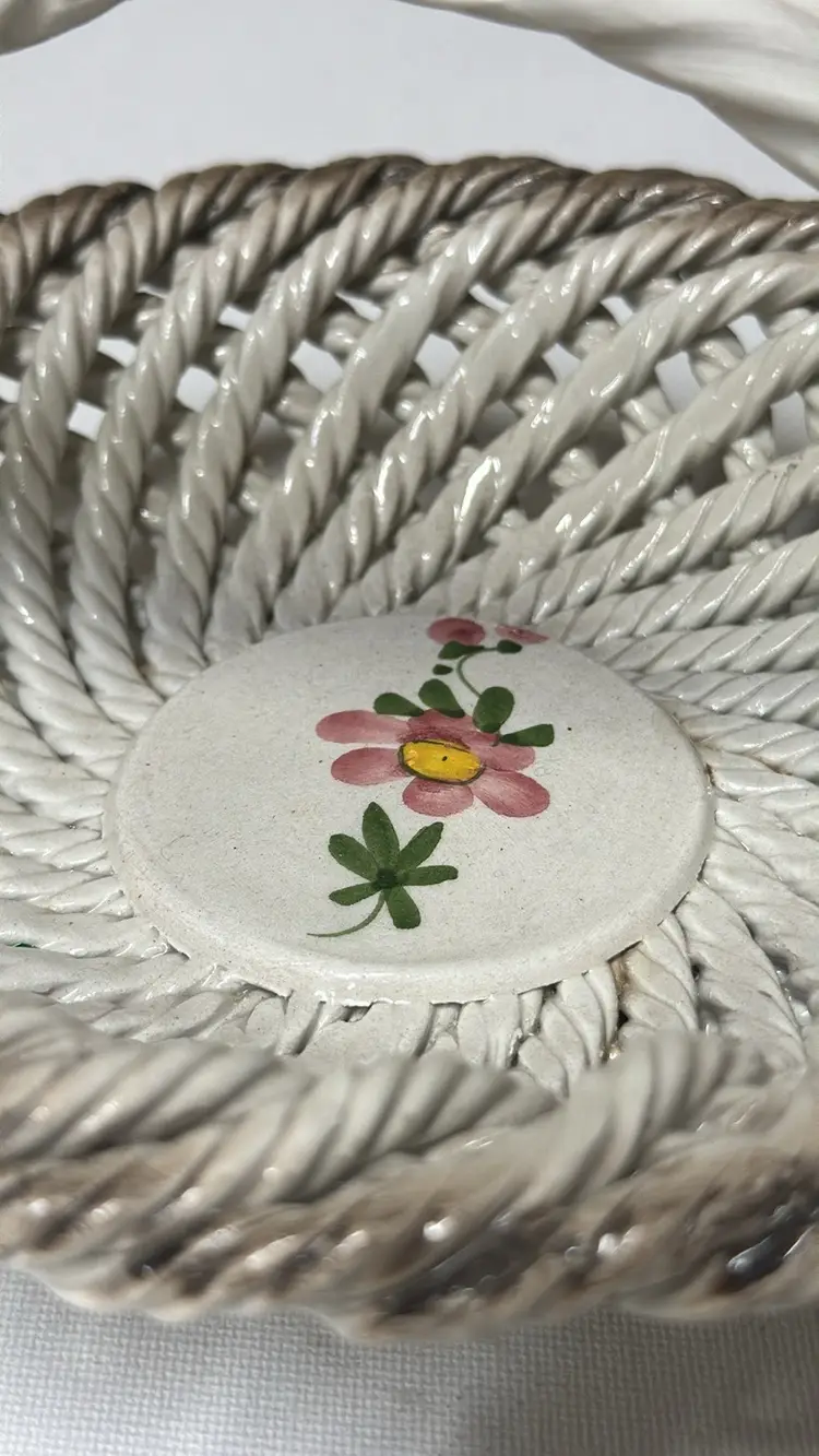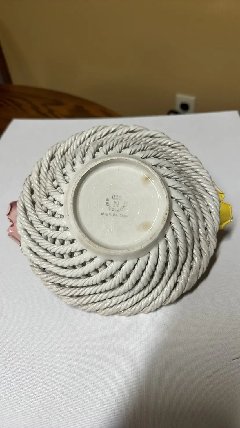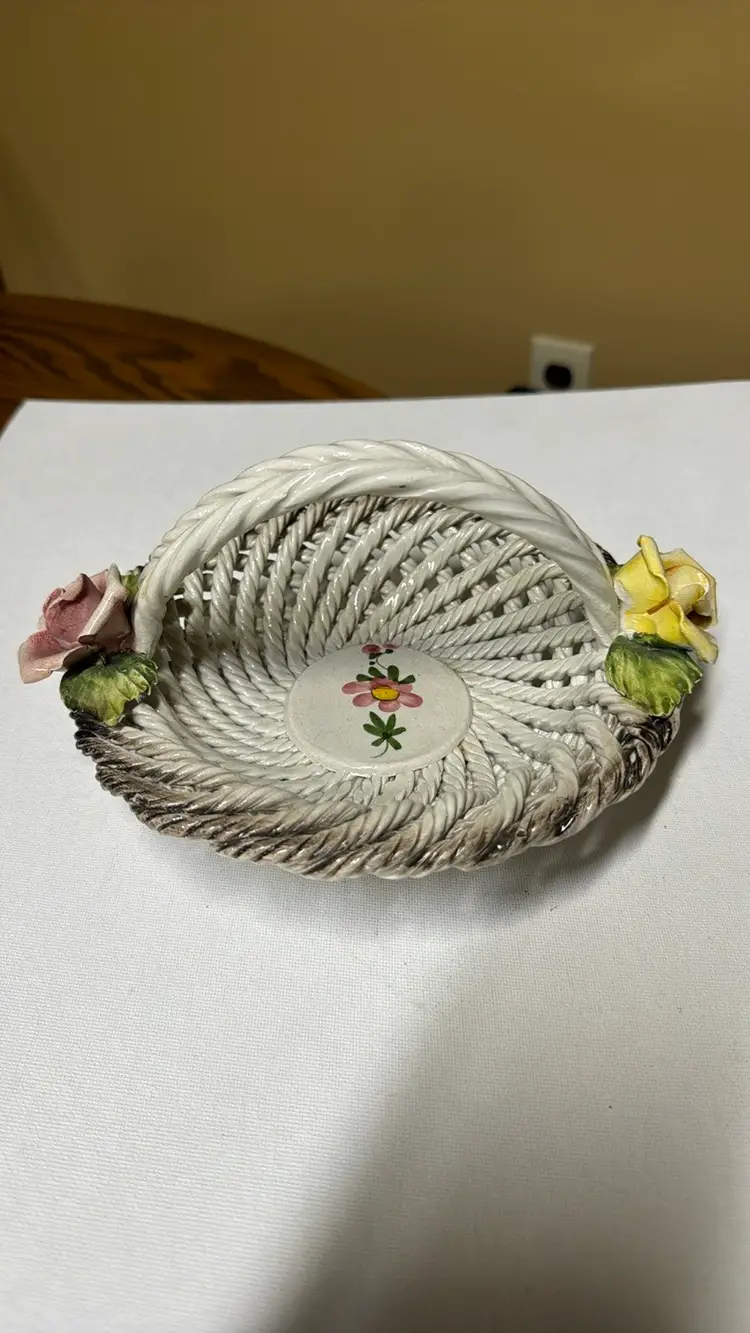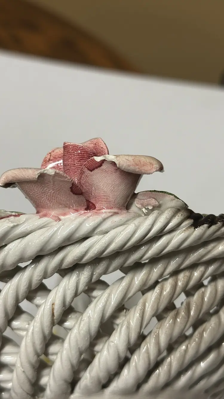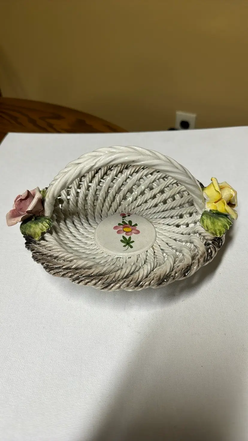 Capodimonte woven fine porcelain basket with roses signed and made in Italy About 9” across by 7.25” 5.5” tall Beautiful condition there are some tiny chips on the underside of the pink rose that can’t be seen from thee top and a chip on the leaf of the yellow or rose that I almost missed seeing (these are both pictured) (171123243)
