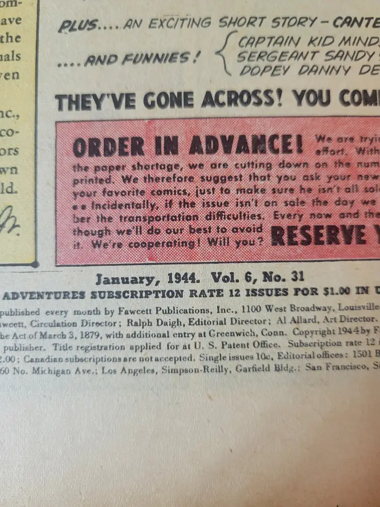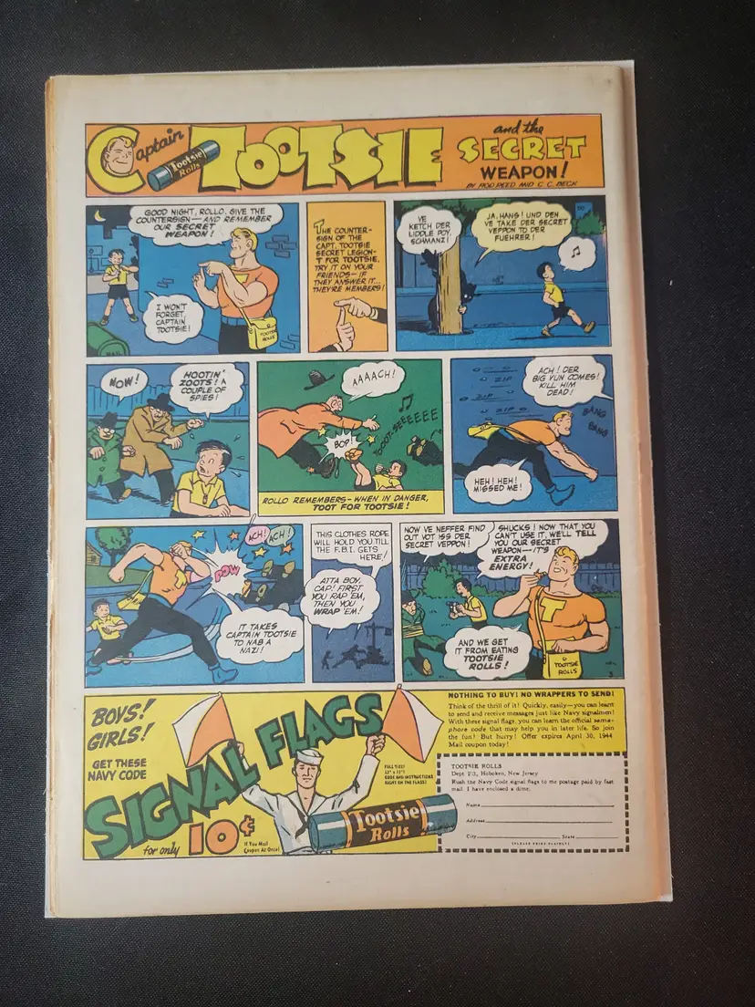 Golden Age book from 1944, single staple. Inside middle pages detached.