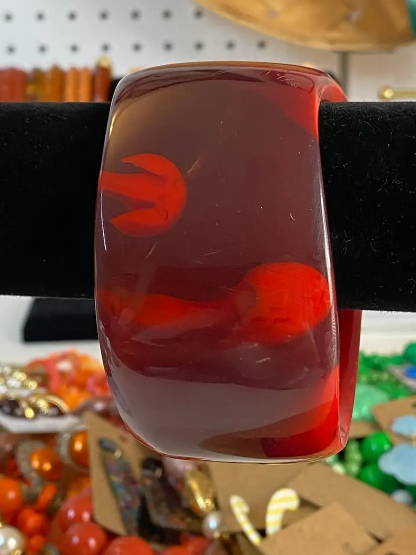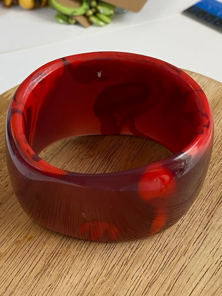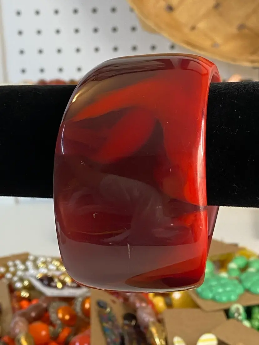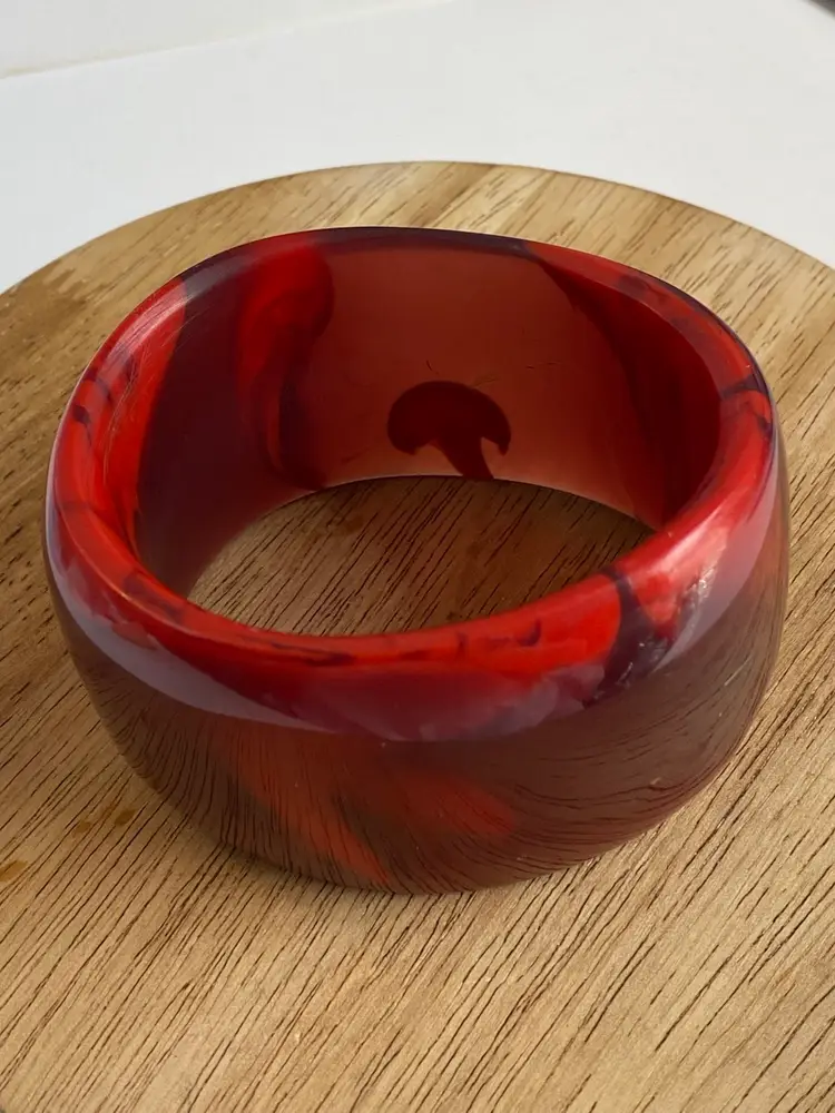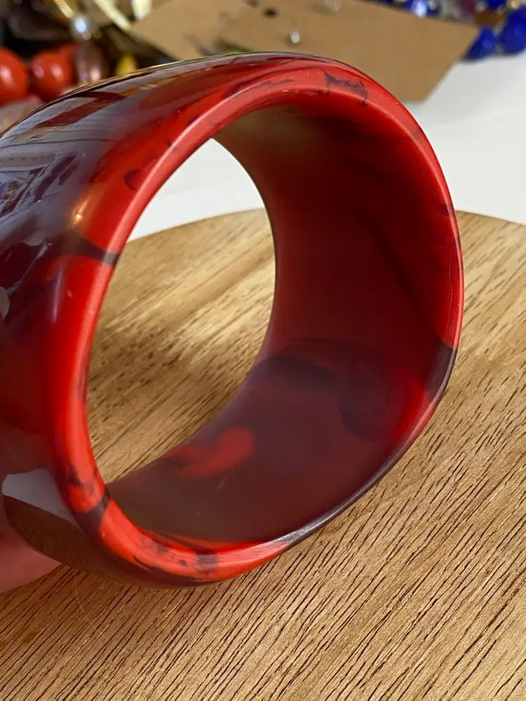 Elevate your accessory collection with the striking 1976 Cara Croninger marbleized red lucite bangle bracelet. This vintage piece showcases the timeless elegance of the fashion industry with its vibrant color and distinctive bangle style, making it a standout addition to any outfit. The bracelet's smooth, red marbled texture exudes a classic charm that is both versatile and eye-catching.