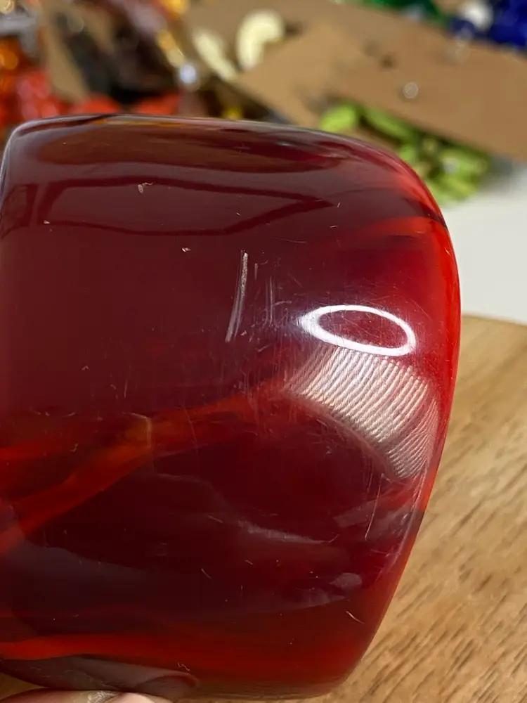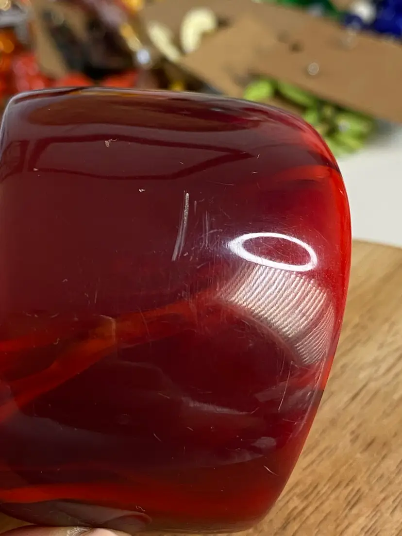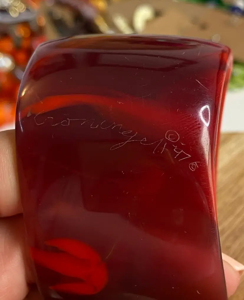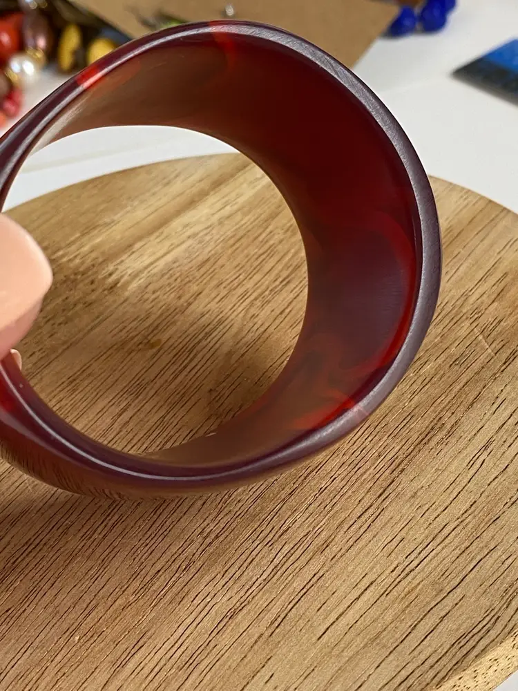Elevate your accessory collection with the striking 1976 Cara Croninger marbleized red lucite bangle bracelet. This vintage piece showcases the timeless elegance of the fashion industry with its vibrant color and distinctive bangle style, making it a standout addition to any outfit. The bracelet's smooth, red marbled texture exudes a classic charm that is both versatile and eye-catching.