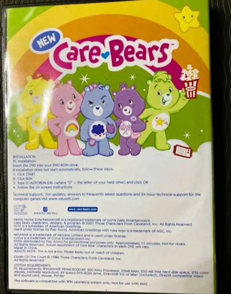 New Care Bears Music Video Order on the Court Catch a Star - DVD with Care Bears Activity Book, includes Care Bear Music Video, Animated Series Order on the Court, and a Care Bears Computer Game. PLEASE NOTE: This DVD is from 2004. Stated System requirements for game: Windows 98/ME/2000 XP. The game has not been tested on Windows 10/11.