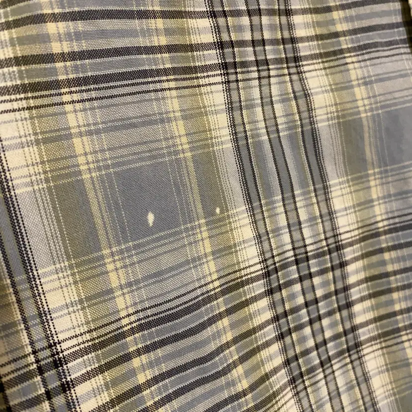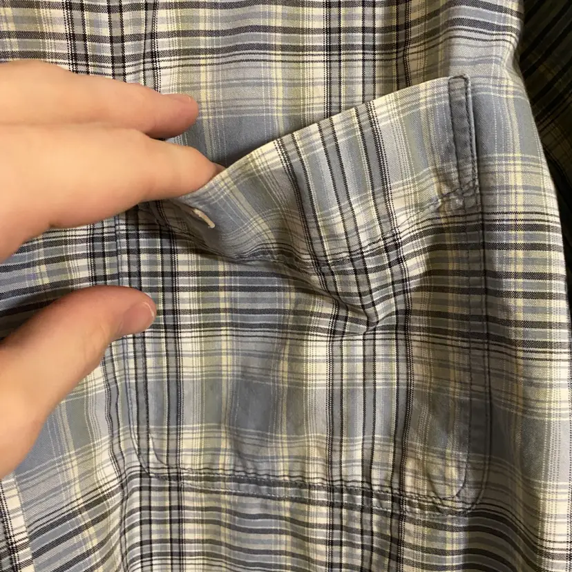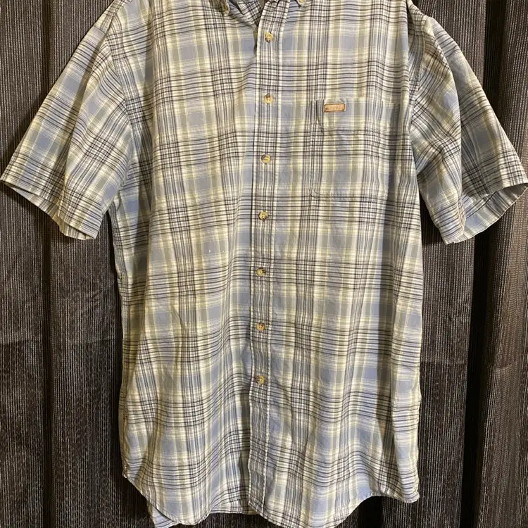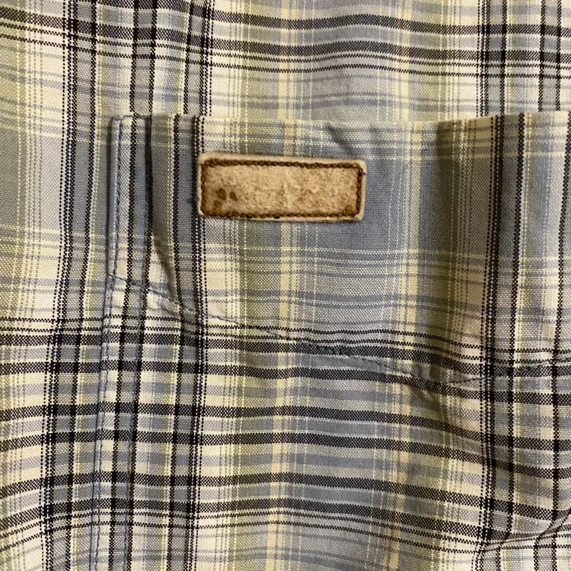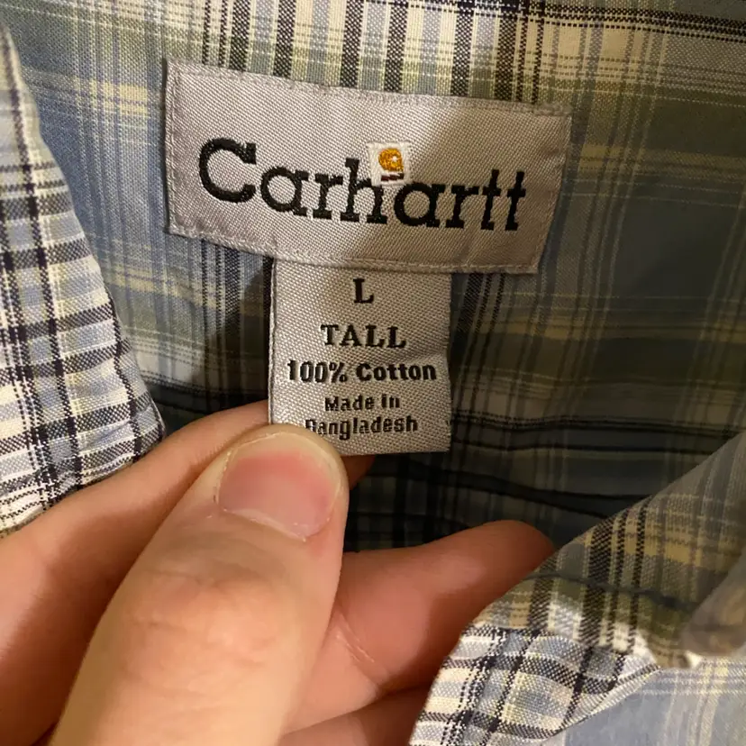 You are purchasing one Men's Size Large Tall Blue Plaid Pattern Short Sleeve Button-Up Shirt by Carhartt from 2003. Measurements: 26" chest & 33" length. This Shirt is in overall good condition with no rips or holes. Just see final two images for most notable signs of wear: worn logo on the pocket and spots of discoloration on the front right side.