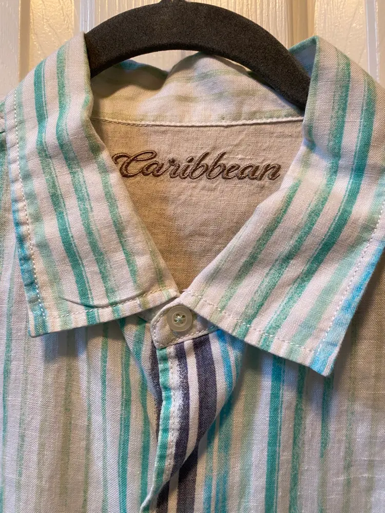 Big men’s causal button up shirt. Roll up sleeves Caribbean brand. Size 32” Long, 26” chest Excellent condition