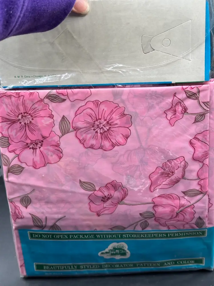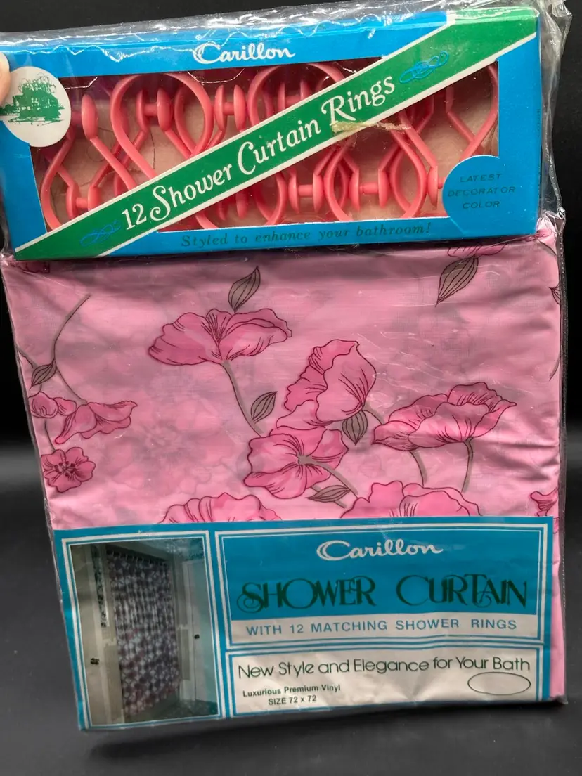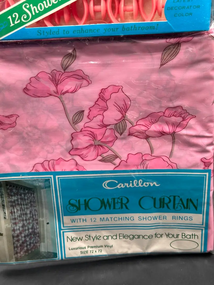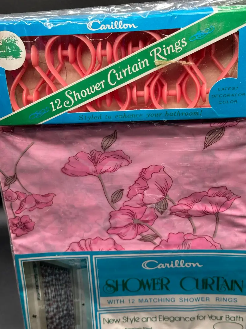 Carillon Shower Curtain Vtg 1970s Pink White Floral Vinyl Rings