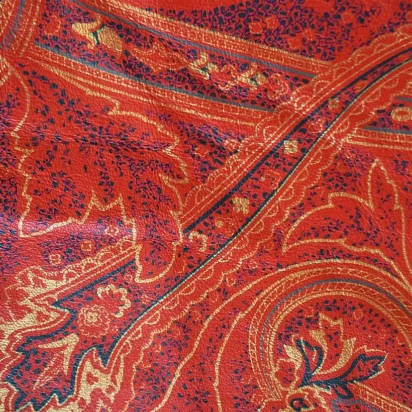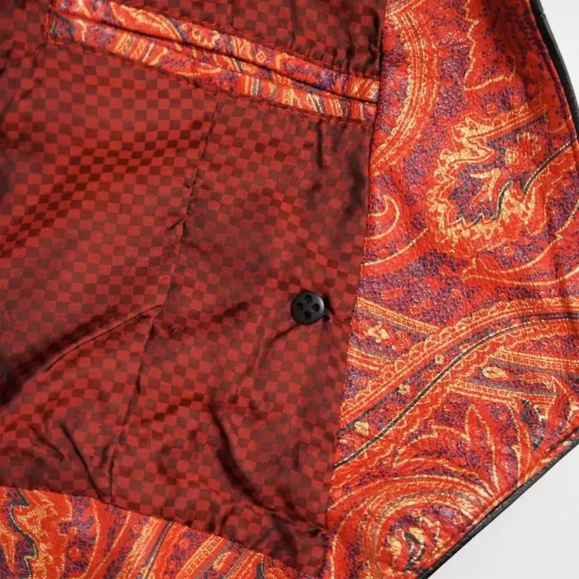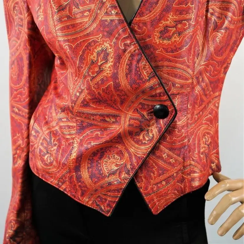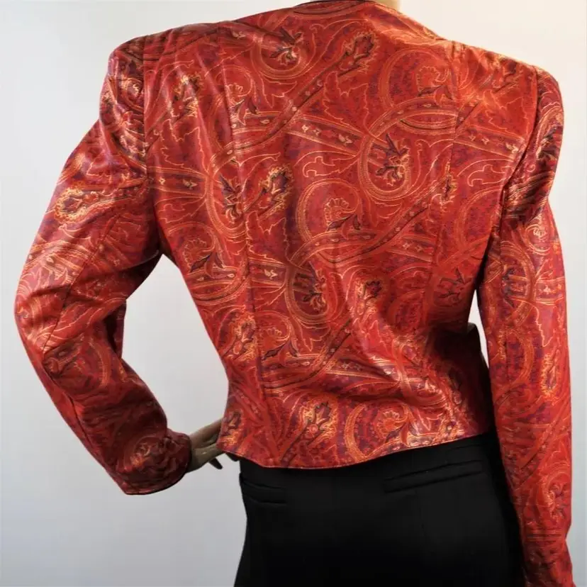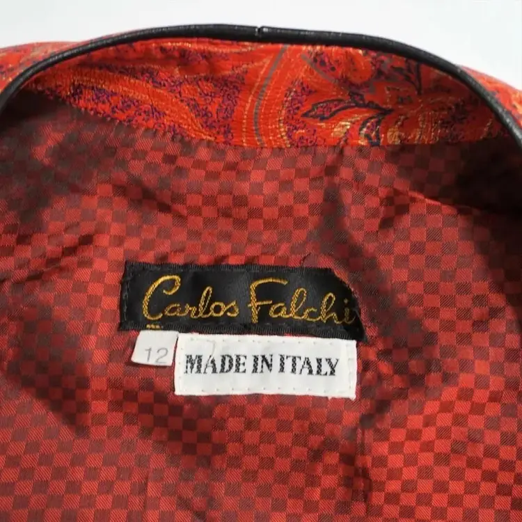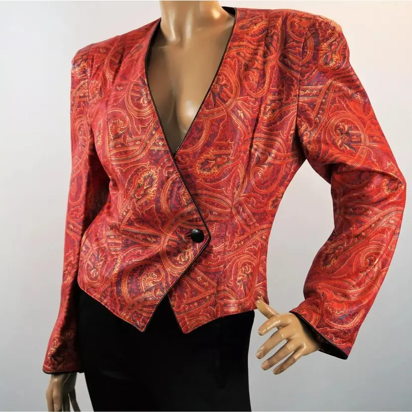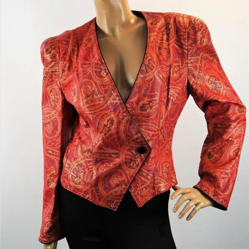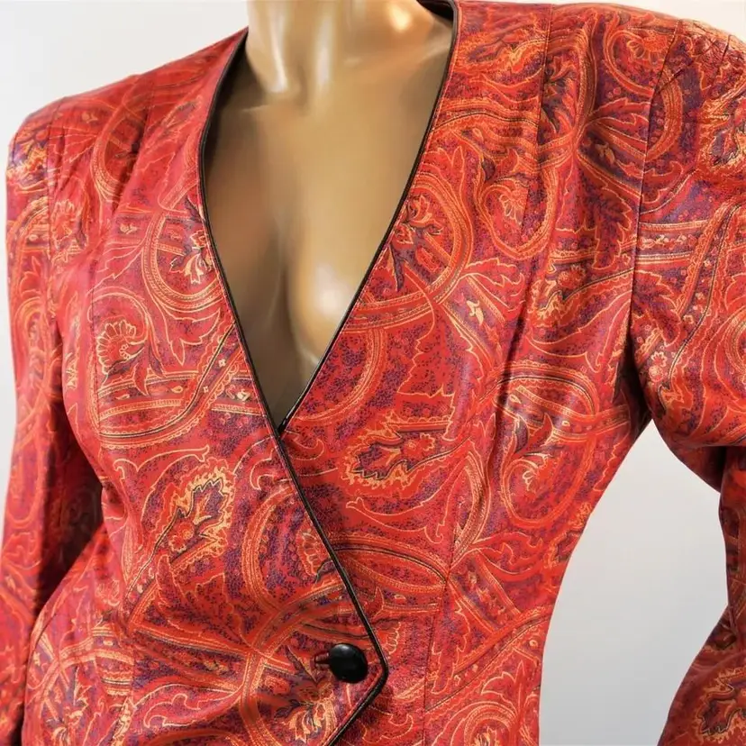 80's Vintage Designer Carlos Falchi Painted Leather Blazer Cropped One Button Jacket . Angled Front . V - Neck . Shoulder Pads . Paisley Print In Red & Gold. Genuine Leather . Lined . Made In Italy . Tagged Women's Size 12 - See Measurements As Vintage Runs Smaller ! Measurements Laid Flat : Across Bust 21" / Across Waist 17" / Shoulders 19" / Sleeve 24" / Length 20" . Carlos Falchi (1944 - 2015) was a Brazilian-born American handbag and accessories designer known for his patchwork designs.