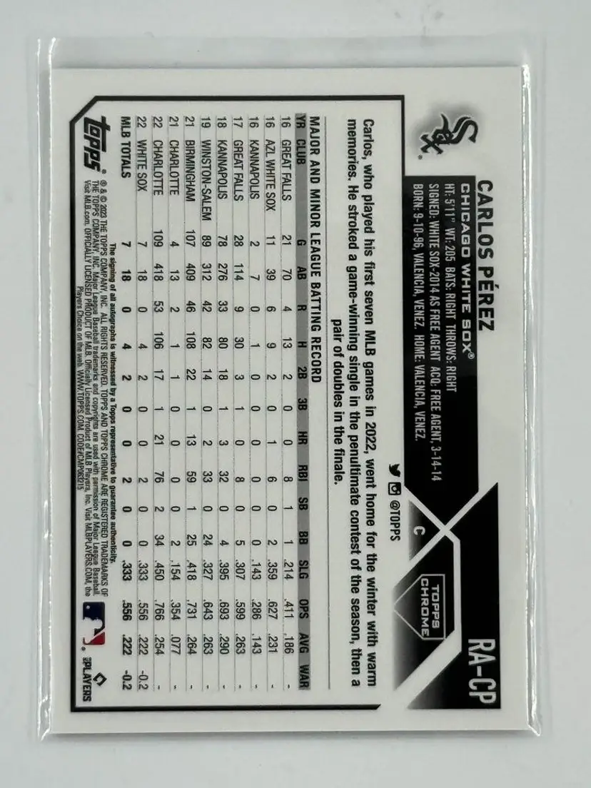 Carlos Perez 2023 Topps Chrome Rookie Auto Chicago White Sox