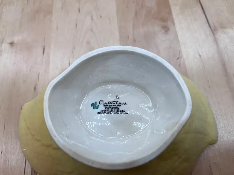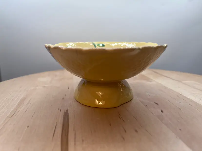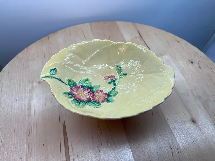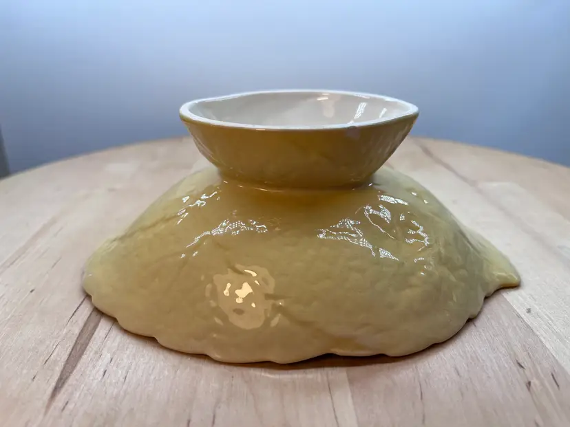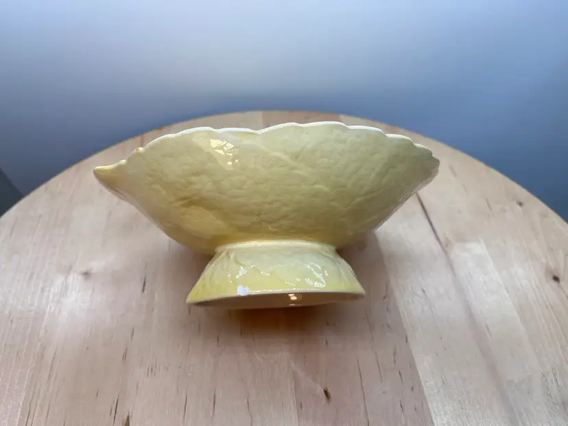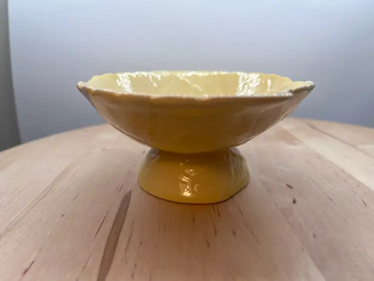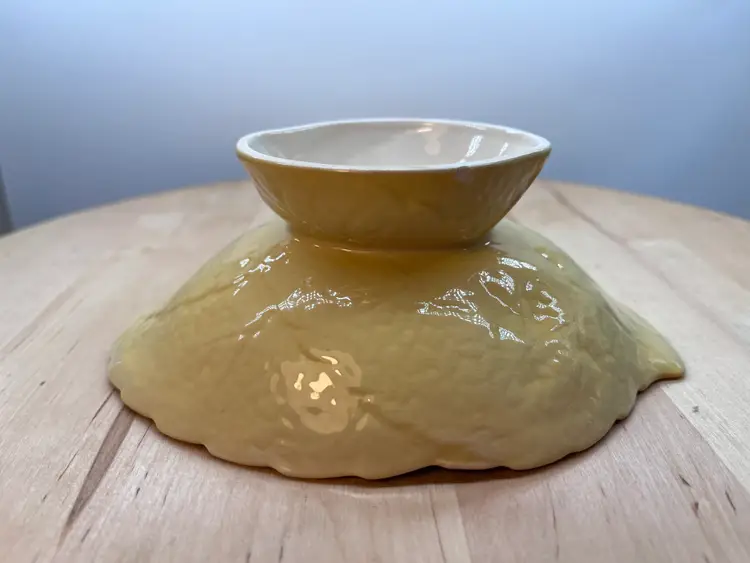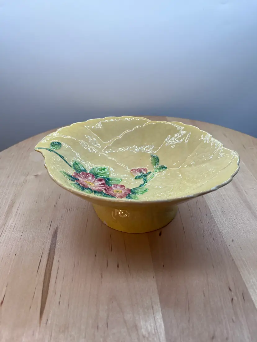 Designed in Australia, and made in England, this butter yellow footed or pedestal candy dish features delicately painted wild roses on the interior. This line of whimsical dishware from Carlton Ware of England was part of the Flora themed line - some featuring Australian native flowers and plants, others featuring species introduced by the British colonists. The textured ceramic surface is glazed, and the glaze is exceptionally bright and clear given the estimated age of the item from the 1950s. Please note the small chip in glaze on back base of the bowl - you’ll have to zoom to see the area clearly. Does not affect use or function of the dish - but do not put vintage dishware in dishwasher!