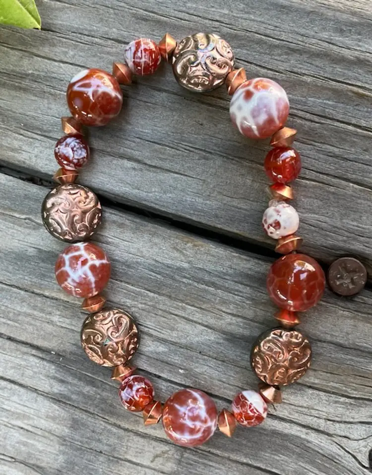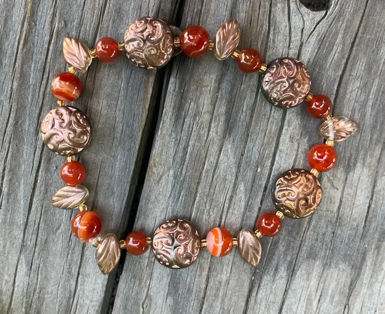 A set of Carnelian Dragon Vein and Copper stretch bracelets. A beautiful mix of Copper discs, Engraved Copper Discs, Fancy Leafs and copper accents. Fits a 7 1/2 to 8 inch wrist. This bracelet is tied twice and glued with jewelry glue and will last you many years if you always roll them onto your wrist.