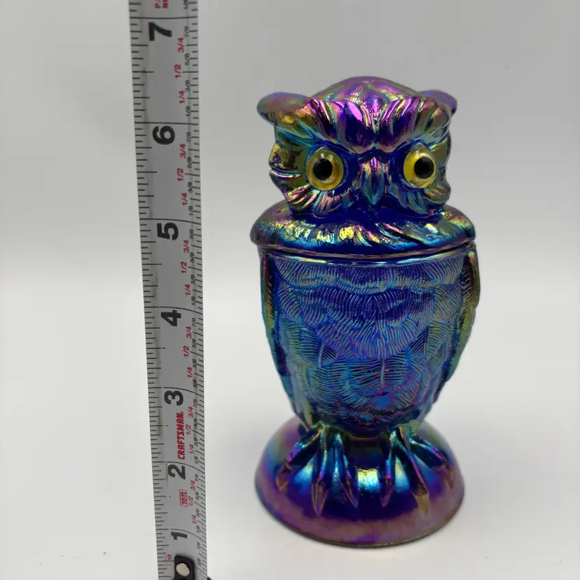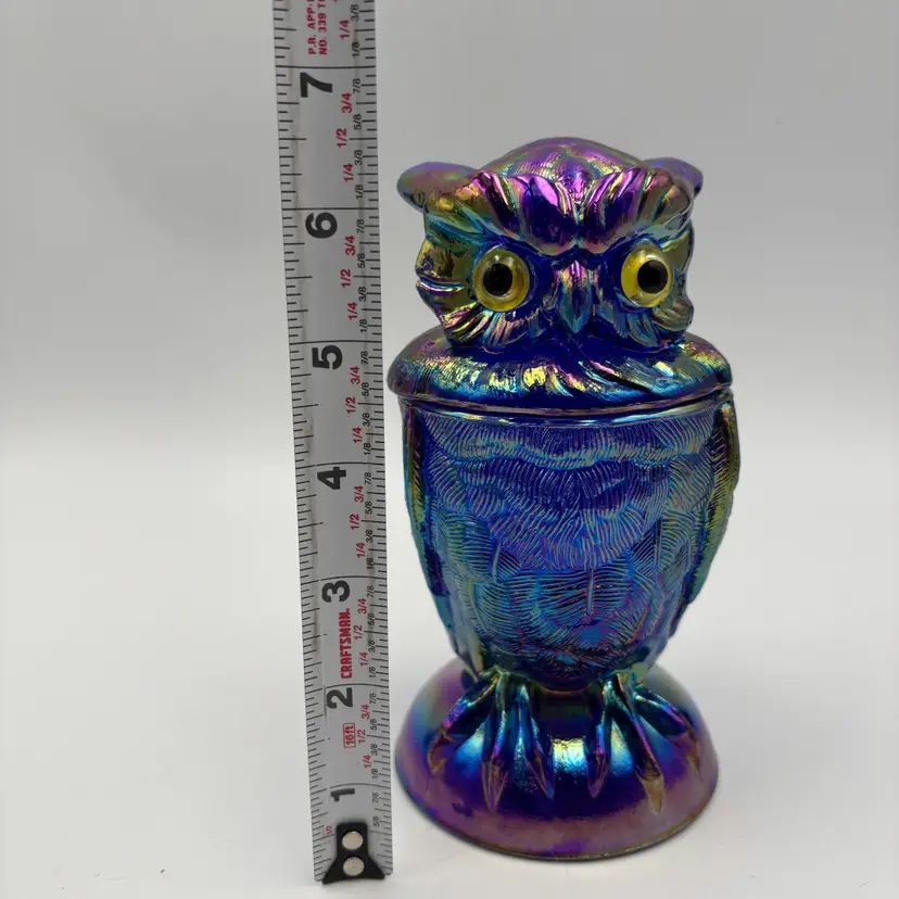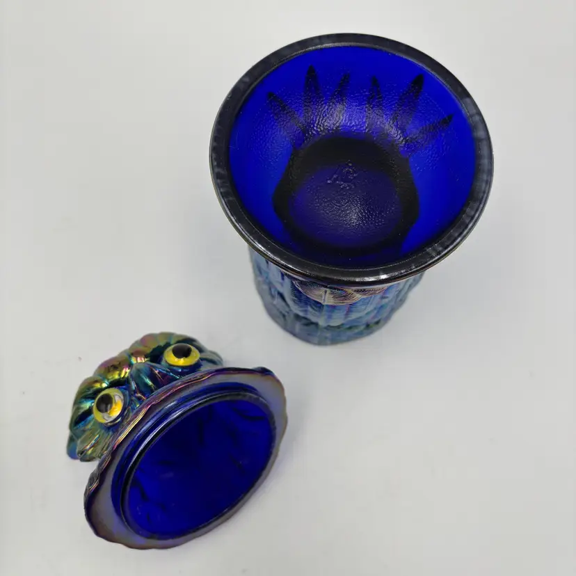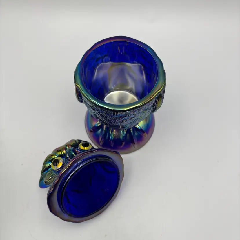 For sale is a Carnival Cobalt Blue Glass Owl Covered Jar Trinket Dish Imperial Glass Mould by Mosser Glass Toby Jar