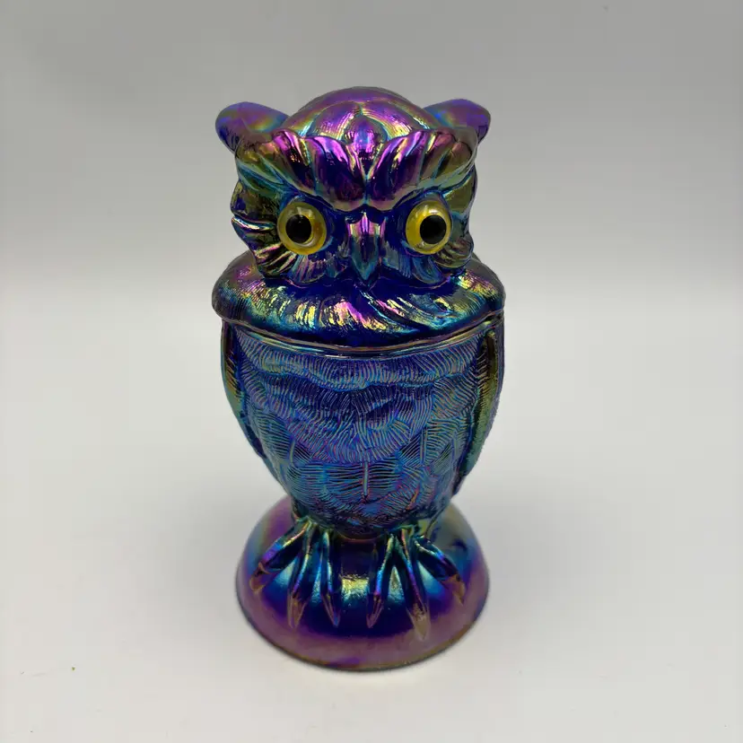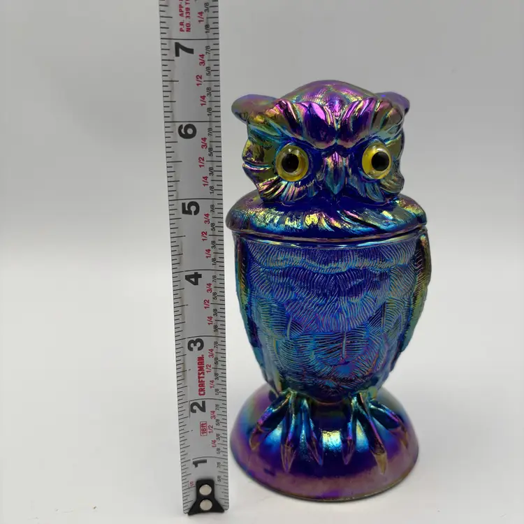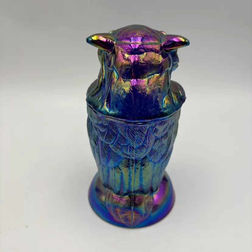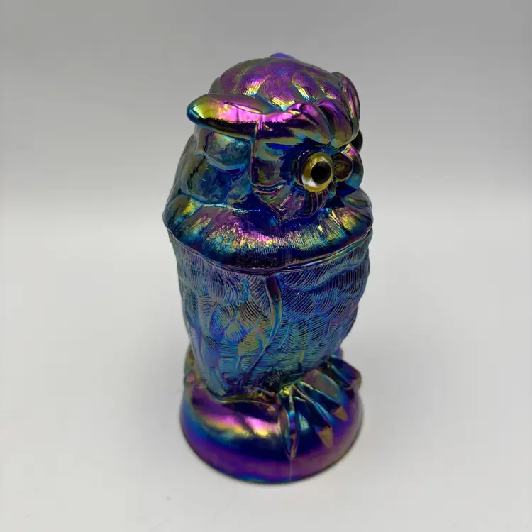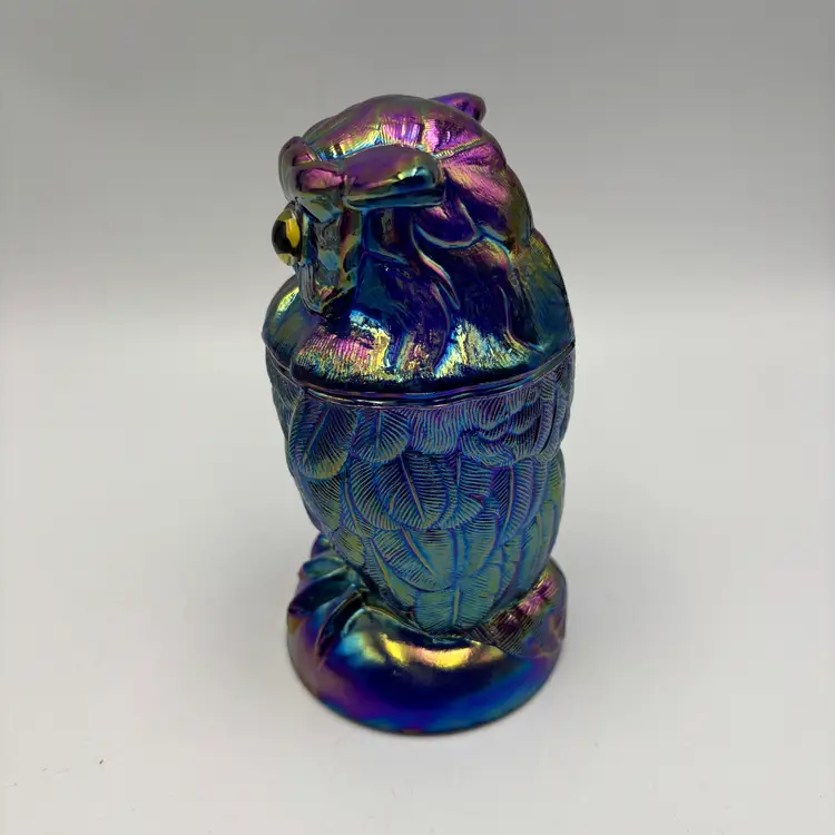 This collectible Owl Toby Jar is crafted in rich cobalt blue carnival glass, featuring brilliant iridescent tones. Made in the USA by Mosser Glass using the original Imperial Glass mould