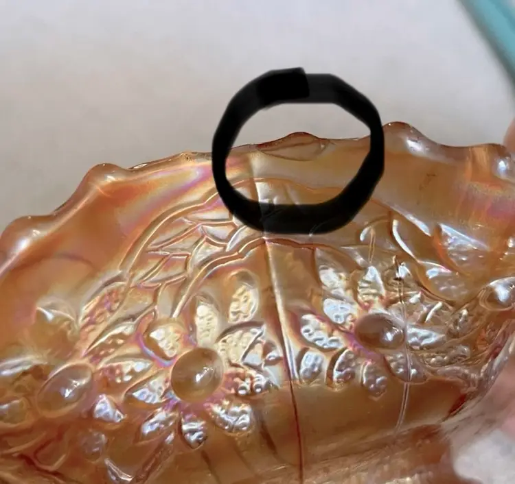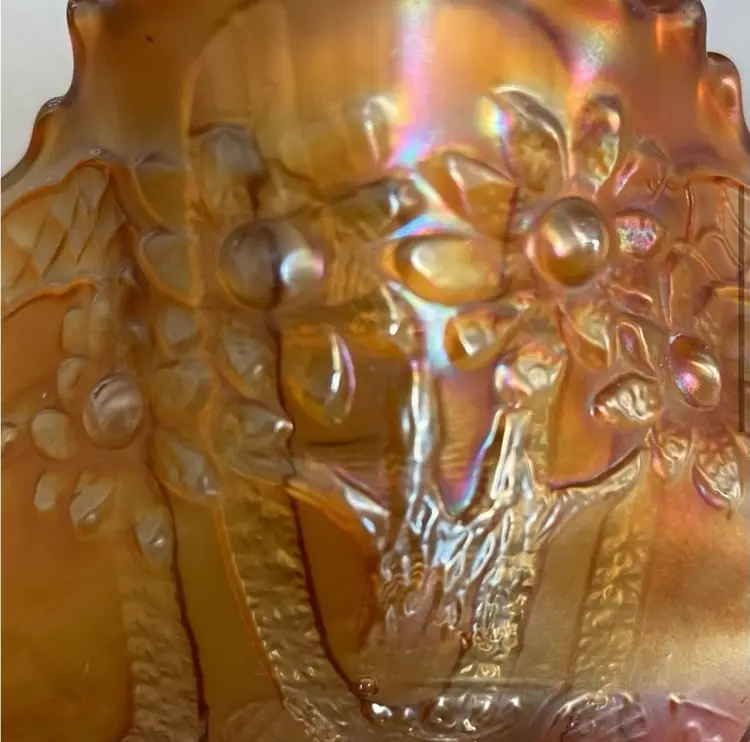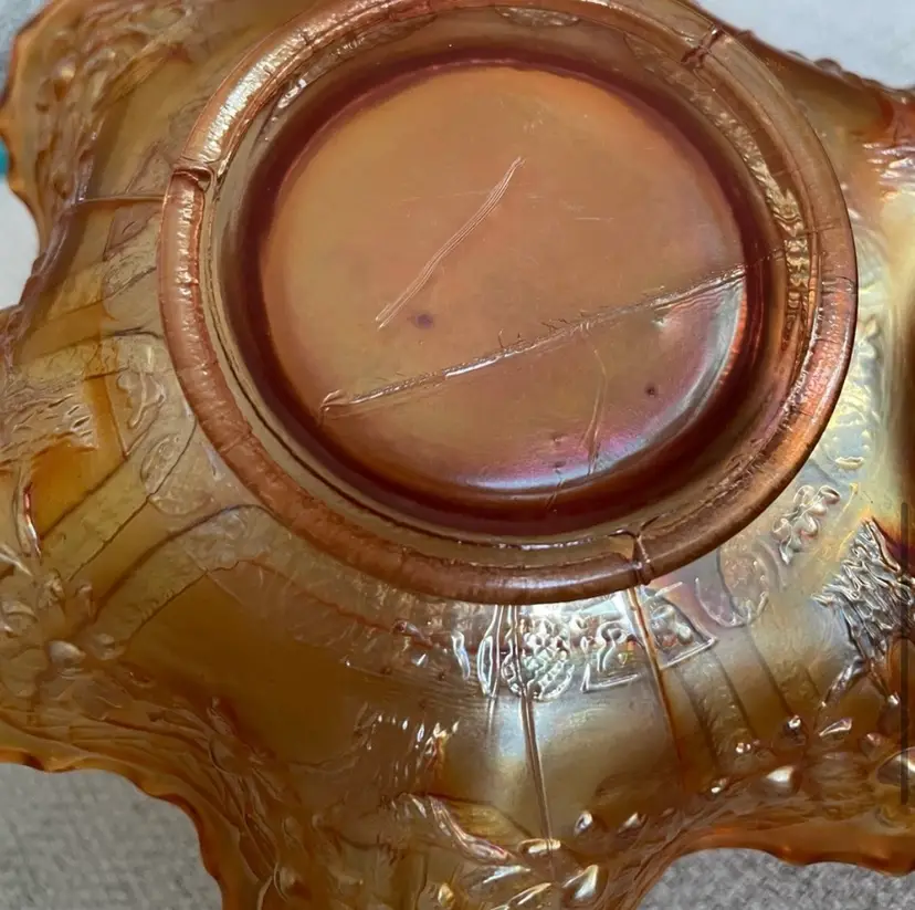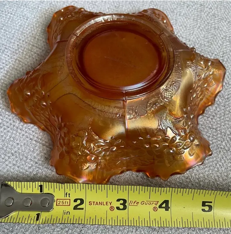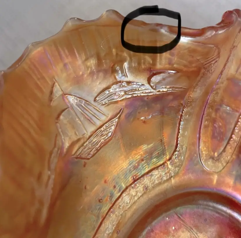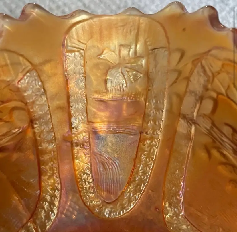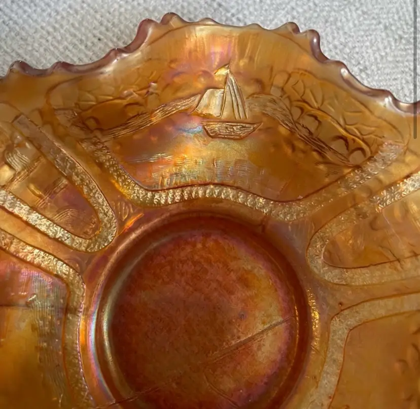 Carnival Glass bowl, gold iridescence, ruffled edge, sailboats, windmills and flowers. (One, hard to see, shallow chip, circled and shown from the bottom and the top. Lines are all mold marks, no cracks) Please see pictures for measurements.