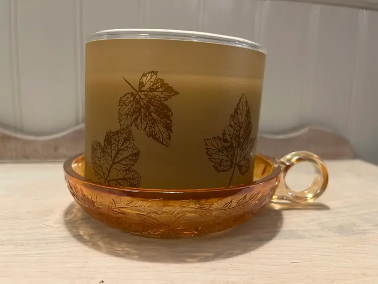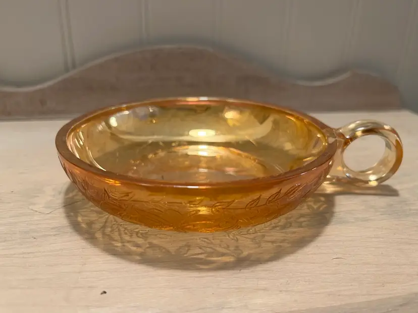 The color is a marigold or peach iridescent luster. featuring a single handle and a floral / leaf pattern around the rim.