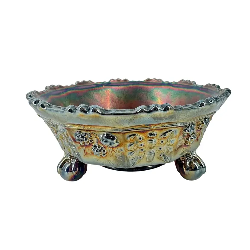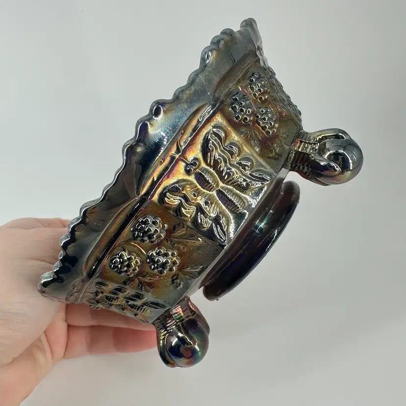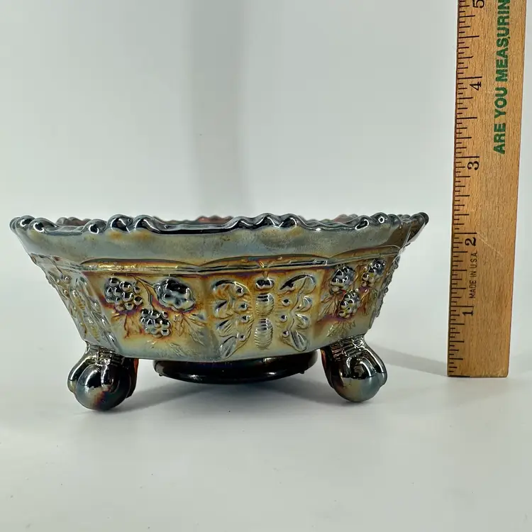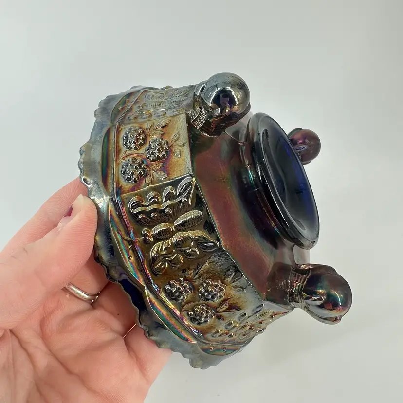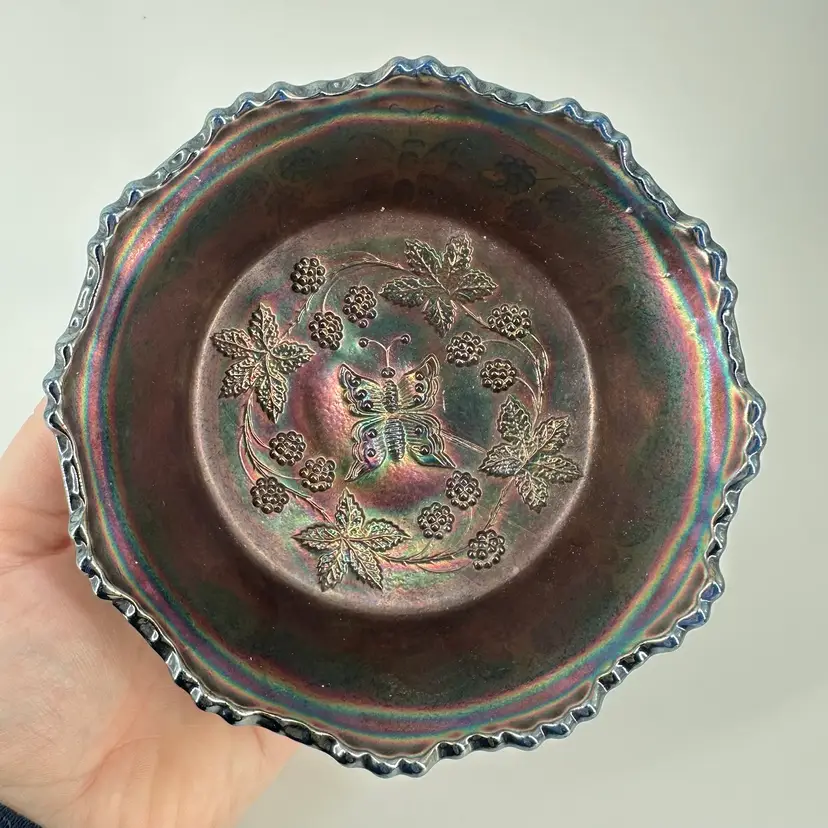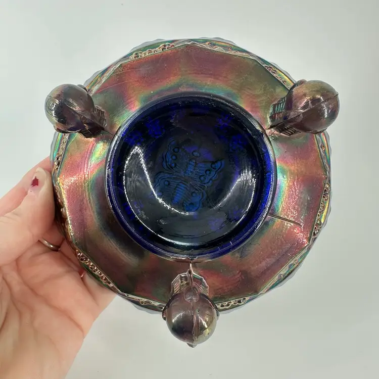 Cobalt blue carnival glass bowl featuring butterfly and berry designs on inside and around outside. Bowl measures approximately 2” tall and 5” across. No chips or cracks. No signatures or markings.
