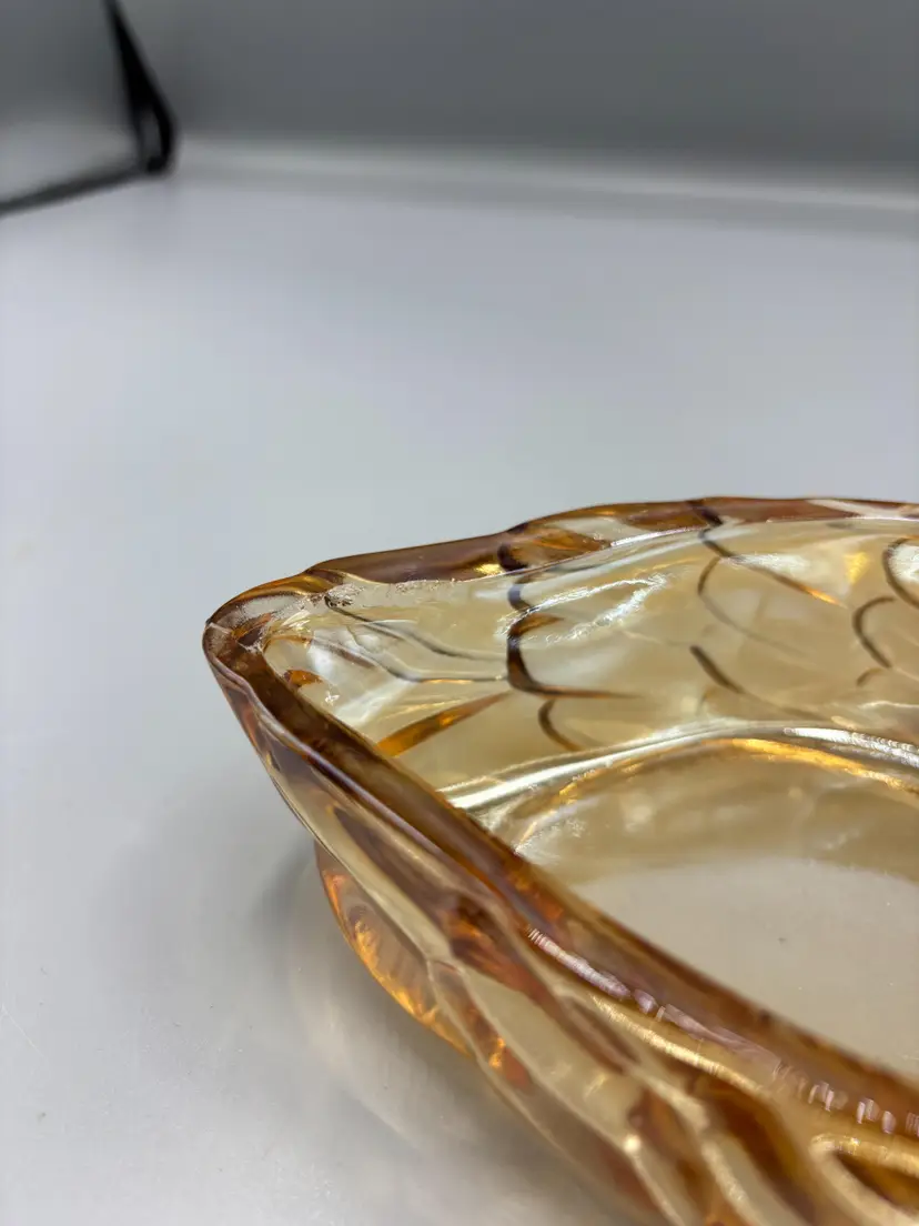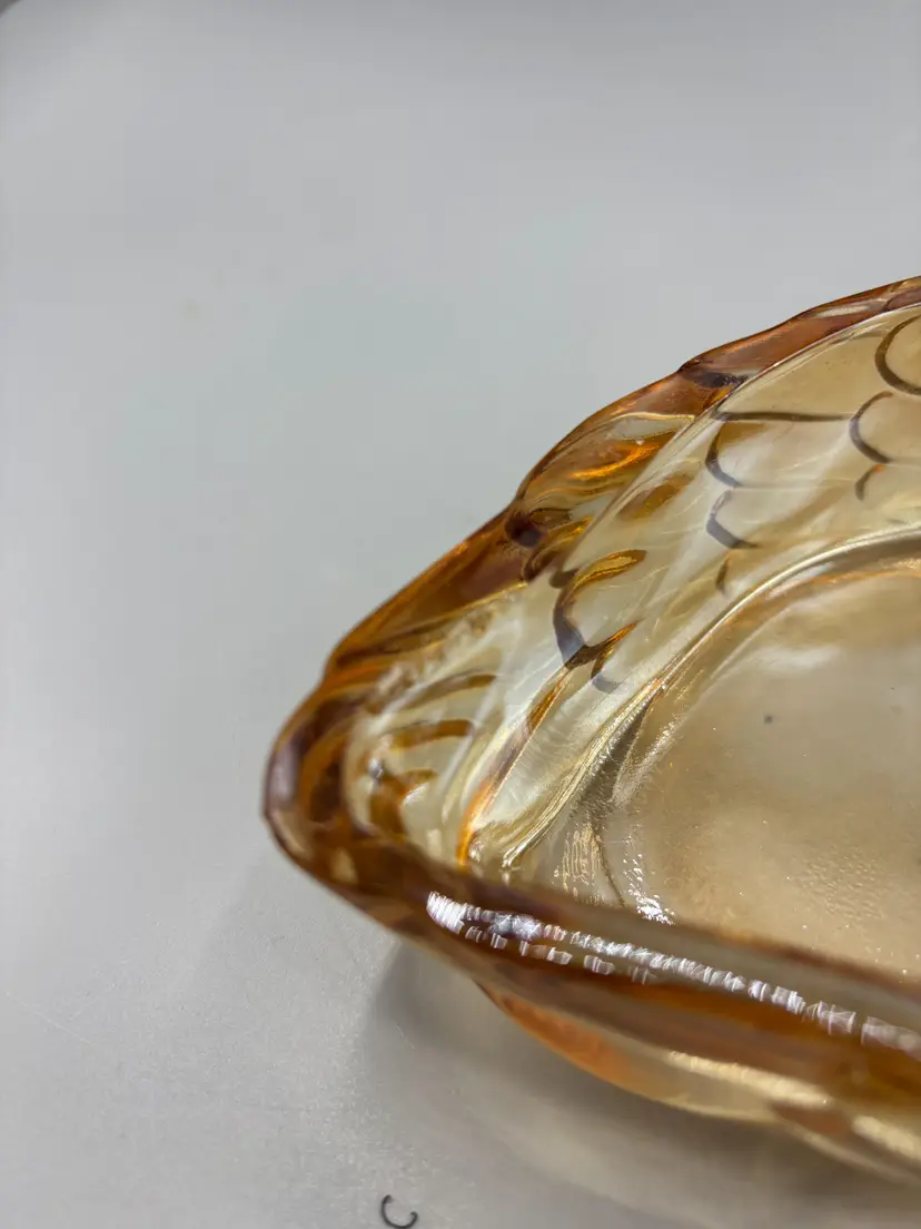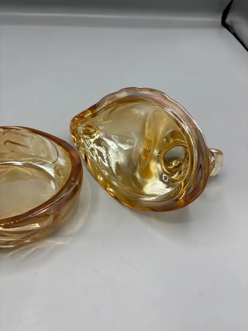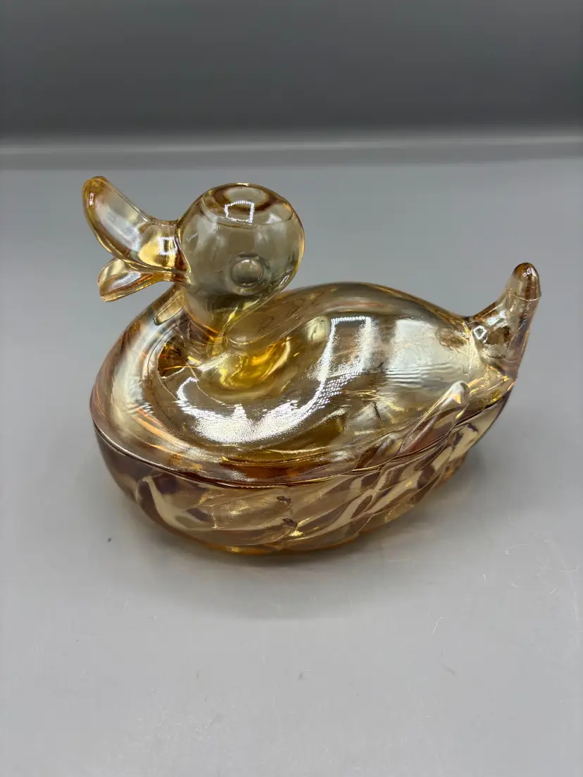 Carnival glass marigold duck that would look amazing in any Spring decor. This could be used as a candy dish, trinket dish, soap holder, and would definitely be a conversation starter. This has a small chip, refer to pictures for details.