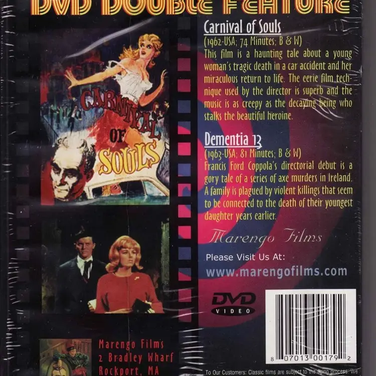 This double feature film DVD includes "Carnival of Souls (color 1962)" and "Dementia 13 (B&W 1963)."