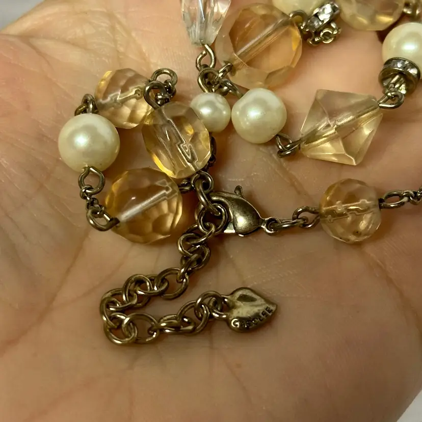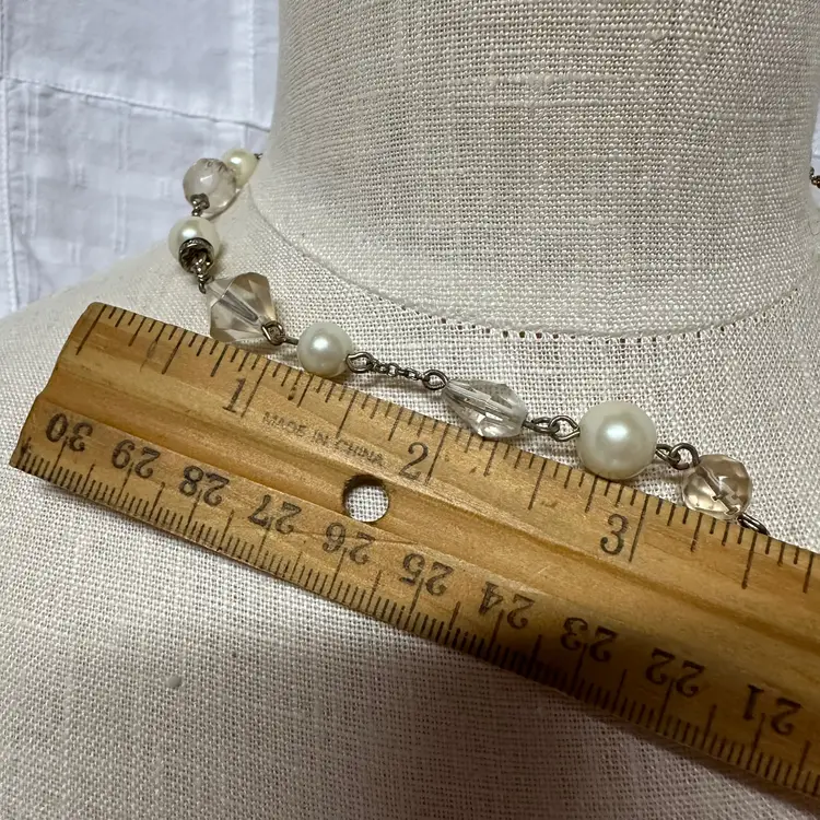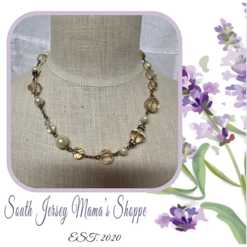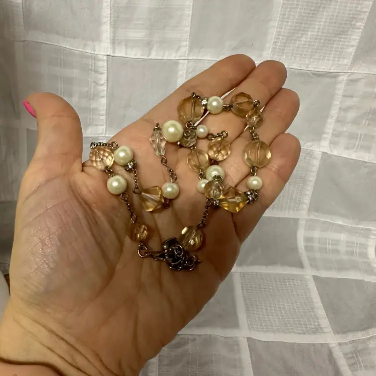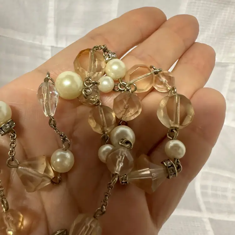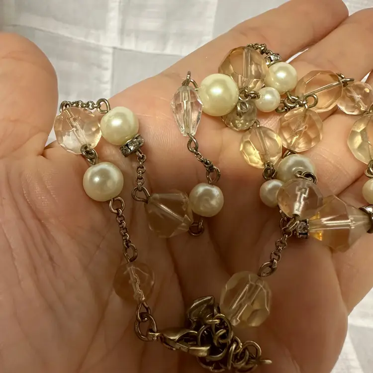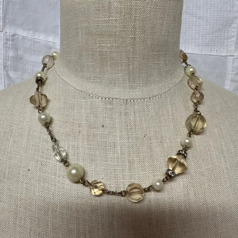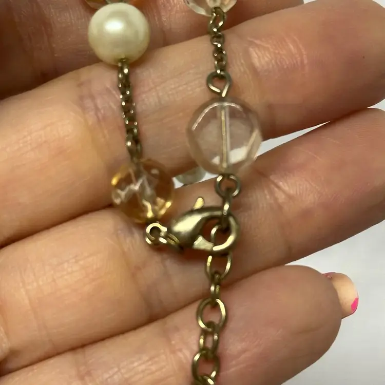 This beauty is a stunner!! The glass beads are cut beautifully. They are clear, and the other is rather hard to describe. It appears like a very pale pinky color, but when held to the light, and against different fabrics, it can also be a pale goldish. I am having trouble nailing it exactly. At any rate, it is pretty!! It is aprox. 16” with a 2” extender.
