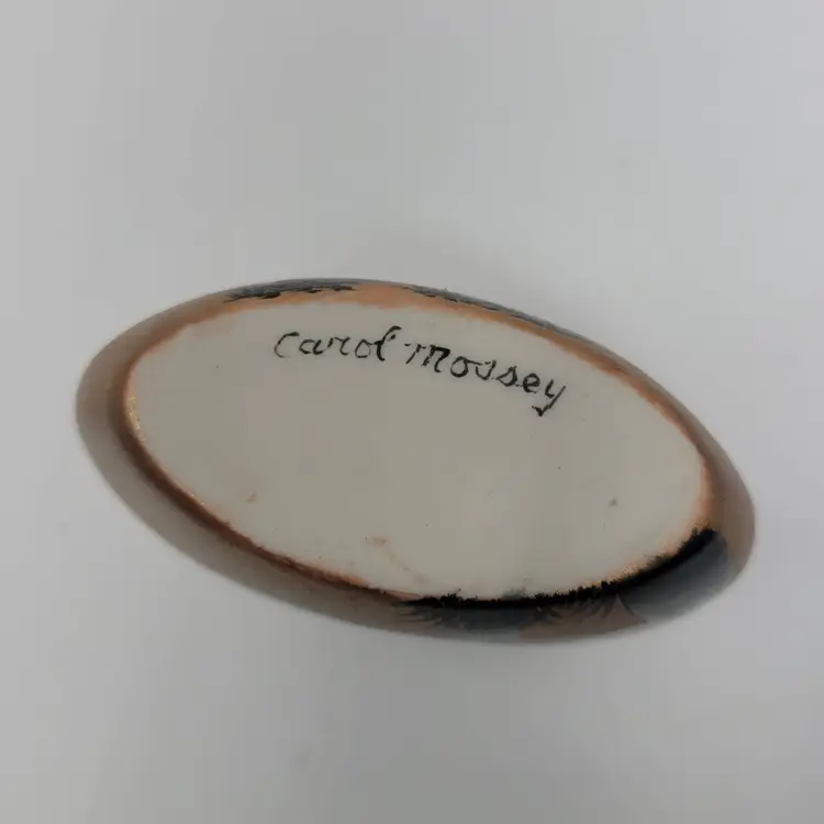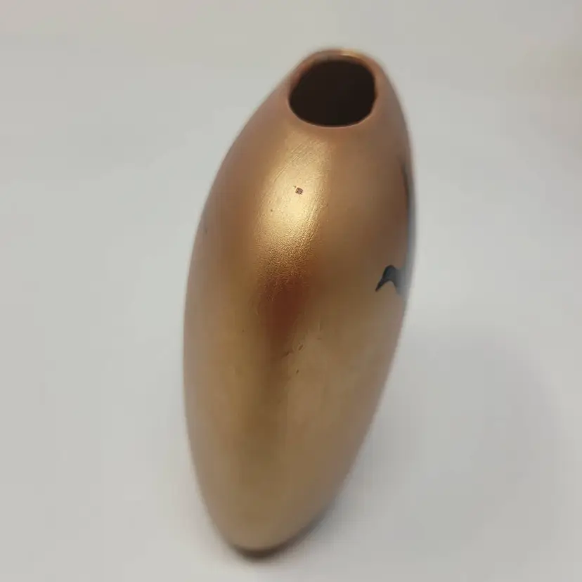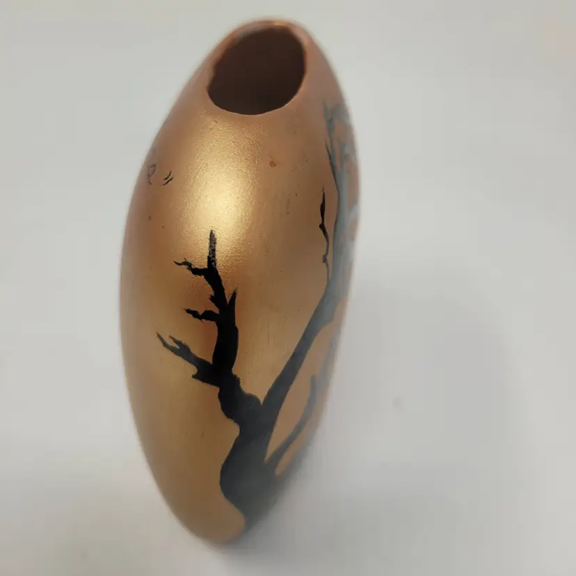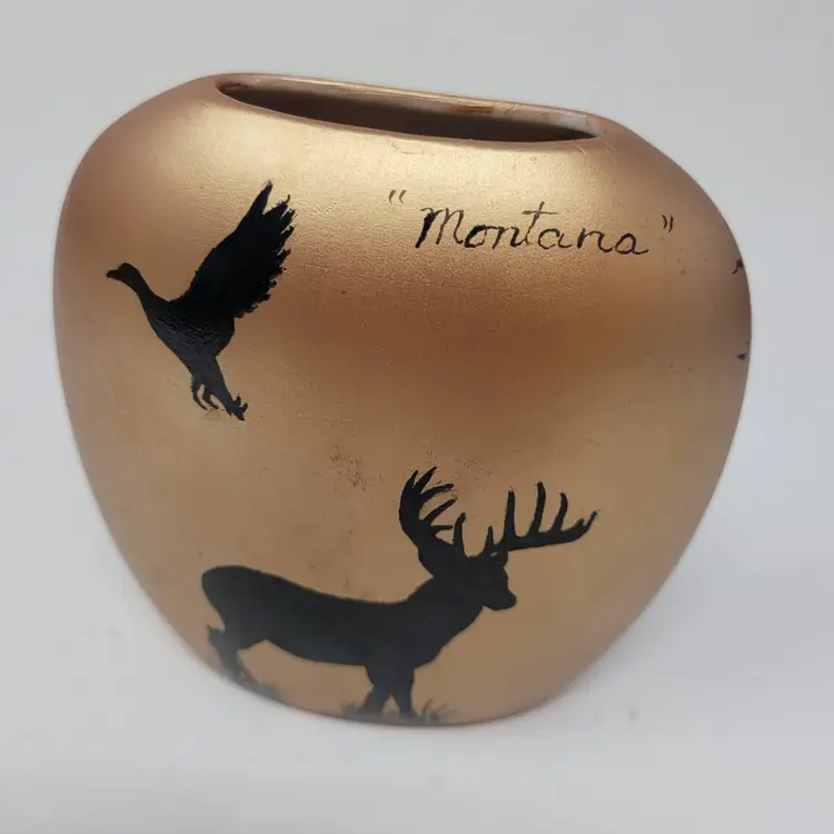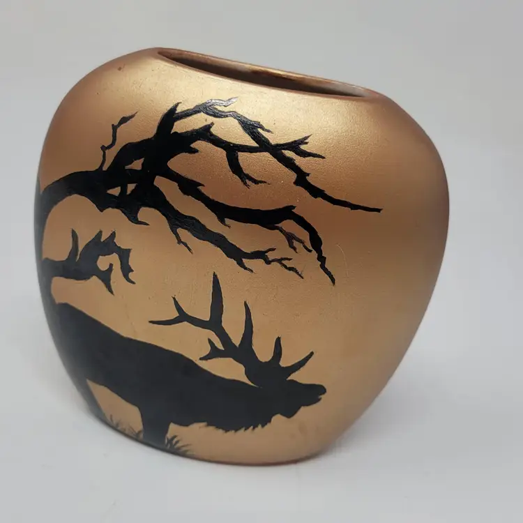 Thank you for your time. I found this unique vase it has the color of bronze and then it's painted with the black elk signed on the bottom. It is about 3.75 in tall and about 4 in wide and it's widest point The opening is about 2 in but only about a half inch wide.