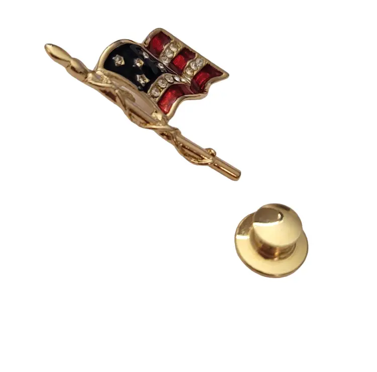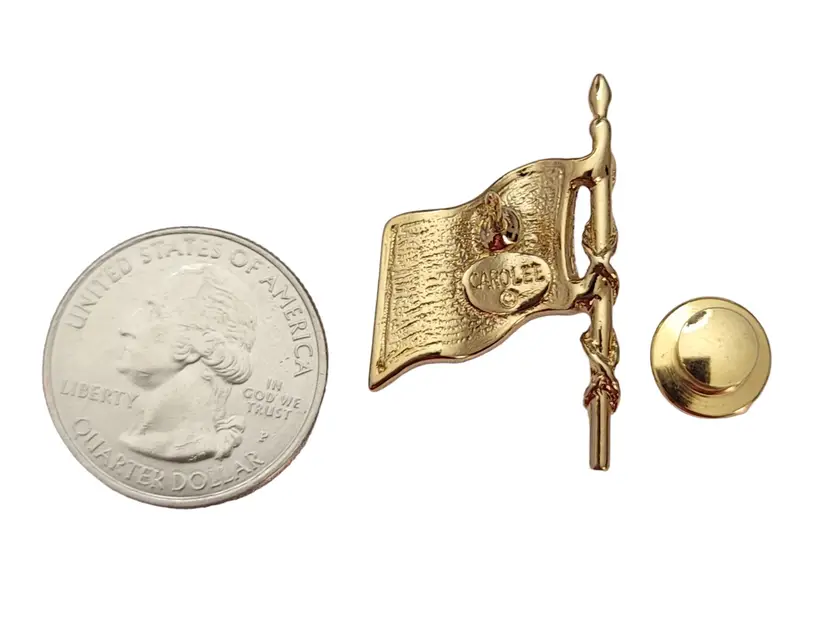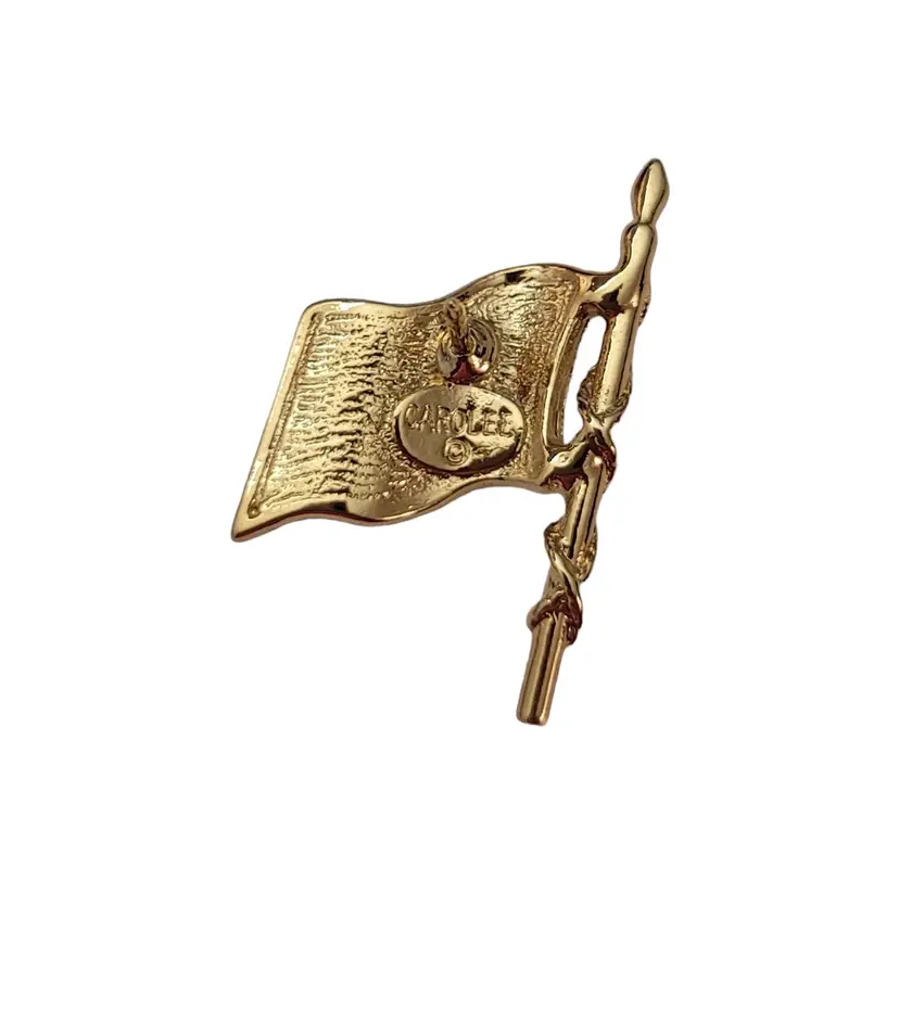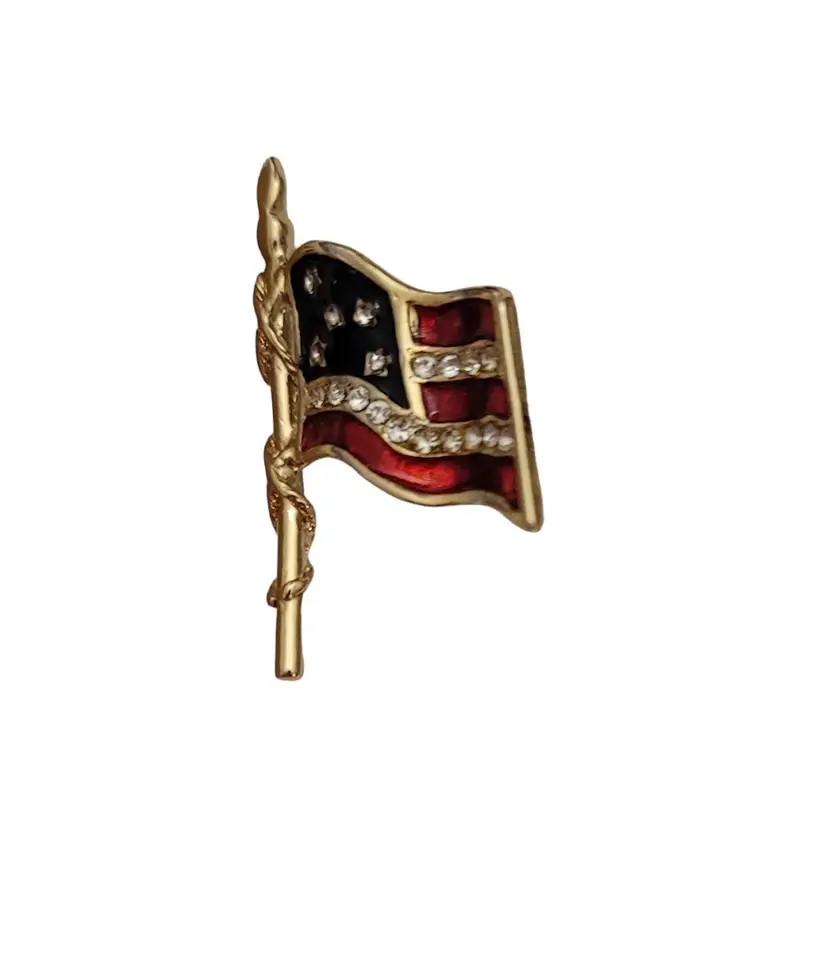 This beautiful Carolee American Flag Pin is sure to impress any recipient. Wearing this pin is a great way to honor your patriotism to your beloved country, the U.S.A. on holidays such as the Fourth of July, Memorial Day, and Election Day. It features a gold-tone US flag figure with red and blue enamel details and is elegantly decorated with faceted clear rhinestones paved set along the flag's stripes and star designs. The flag pole has a gold-tone rope wrap adding depth to this piece. The back is marked CAROLEE © on an oval cartouche. It has a deluxe clutch clasp pinback, offering an elegant and professional look with excellent quality, allowing this lapel pin to be easily attached to clothing or accessories.