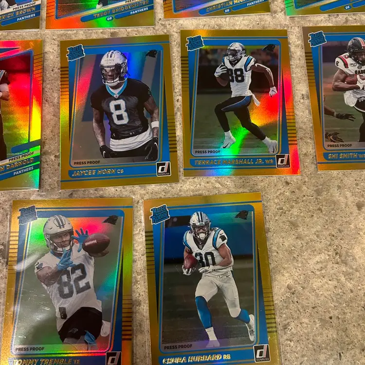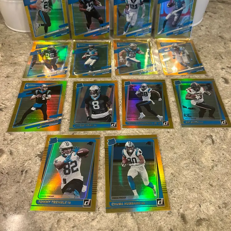 Donruss complete Carolina Panthers Team Set Press Proof Gold Premium Stock 2021 (first year premium press proof stock gold) including Chubbs Hubbard Rated Rookie will ship BMWT ($5). Progressive shipping of $.25 per item.