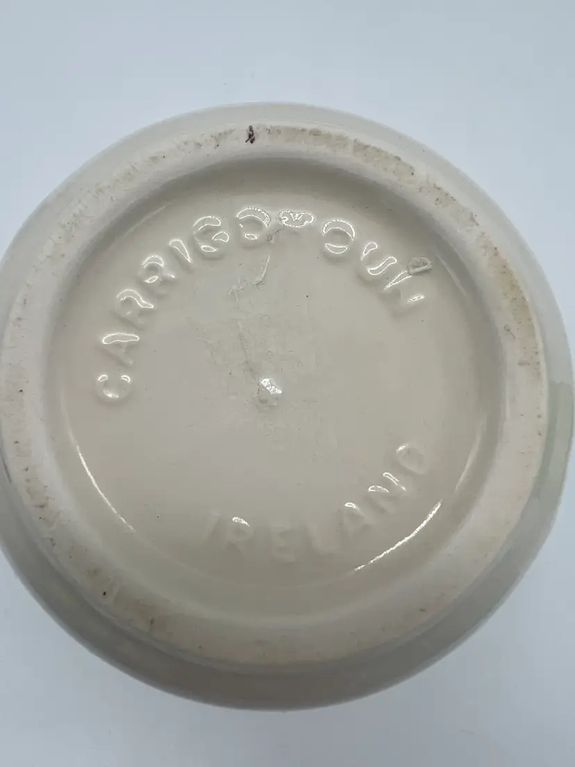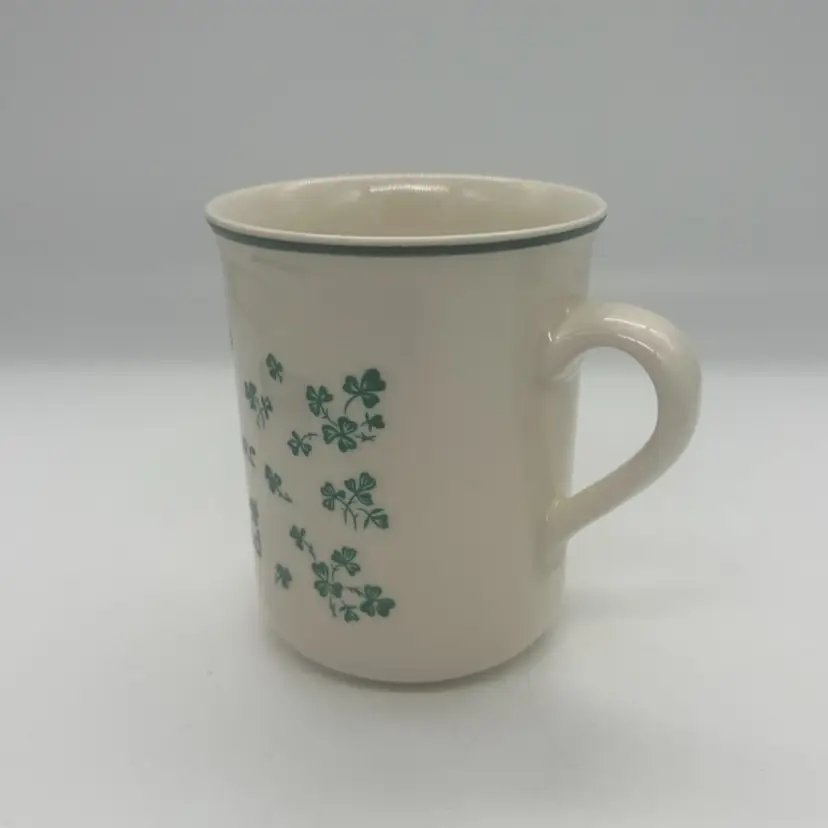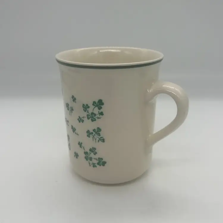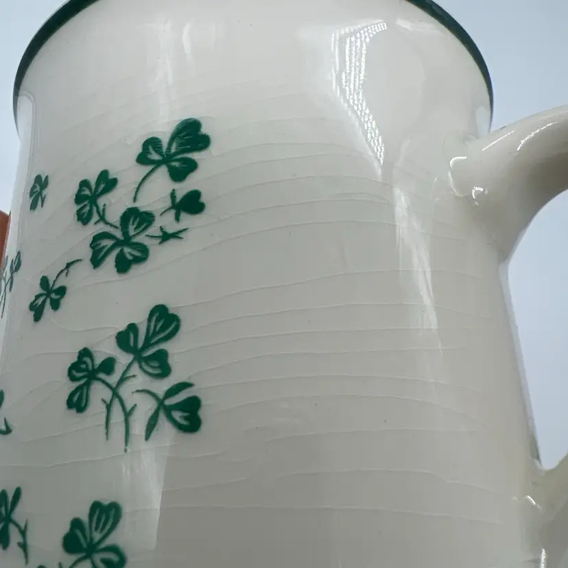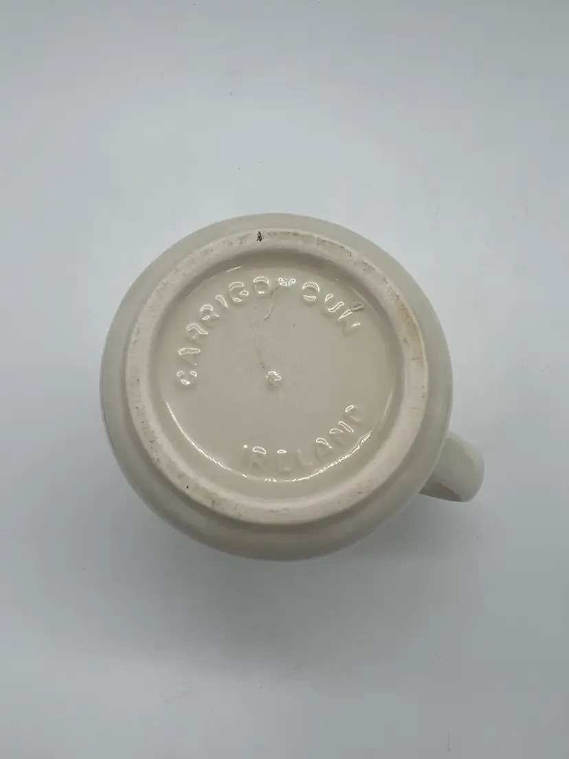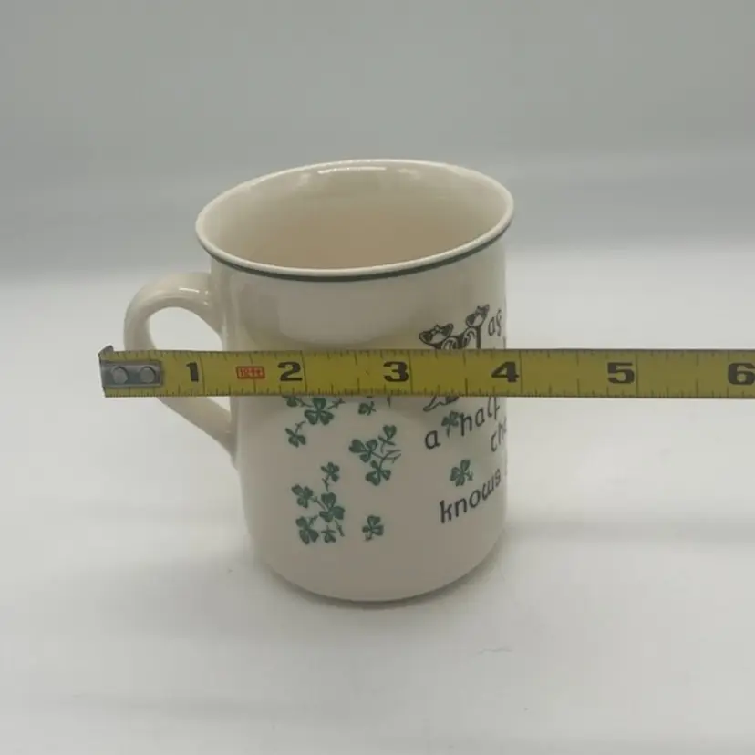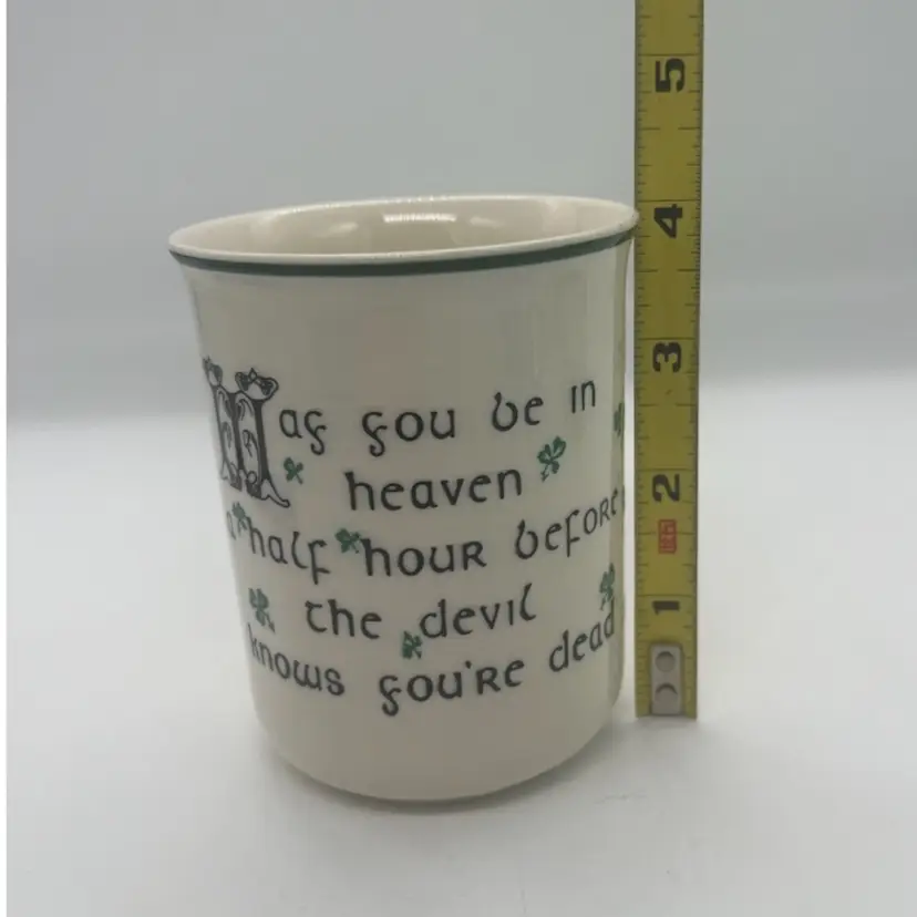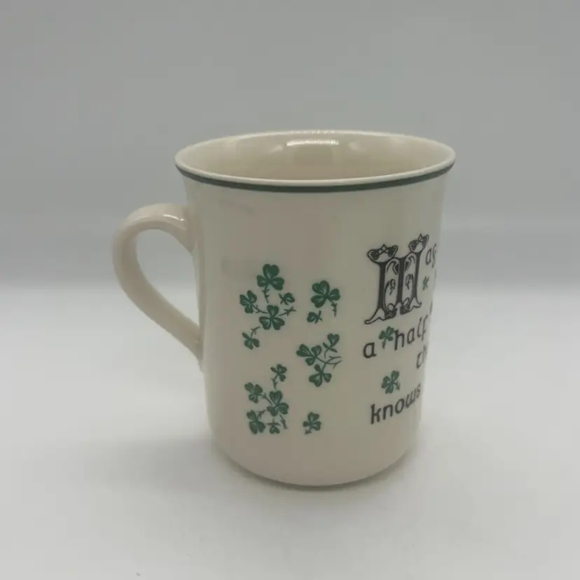 The Carrigdhoun Ireland Mug is a vintage collectible featuring a unique shamrock pattern and Irish saying, perfect for celebrating St. Patrick's Day. Made of clay, this mug has a 3 1/4 inch diameter and stands at 4 inches tall. The mug showcases a dark humor with a heaven/devil saying, adding a playful touch to your kitchen or home decor. Proudly originating from Ireland, this mug is a must-have for any St. Patrick's Day enthusiast looking to add a touch of Irish charm to their collection.