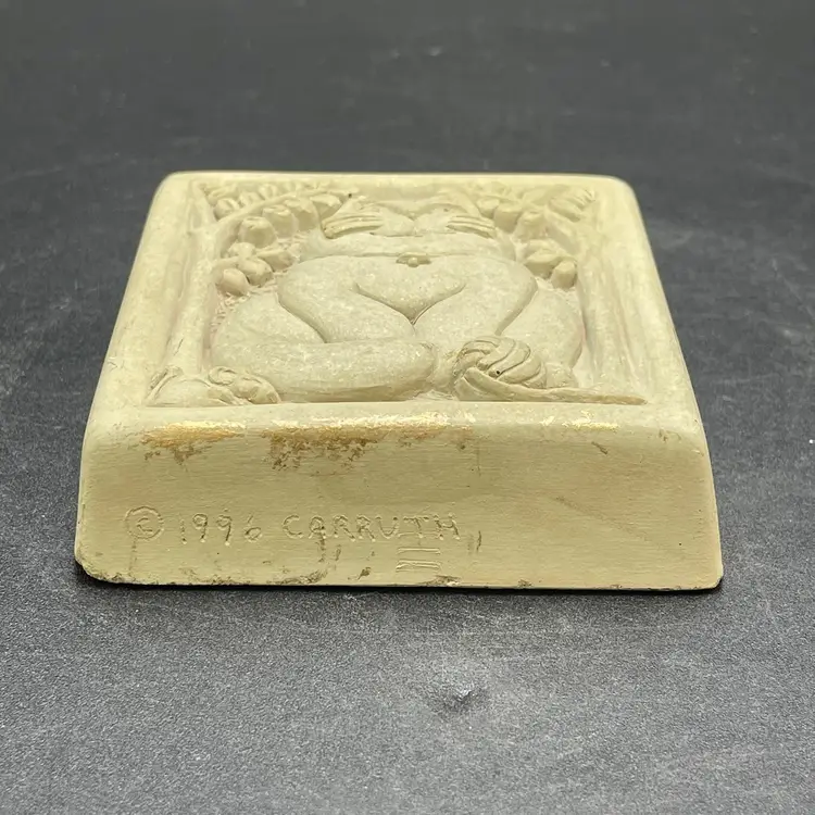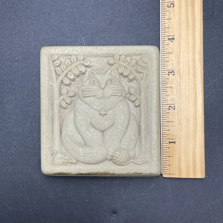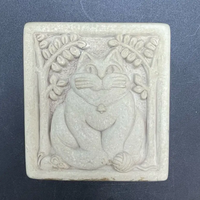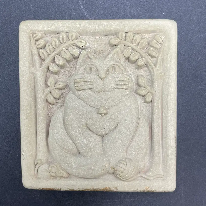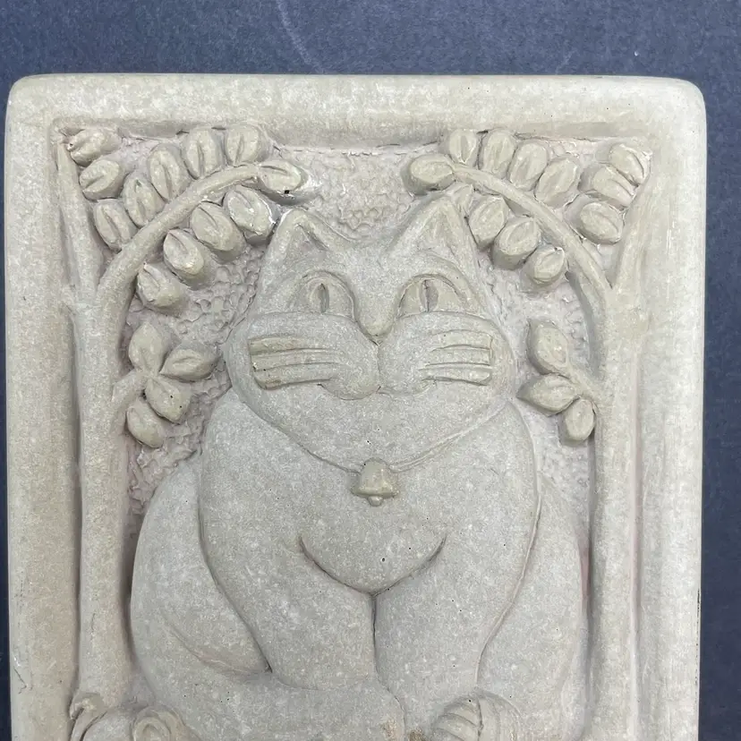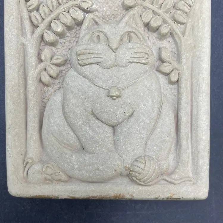 This is a vintage 1996 Carruth Studio Fat Cat stone wall plaque. Marked on the side. Made in the USA. Measures approximately 3.5" x 3.5" x 1". No chips or cracks.