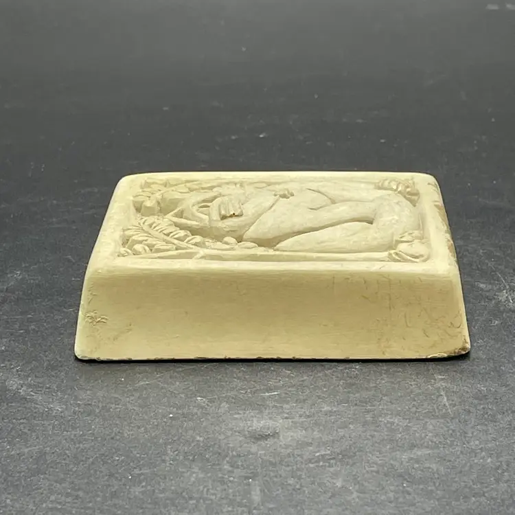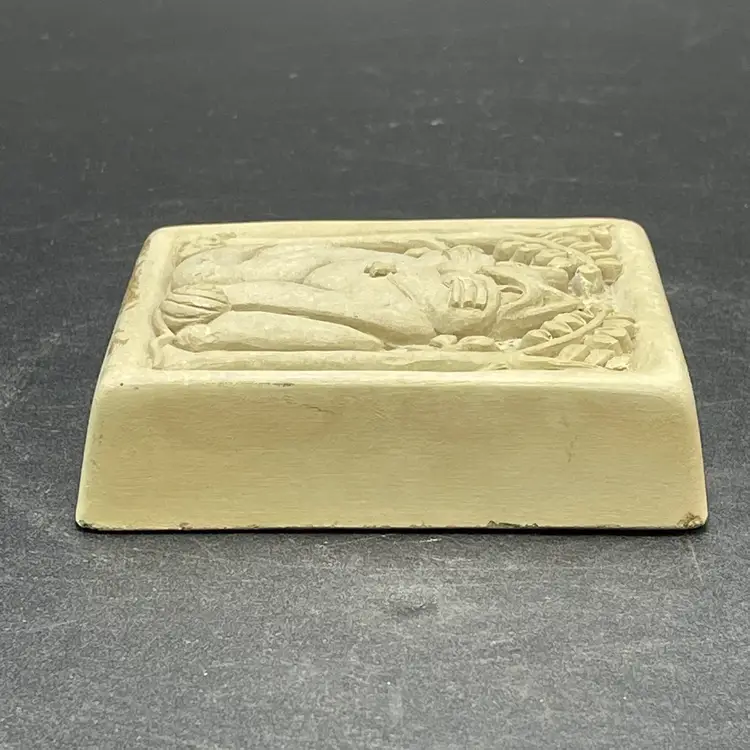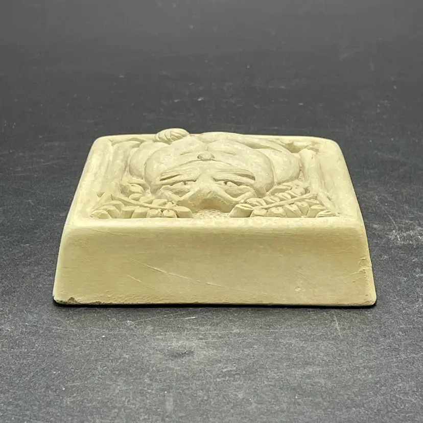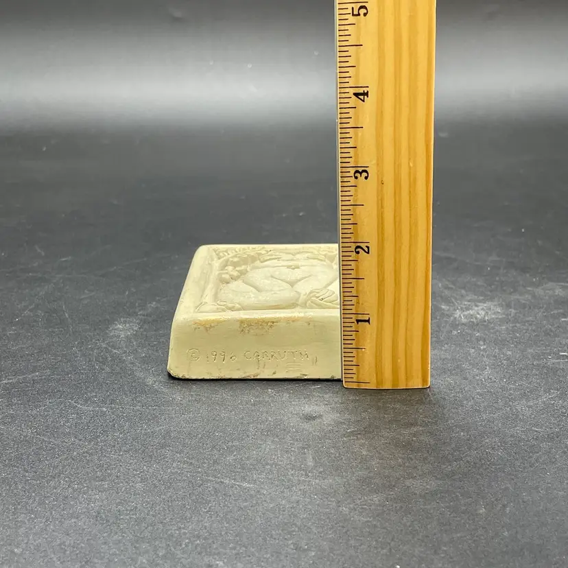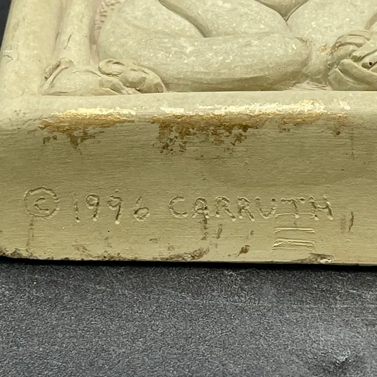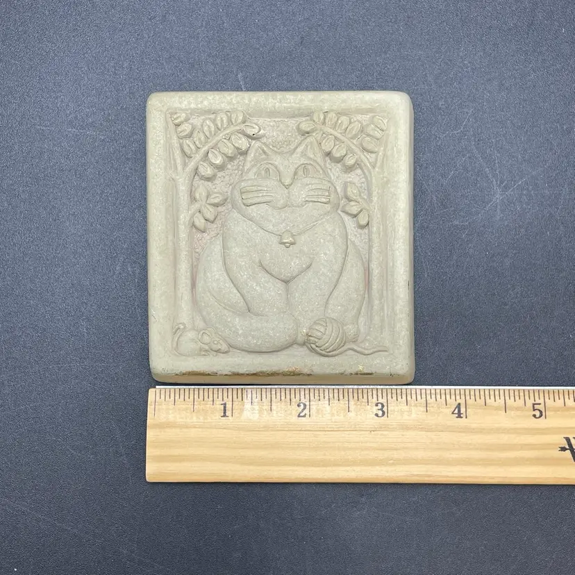 This is a vintage 1996 Carruth Studio Fat Cat stone wall plaque. Marked on the side. Made in the USA. Measures approximately 3.5" x 3.5" x 1". No chips or cracks.