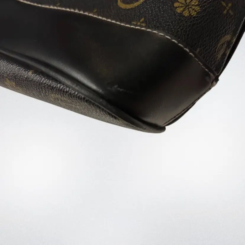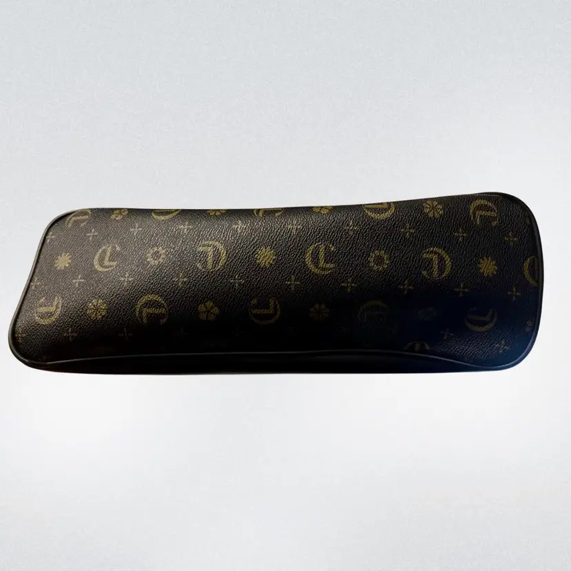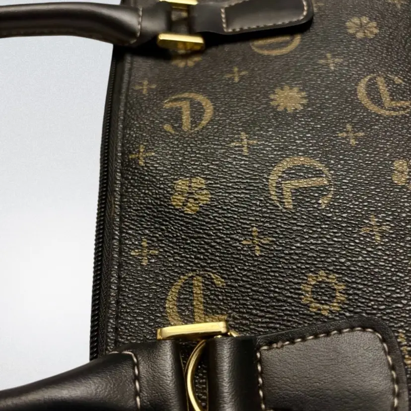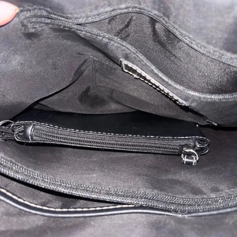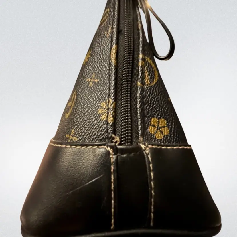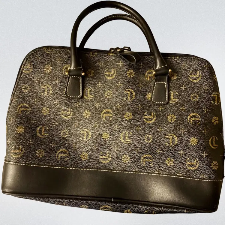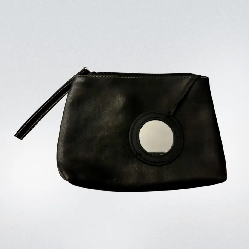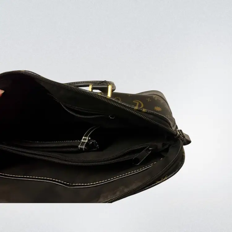 Approx. 14”x 9” Like new condition! I found 2 very tiny scratches that may even buff out (see photos) clean inside and out, no smells. It comes with a zippered cosmetic bag with a round attached mirror and a zippered change purse with the id window. Black and gold. No wear on the handles!