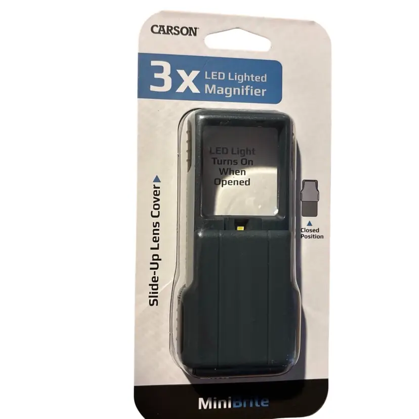 Carson MiniBrite 3x Magnifier Power LED Lighted protective Slide up lens cover. Enjoy three times the power of reading in dark situations as well