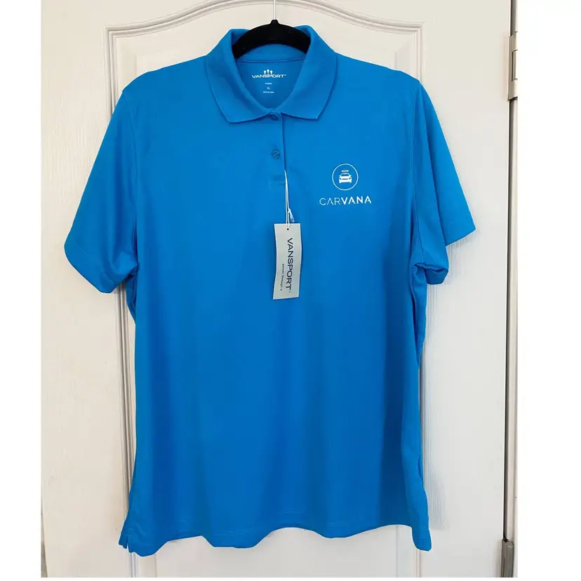 Carvana Women’s Short Sleeve Polo Shirt Blue Vansport Employee Uniform Brand new with Tags, no flaws Collared uniform short sleeve women's polo shirt, with buttons Moisture wicking material 100% Polyester Size XL Measurements taken flat: Armpit to armpit: 23” Shoulder to hem length: 27" Machine Wash Cold, tumble dry low