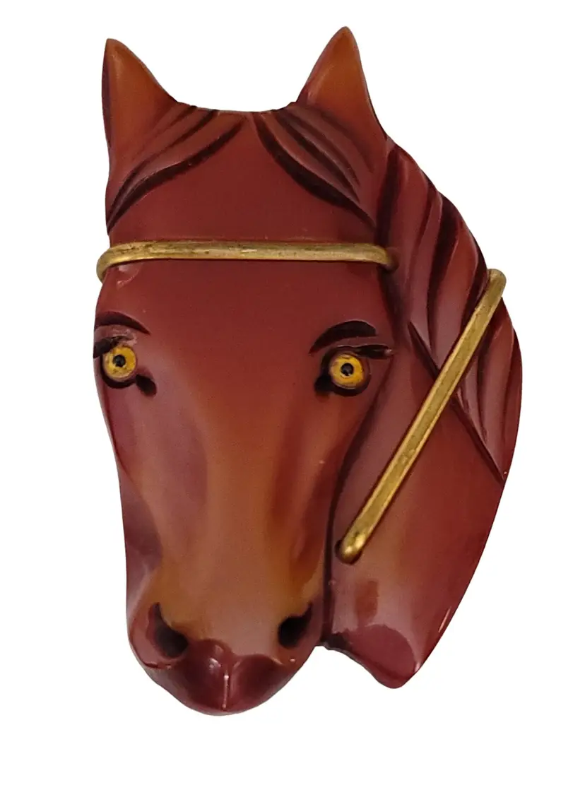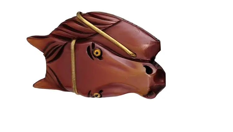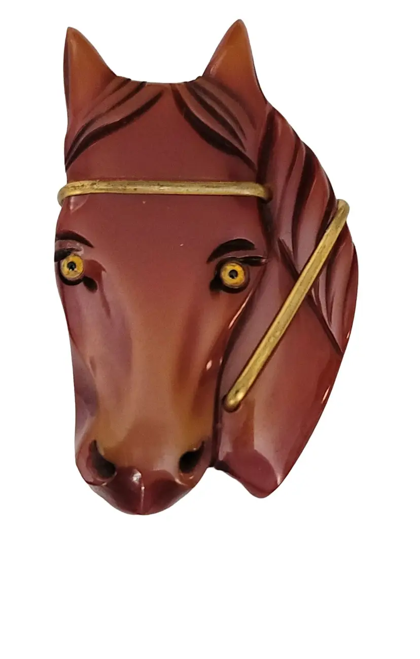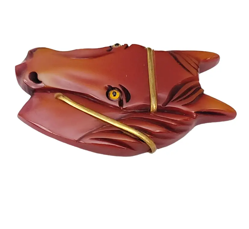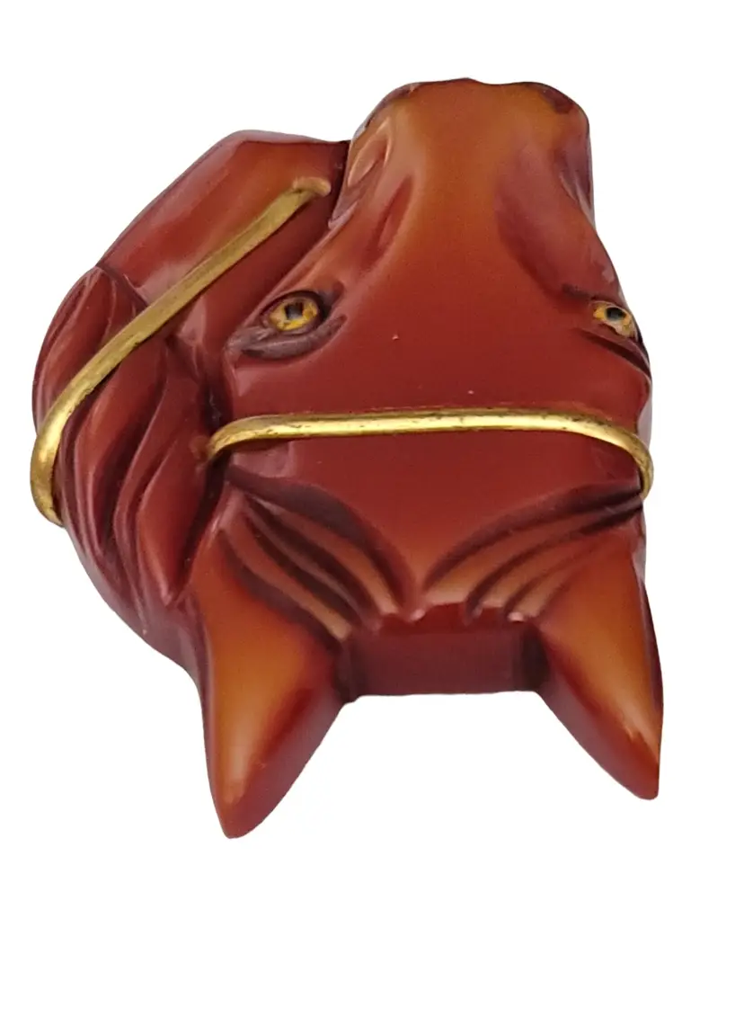Carved Chestnut Bakelite Horse Glass Eyes Pin Brooch