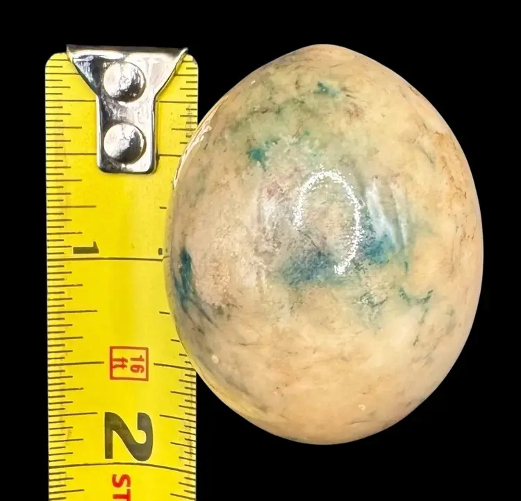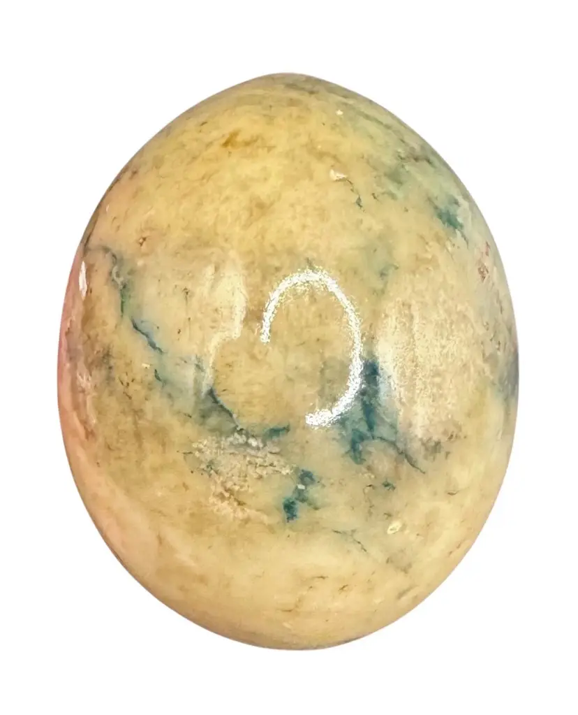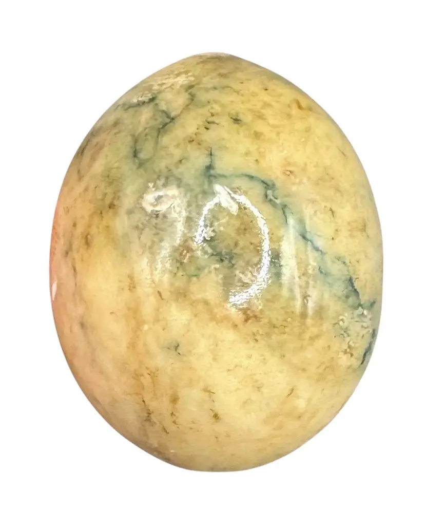 Unidentified mineral carved in the shape of an egg. It is a pale yellow with green streaks running through it.