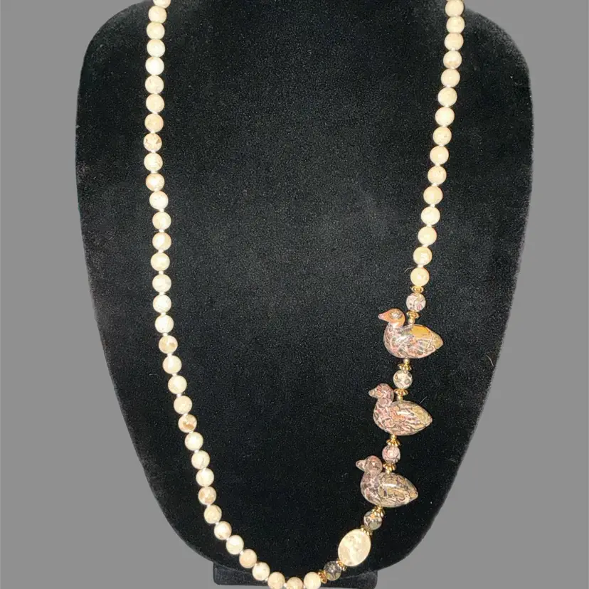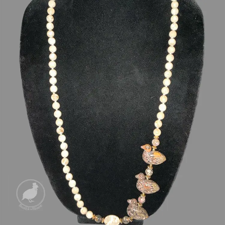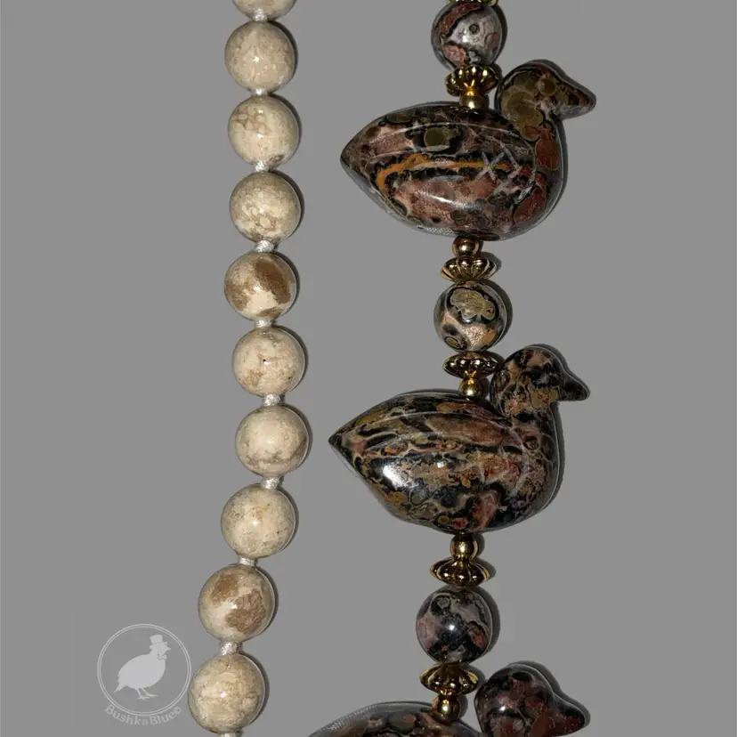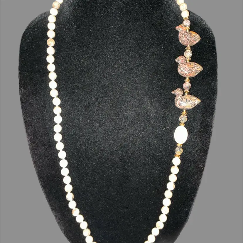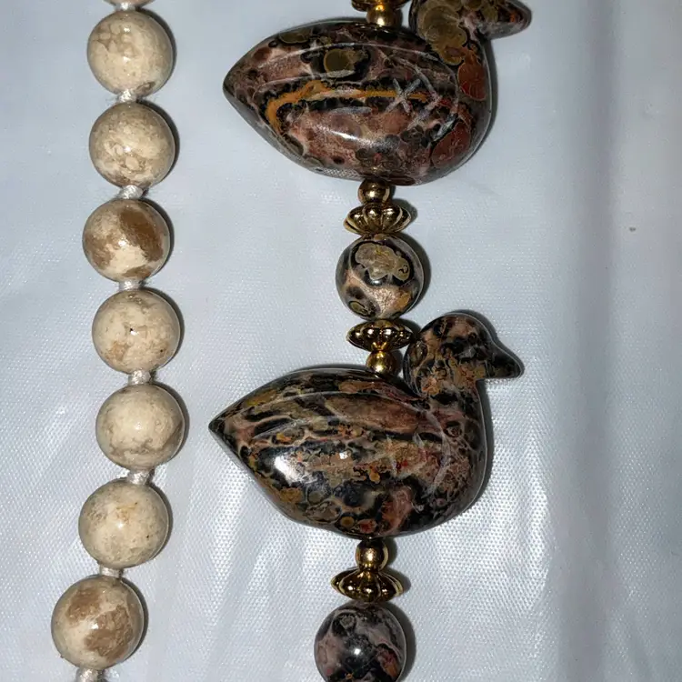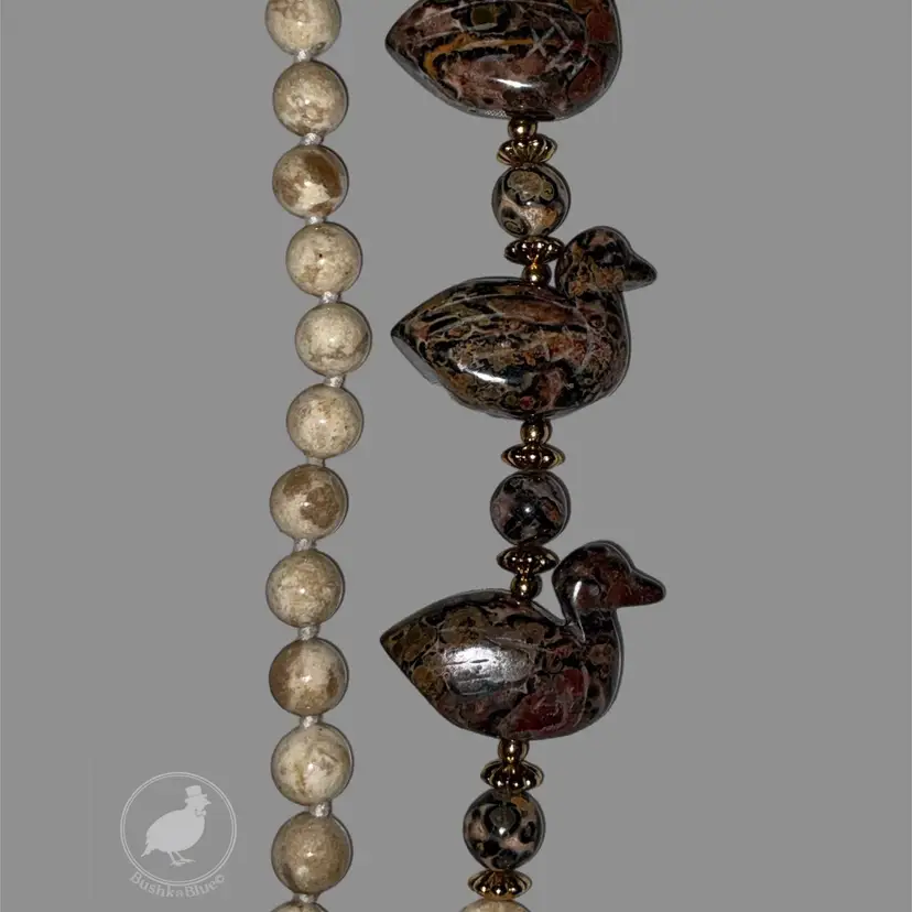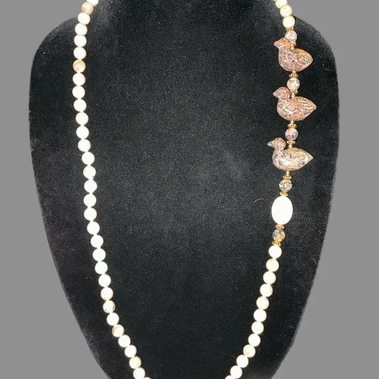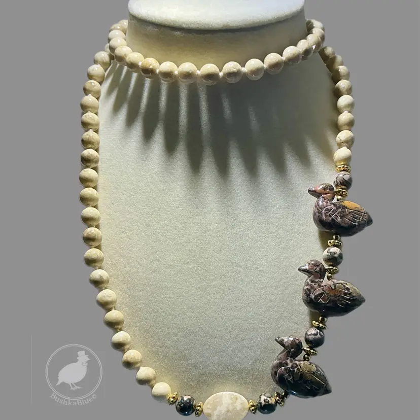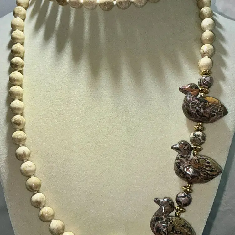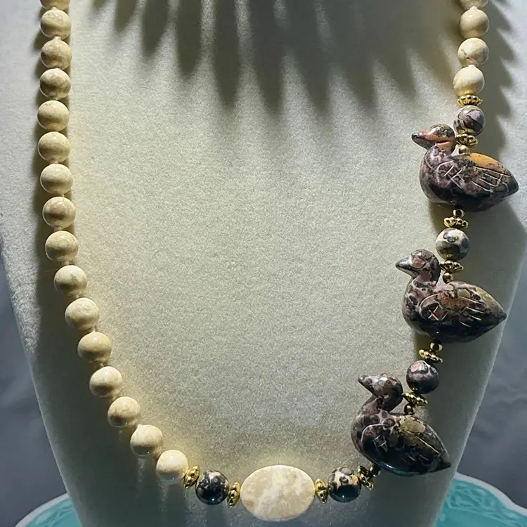 Really fun artisan-style necklace with carved stone ducks and earthy jasper beads.