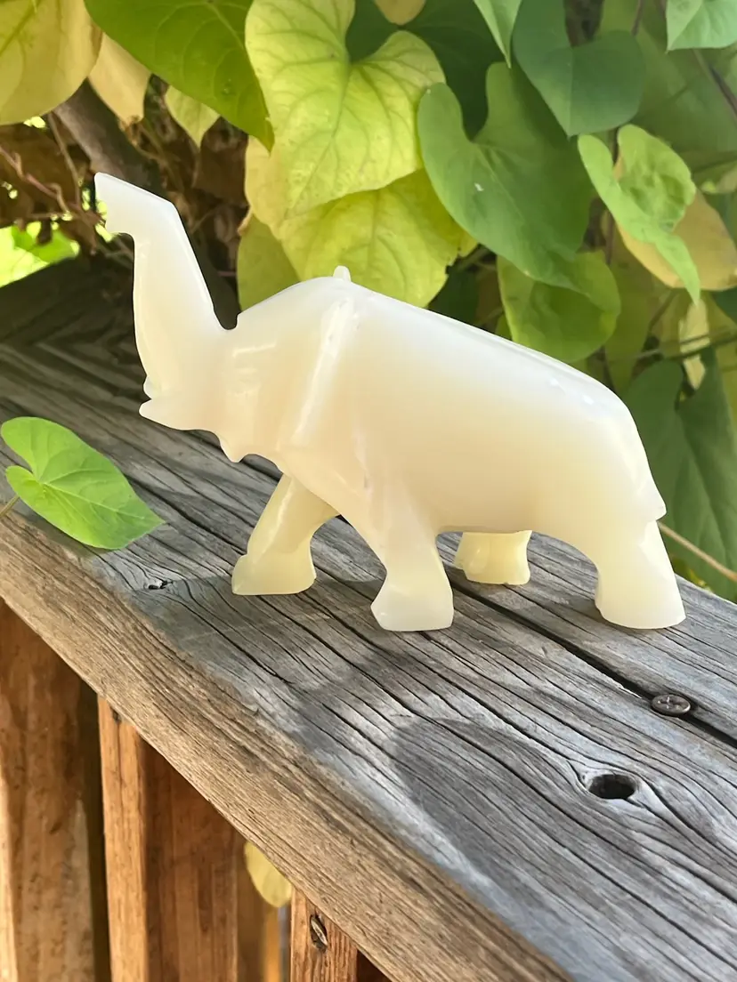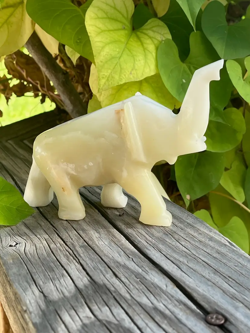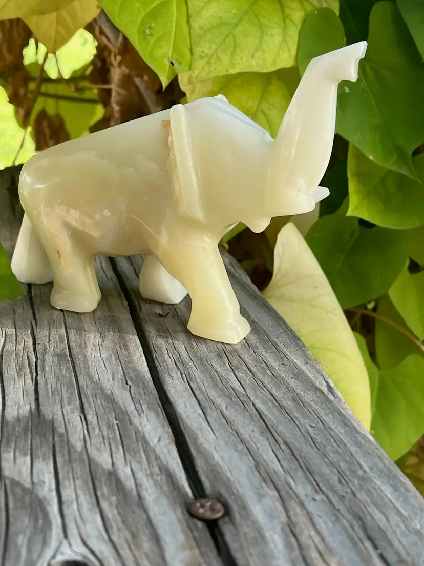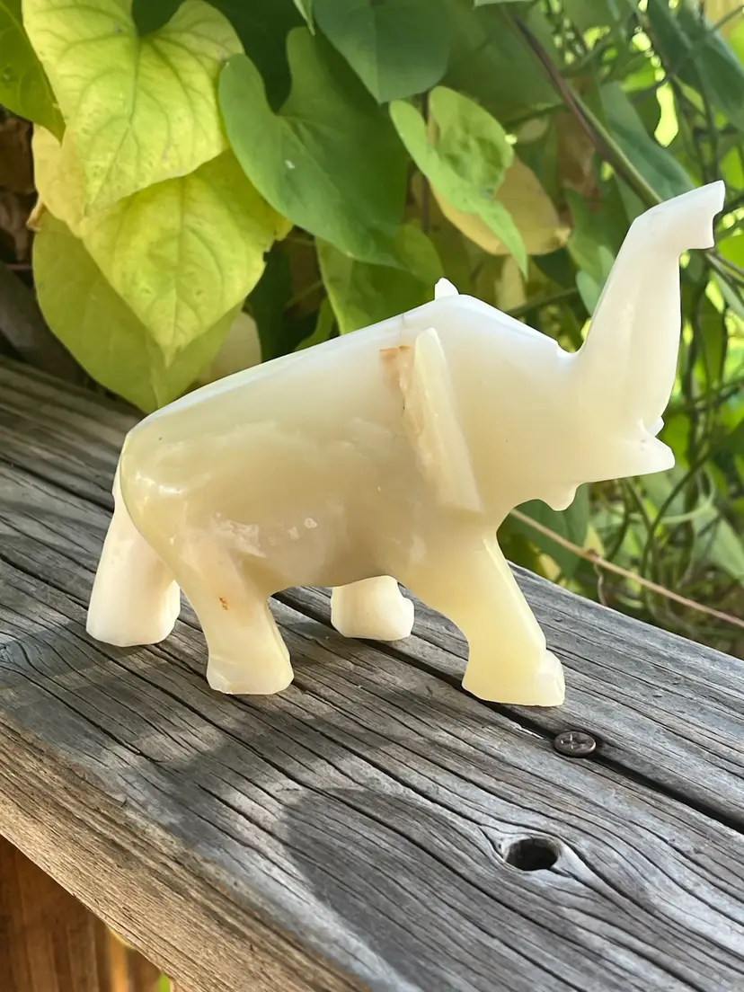 A carved onyx elephant. 515 grams. Approximately 4 inches tall, 5 3/4 inches long and 1 7/8 inches wide. One rough spot on the bottom of a rear leg. It is not noticable. Cool elephant!