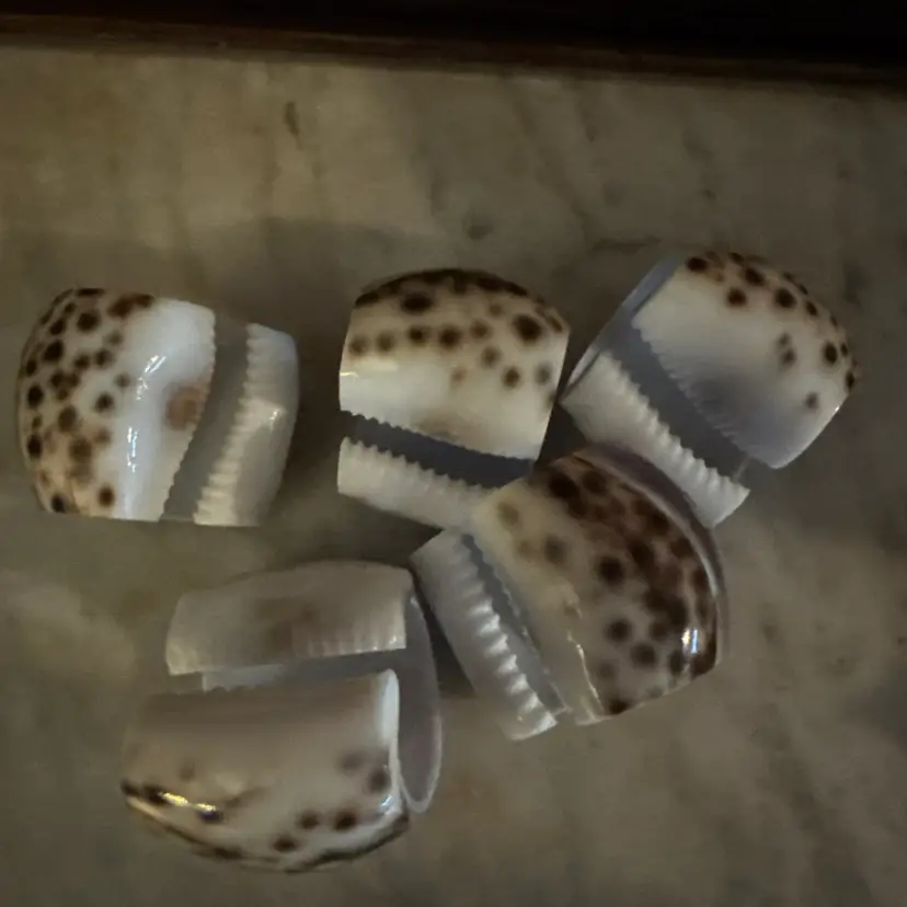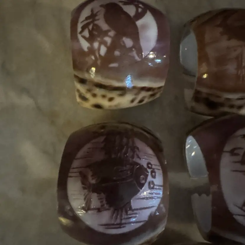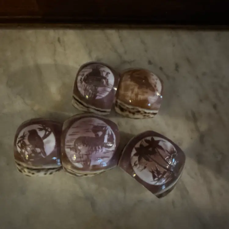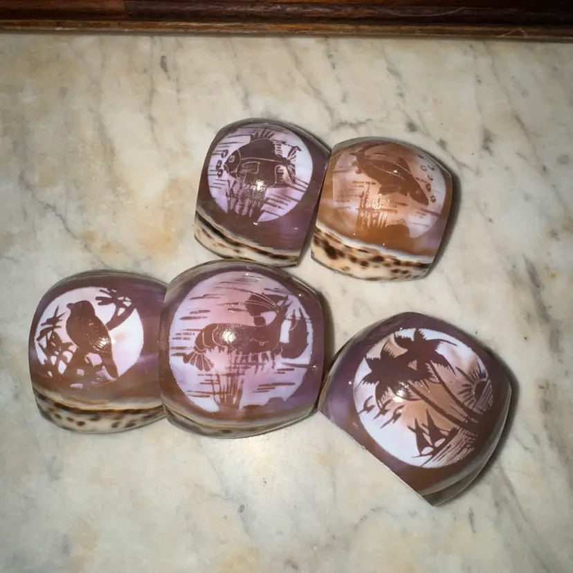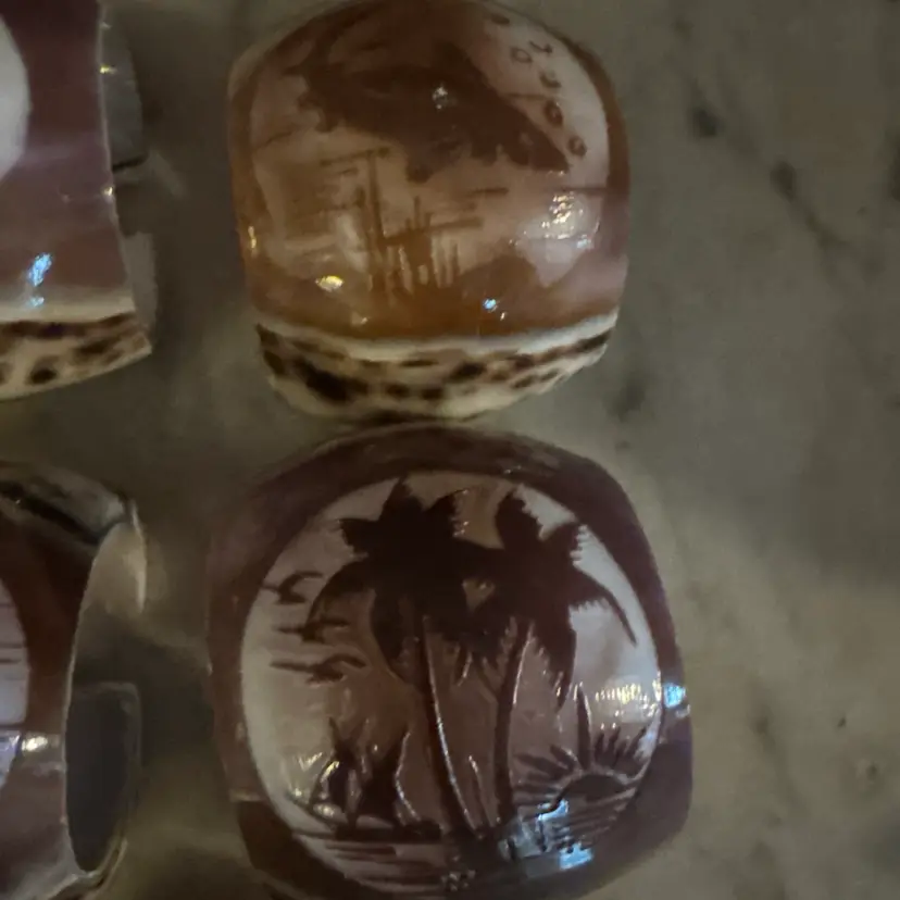 Carved Sea Shell Napkin Rings (5) Bird,Fish,Crab,Palm tree,and shark