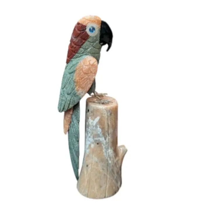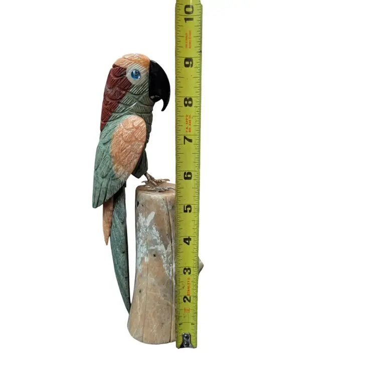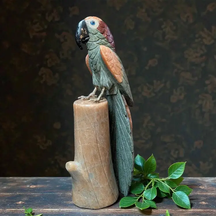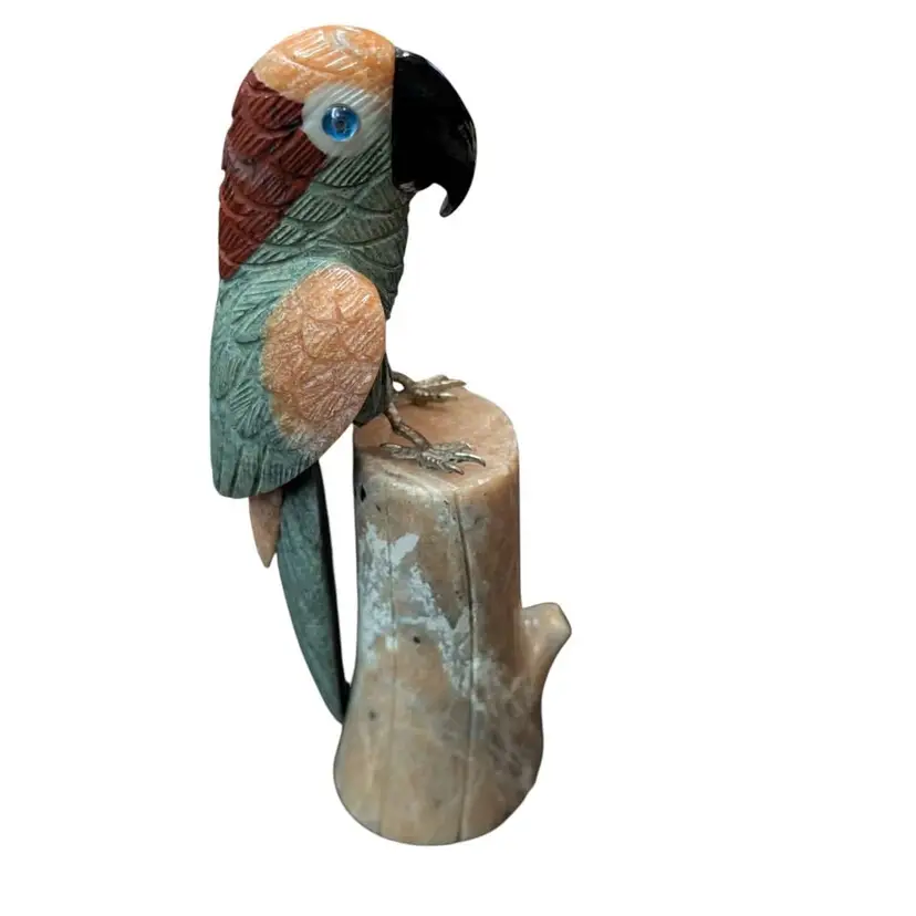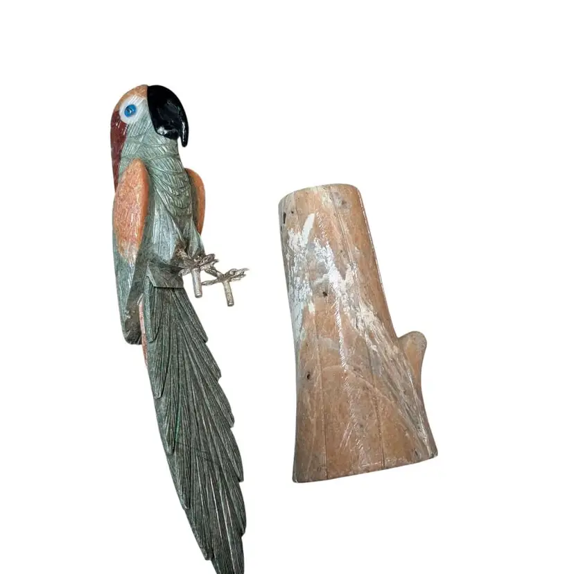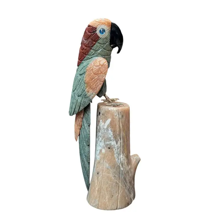 Carved Stone Unakite Blue Quartz Jade Sodalite Parrot Bird On River Stone Log. This is an amazing piece - this full parrot and the log it sits on are all made from carved stone. The parrot has brass feet with pegs that sit inside the log for it to "perch". The details and colors of this are just awesome and it is in overall excellent condition, no chips or cracks. This stands about 9.25" tall and would make an excellent gift for a rock hound or a bird lover! Weighs in just under 3#s