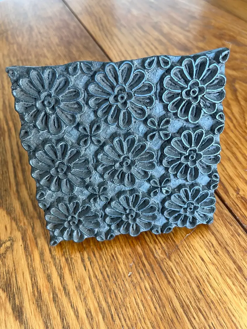 This particular block, with its repeating daisy pattern, is characteristic of designs used for everyday fabrics and decorative items. Such blocks were essential tools for artisans, allowing for the mass production of beautifully patterned textiles before the advent of modern printing technologies. They are now sought after by collectors and crafters for their historical significance and aesthetic appeal.