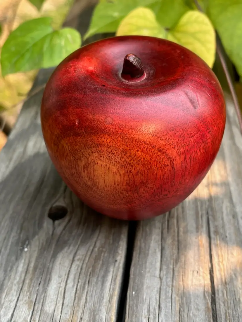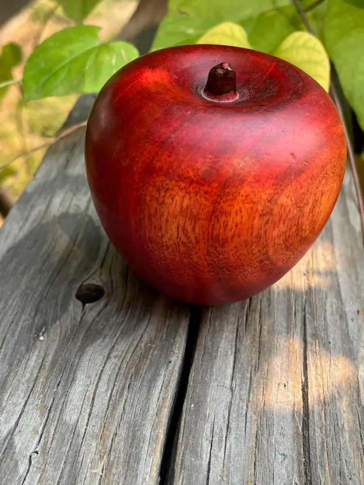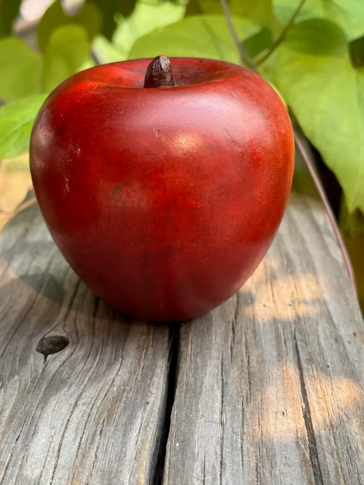 An older carved wooden apple. It is approximately 3 inches tall and 2 3/4 inches wide. A few wee dings.