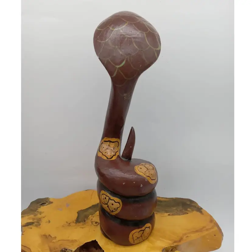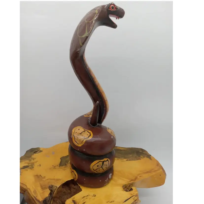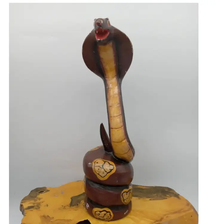 Here's a cool wooden snake made in Indonesia. He's 13 3/4 inches tall and the base is 3 3/4 inches in diameter. He's a little scuffed but otherwise in great condition.
