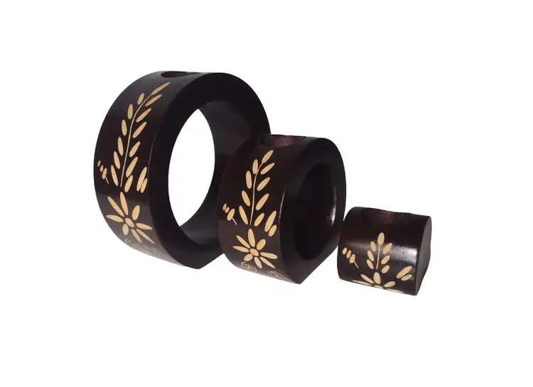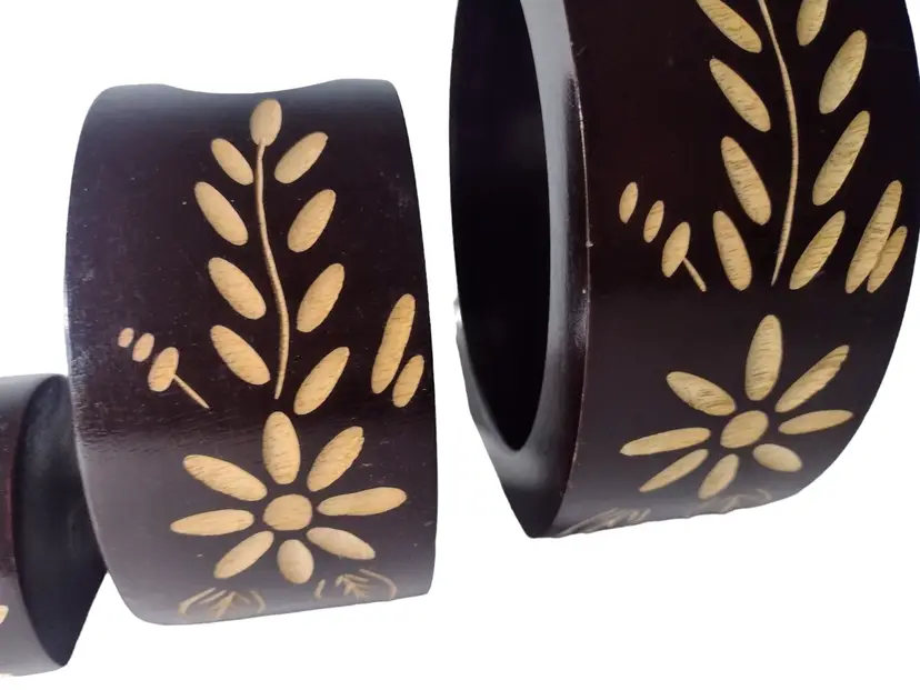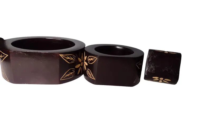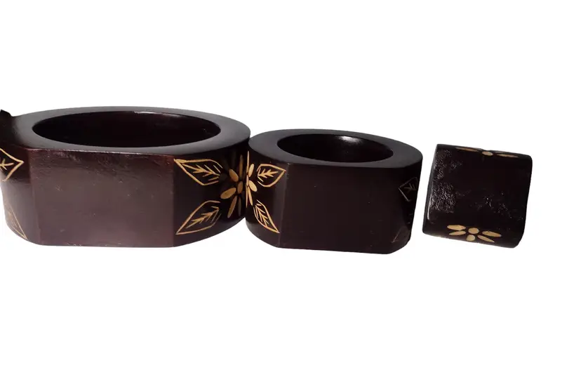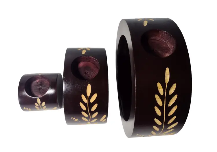 Item is pre-owned and in very good condition with no major flaws. They are a couple micro ding on the very edges, but you can't even really see them at all. Smoke free environment. These are great hand carved wooden round tea light candle holders with 3 graduating sizes. Tallest holder measures 7" long x 6.75" tall x 2.5" wide.
